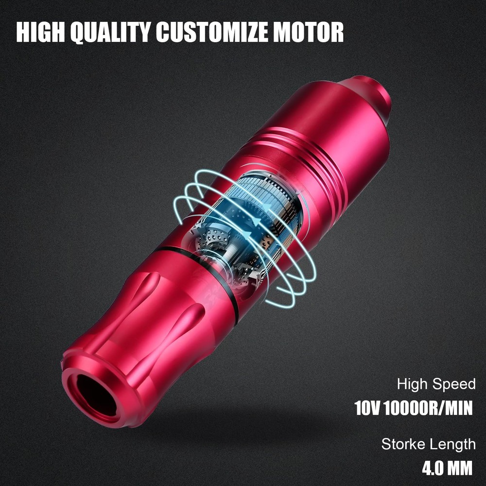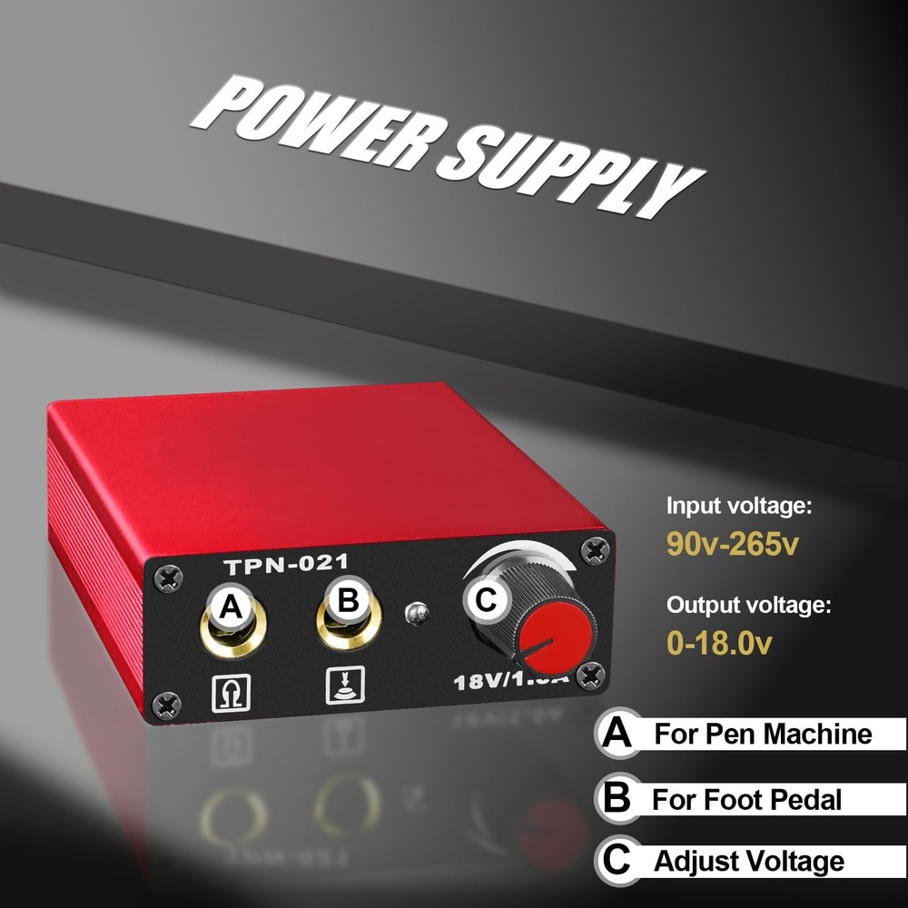 Tattoo Machine, Rotary Tattoo Pen Kit with Power Supply, Foot Pedal & Pigment, 20pcs Cartridge Needles Semi Makeup Practice Kit for Makeup Artists (Red) 【PROFESSIONAL TATTOO KIT】 All supplies have been tested. The needle cartridges are Ethylene oxide (EO) gas sterilized and individually packaged, the rotary pen with the RCA interface runs smoothly and is almost silent. 【ATOMIC FISSION MOTOR】The tattoo supplies kit uses an advanced atomic fission motor, with strong power and low noise, quite easy to handle. The length of the stroke: 0-4mm. We suggest using 6-8V to run the machine which will be more efficient. 【HIGH QUALITY POWER】The power adapts new technology and design, more and safe. With the automatic protection function, when the voltage is too high or abnormal, the power will be automatically cut off and protecting the tool. 【PACKAGE INCLUDE】The tattoo supplies kit contains: 1* tattoo machine, 1*power supply, 1*RCA cord, power cord*1, 1*foot pedal, 10*needle cartridge, 2*transfer paper, 1*rubber gloves, 1*practice skin, 1* grip cover, 10*inks, and 40*ink cups, fulfilling the needs of beginners and masters. 【COLORFUL PIGMENTE】Equipped with 10 bottles of different color pigments to meet all your color needs. Please email us if you have any problems during to use.