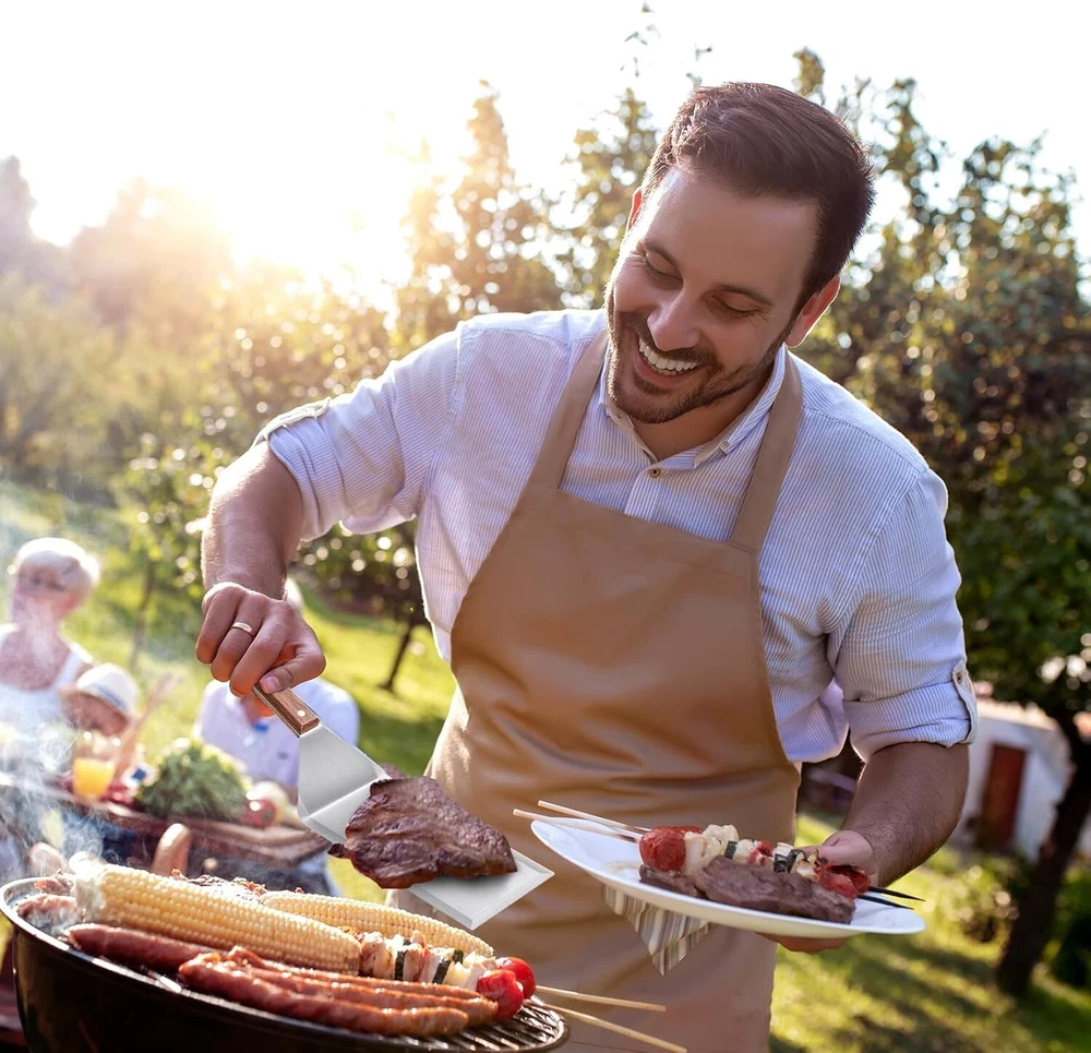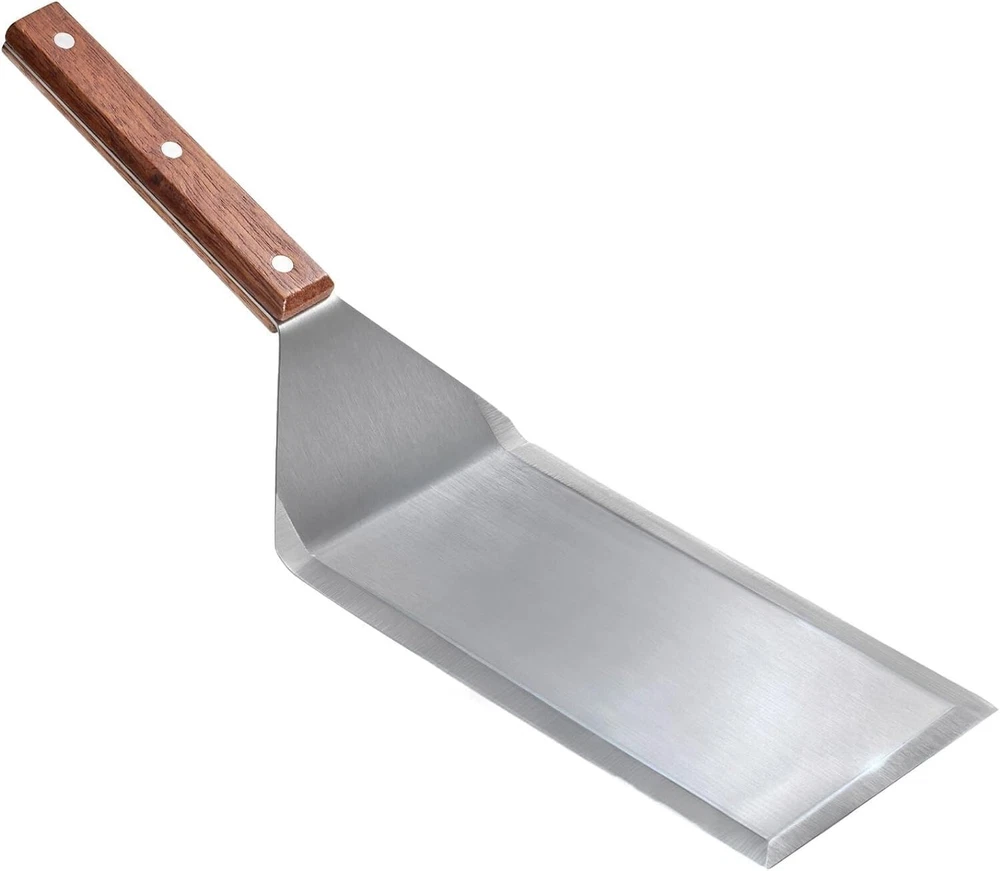 Professional Stainless Steel Grill Spatula with Wood Handle for Skillets, Thick Stainless Steel Blade Griddles & Pancake Flipper for Burgers, Omelet, and Versatile for Culinary Task, 8 x 4 inches ✅ SUPERIOR QUALITY: Stainless steel spatulas are sturdy and great for tasks that require strength, such as flipping pancakes or burgers on a grill. However, they are not flexible like silicone or rubber spatulas. Our wide meat spatula features an 8 x 4-inch flipper to offer ample space for holding more food at once, making it an excellent choice for professional and home use. ✅HEAVY-DUTY STAINLESS STEEL & WOODEN: This wide spatula is stainless steel and features an ergonomically designed wooden handle. The smooth silicone surface and flexible edges of our spatulas make them perfect for scraping, mixing, and spreading. Whether you're flipping pancakes, scrambling eggs, or sautéing veggies, these spatulas will glide effortlessly over any surface without scratching your cookware. ✅BEVELLED-EDGE AND SAFE TO USE DESIGN: This stainless-steel wide spatula with a wooden handle comfortably fits your hand for balance control. The sharp, beveled edge of this grilling spatula helps stir food more efficiently without bending or breaking. This innovative feature allows for precise scraping and effortless flipping, ensuring you get every last bit of food from your cookware without scratching or damaging its surface. ✅DURABLE AND MULTIFUNCTIONAL: Our spatula turner is a versatile kitchen companion. Perfect for grilling, BBQ, and as a griddle accessory for cast iron or flat-top cooking. The beveled edges of our oversized spatula seamlessly slide for quick and easy flipping of a burger, cutting pizza, or serving meat and cakes. Whether you're a grilling novice or a seasoned professional, this spatula is the ideal griddle grilling accessory for backyard BBQs and more. ✅PRACTICAL & IDEAL GIFT OPTION: Whether you're shopping for a culinary enthusiast or upgrading your own kitchen tool. 's metal spatula makes an excellent gift idea for a Birthday, Graduation, Anniversary, Holiday, Father’s Day, Housewarming, and so much more. This wide spatula for grills is dishwasher-safe and features hooks for hanging, storing, and drying. offset flat diner griddle rib grilling