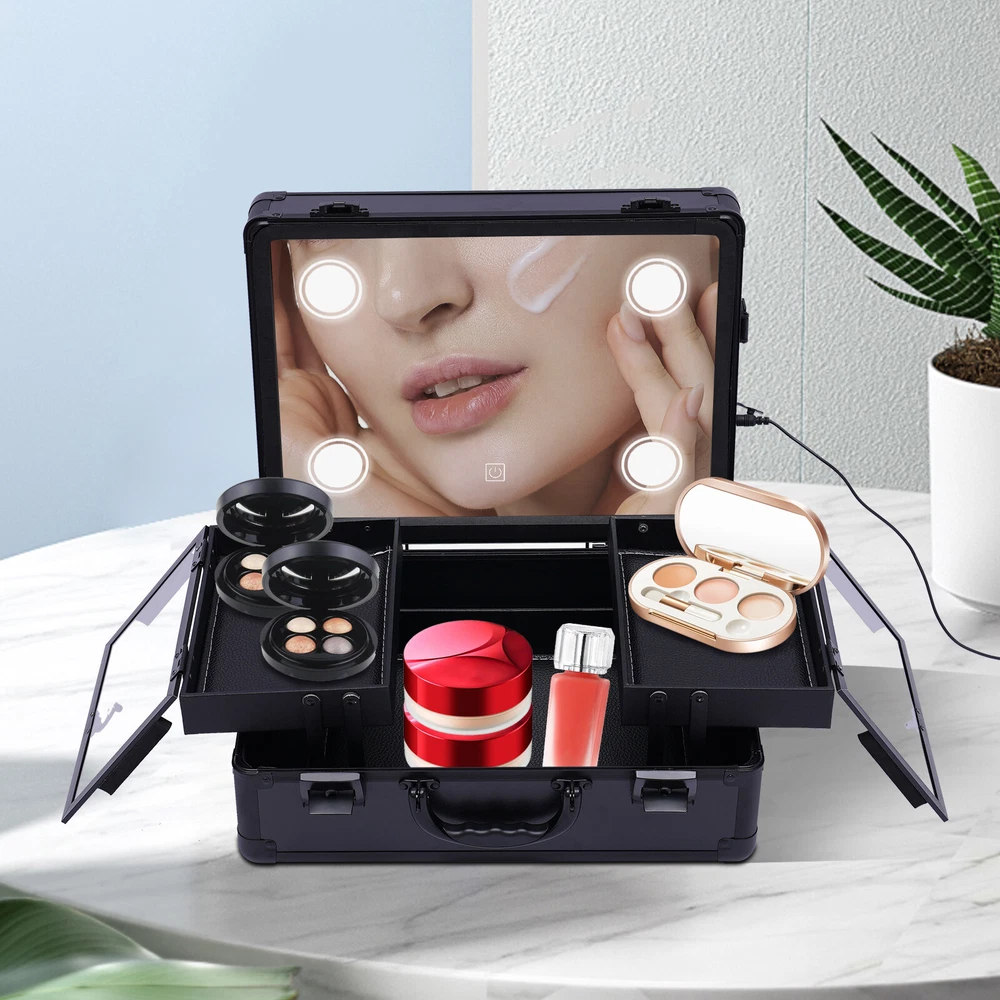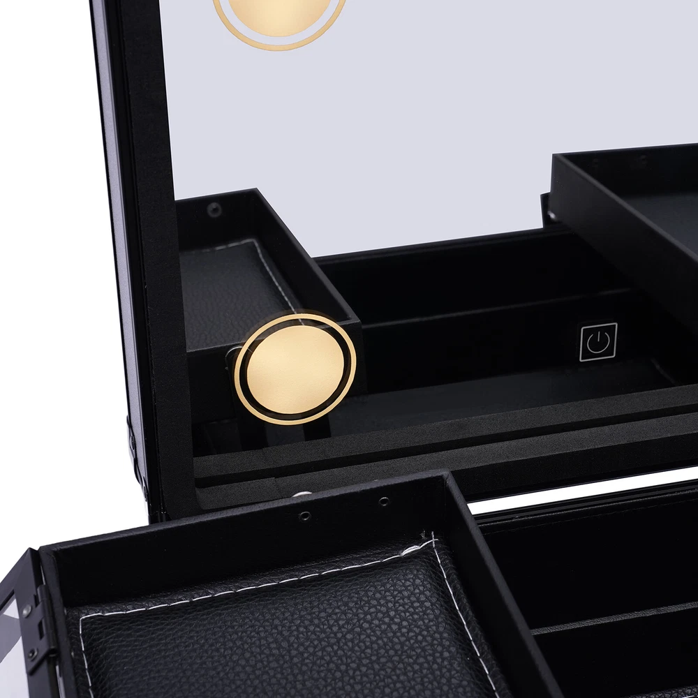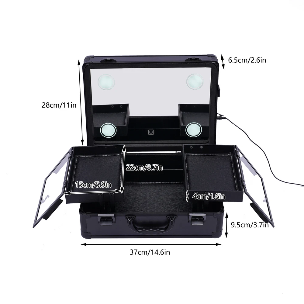 Professional Travel Makeup Train Case Portable Cosmetic Organizer Bag+LED Light Portable Train Makeup Case with 3 Level LED Light Mirror Multifunction w/ Lock Key Features Large Capacity Zoned Storage : It has two layers. The upper layer consists of 2 separate trays of 5.9*8.7*1.6inch for your usual lipsticks, brushes, blushes, etc. The lower layer is a 14.6*11*3.7in a one-piece tray that provides more space for your nail polish, essential oils, foundation, etc, so you can say goodbye to a cluttered desktop. Elegant Look : It is made in black style with all the components matching that color and keeping in line with the specially made handles for an impressive look. Makeup Assistant: It comes with 4 LED lights designed in the corners of the lid and a top mirror. The LED lights can adjust the light color between cold white, warm white and natural light, and the brightness of the makeup lights can be adjusted by touching the screen, allowing you to apply makeup anytime and anywhere. Security Protection : It comes with 2 locks to protect privacy and security during travel. Therefore, it is also suitable for holding watches, bracelets and some other valuables. Considerate Design :This make-up case comes with a 12V rechargeable jack, an external power supply jack, and a power jack. And the power cord can be used for an external curling iron, mobile phone, and hairdryer power when it is powered up to meet your needs while working. High Quality : It is made of high-quality ABS material, which is sturdy and durable, and the metal reinforced corners have good wear resistance . It can be used for many years. Easy to Clean : ABS stain-proof plastic is easy to clean. If the tray gets dirty with cosmetics, just wipe it with a damp cloth and it will be as good as new. Humanized Design : In addition to the makeup fire compartment itself which is closed, the two separate trays on the upper level also have their separate lids, which can effectively prevent dust and stains on your cosmetics. Ideal Gift : This elegant makeup train case is what every girl needs, so it is a great gift for girls. Portable : It is designed as a mini suitcase with dimensions of 5.9*8.7*1.6in and weighs only 6.61lbs. The curved grip makes it easy to hold and carry on your journey. Details Enhanced Corners : Durable aluminum material for long-term use can hold all your daily cosmetics and tools and keep their shape. Glass Lids : The two separate trays on the upper level feature clear glass lids, making it easy for you to be able to find your cosmetics at a glance. 5.91ft Power Cord : It comes with a 5.91ft power cord, allowing you to have plenty of length at your disposal. Therefore, it is more convenient for you to use it. Application This product is suitable for storing cosmetics and skin care products, as well as jewelry, such as necklaces and earrings. Besides, it also can be used in dark places for makeup. Specification Main Material: ABS Color: Black Plug Type: US Light Source: LED Light Color: Cold White, Warm White and Natural Light Voltage: 110-240v, 50-60Hz Power Cord Length: 1.8m/5.91ft Package Size: 40*21*35cm/15.75*8.27*13.78in Top Cover Mirror Size: 37*28*6.5cm/14.6*11*2.6in Bottom Tray Size: 37*28*9.5cm/14.6*11*3.7in Overall Case Size: 37*28*16cm/14.6*11*6.3in Center Tray Size: 15*22*4cm/5.9*8.7*1.6in Gross Weight: 4kg/8.82lbs Net Weight: 3kg/6.61lbs Package Included 1*Makeup Train Case 1* Power Cord Notes Please allow the slight color difference caused by the shooting light and 1-3cm error due to manual measurement, and make sure you do not mind before you order. Dear friend, Welcome to my store . Wish you have a nice day and happy shopping. If you have any questions or more information about promotion, please leave me a message and we will reply to you as soon as possible. Thanks for your patience. Payment Delivery details Terms of sales About us Contact us Payment We accept ebay payment 。 Fees such as import duties, taxes are not included in the item price or shipping costs. These charges are the buyer's responsibility. Delivery details Shipping: 2-9 working days to: USA Terms of sales We maintain high standards of excellence and strive for hundred percent customer satisfaction. Feedback is very important to us. We hope that you contact us immediately before you give neutral or negative feedback, so that we can address your concerns. It is impossible to address issues if we do not know about them! About us Your satis faction is our ultimate goal. We work hard to earn your trust and future business. Our certified technicians have tested each item before shipping. The unit comes with 1 year limited warranty on all manufacturing defects. a) If you receive a defective item, you may return it or ask for a discount. Please contact us within 14 days after you receive the package. b) What you returned must be intact and in its original packaging as re? u. Customer is responsible for shipping costs of the returned item. c) We will cover the cost of shipping back t with the shipping rate indicated in the registration page. We will send you a new unit or refund the full payment you paid. Thank you. Contact us Business Hour Business Hour: Monday To Friday: 8:30 AM to 5:00 PM (Beijing China time) Due to time zones, our reply to your questions may not be immediately. But within above working time, we will reply your email within 24 hours. If it's non-workdays, please kindly be patient and wait till Monday. Please contact us with ebay message. Please feel free to contact us if you have any questions. Monday To Friday: 8:30 AM to 5:00 PM (Beijing China time) Due to time zones, our reply to your questions may not be immediately. But within above working time, we will reply your email within 24 hours. If it's non-workdays, please kindly be patient and wait till Monday. Please contact us with ebay message. Please feel free to contact us if you have any questions. Warranty 10 Years Manufacturer Warranty 10 Years Herstellergaranti