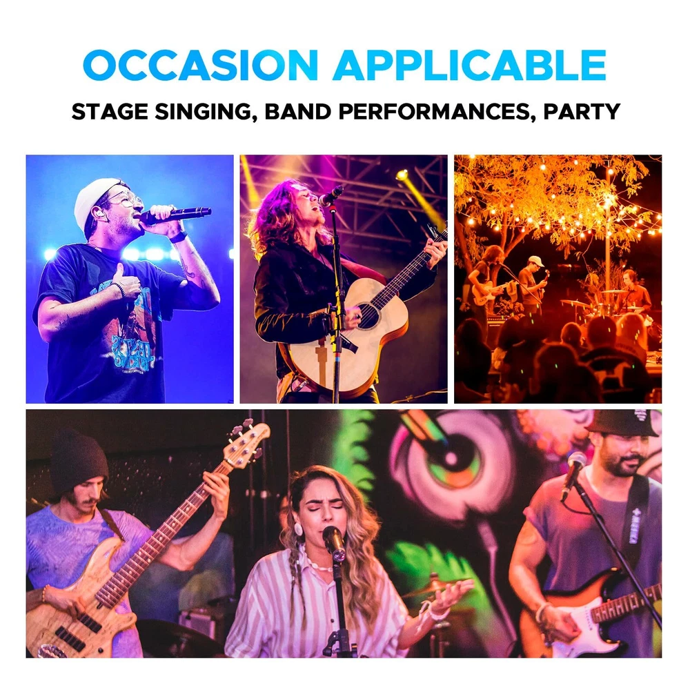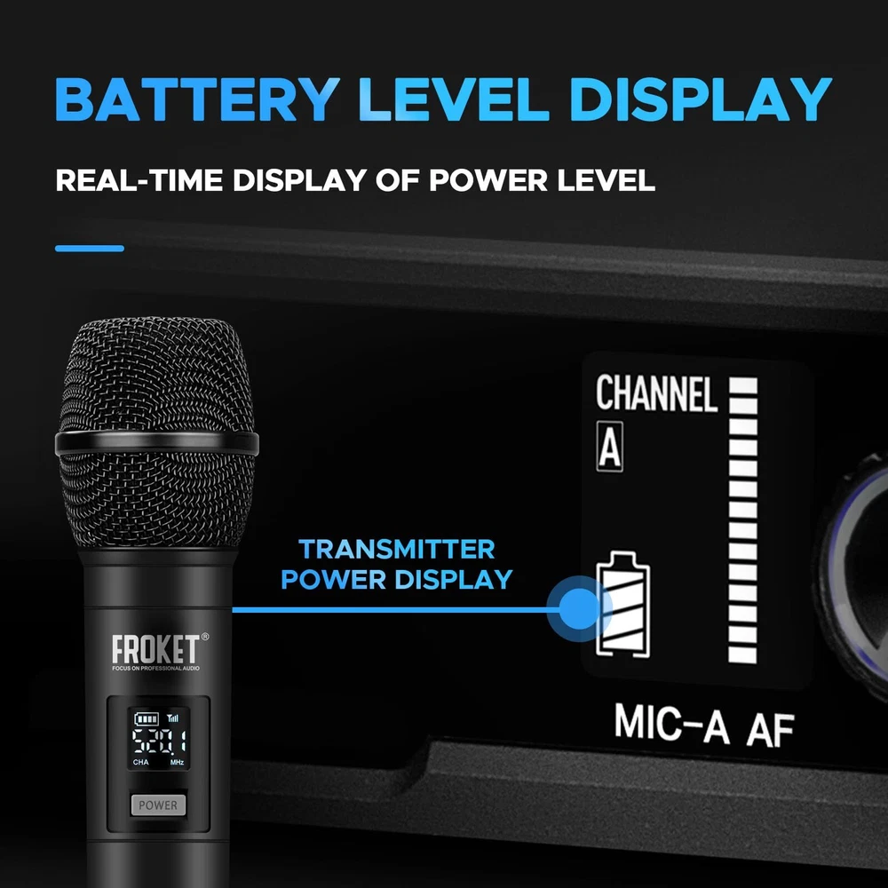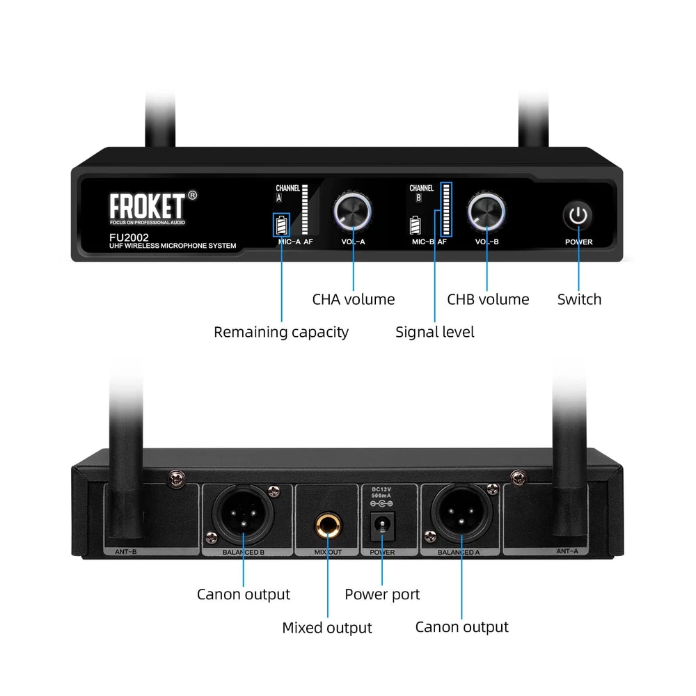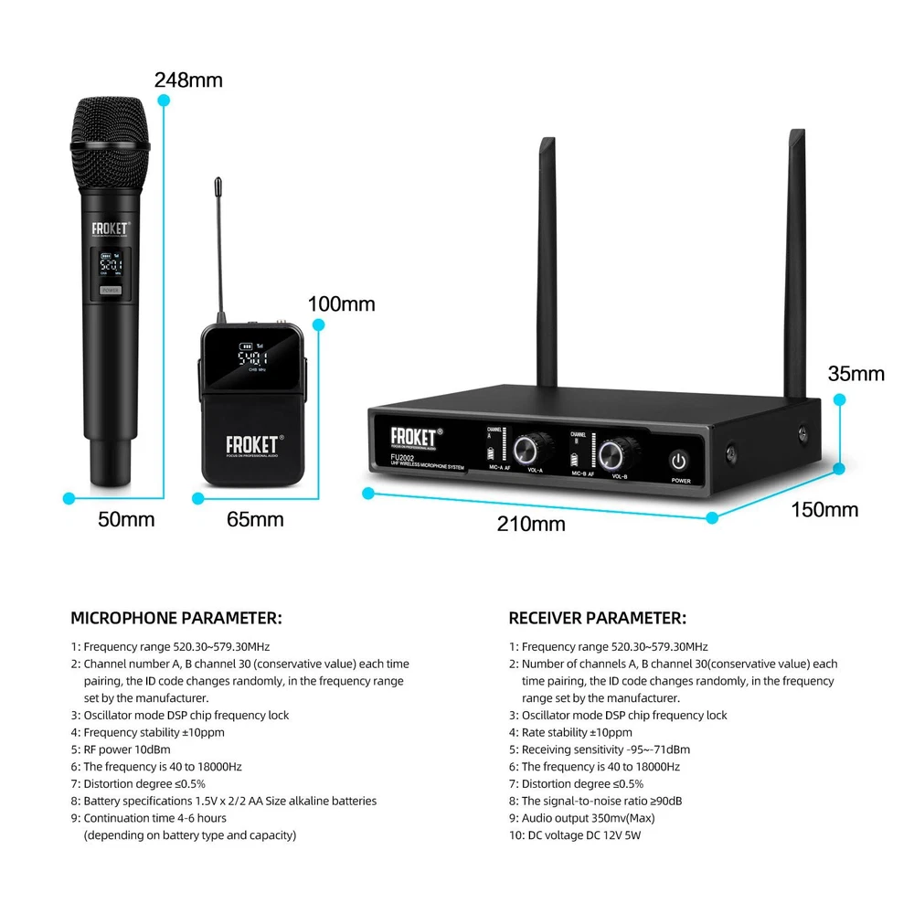 MICROPHONE PARAMETER: 1.Frequency Range: 520.30~579.30MHz. 2.Channel number A, B channel 30 (conservative value) each time pairing, the ID code changes randomly, in the frequency range set by the manufacturer. 3.Oscillator mode DSP chip frequency lock. 4.Frequency Stability: ±10ppm. 5.RF Power: 10dBm. 6.The frequency is 40 to 18000Hz. 7.Distortion Degree: ≤0.5%. 8.Battery specifications 1.5Vx 2/2 AA Size alkaline batteries. 9.Continuation time 4-6 hours(depending on battery type and capacity). RECEIVER PARAMETER: 1.Frequency Range: 520.30~579.30MHz. 2.Number of channels A, B channel 30(conservative value) each time pairing, the ID code changes randomly, in the frequency range set by the manufacturer. 3.Oscillator mode DSP chip frequency lock. 4.Rate Stability: ±10ppm. 5.Receiving Sensitivity: -95~-71dBm. 6.The frequency is 40 to 18000Hz. 7.Distortion Degree: ≤0.5%. 8.The Signal-to-Noise Ratio: ≥90dB. 9.Audio Output: 350mv(Max). 10.DC Voltage: DC 12V 5W. 𝐒𝐭𝐚𝐛𝐥𝐞 𝐖𝐢𝐫𝐞𝐥𝐞𝐬𝐬 𝐏𝐞𝐫𝐟𝐨𝐫𝐦𝐚𝐧𝐜𝐞: Each mic has a top-class cardioid dynamic sound core and upgraded circuit. Transmits sound smoothly. Stable and amazing sound. Ideal for karaoke, parties, etc 𝐋𝐨𝐧𝐠 𝐃𝐢𝐬𝐭𝐚𝐧𝐜𝐞 𝐑𝐞𝐜𝐞𝐩𝐭𝐢𝐨𝐧: Has two high-gain antennas. Stable signal. Anti-interference. Covers up to 260 ft/80 meters. Retractable antennas for storage and portability 𝟐x𝟑𝟎 𝐀𝐝𝐣𝐮𝐬𝐭𝐚𝐛𝐥𝐞 𝐂𝐡𝐚𝐧𝐧𝐞𝐥𝐬: Dual mics in UHF 510-590MHz band. 30 adjustable frequency groups per channel. Select frequencies. No interference. Use multiple groups simultaneously 𝐄𝐚𝐬𝐲 𝐭𝐨 𝐔𝐬𝐞: Once you turn on the wireless mics and the receiver, they'll pair automatically. Moreover, the receiver tracks frequencies. Keep in mind, each mic requires 2 x AA batteries (not included) 𝐔𝐬𝐞𝐫-𝐅𝐫𝐢𝐞𝐧𝐝𝐥𝐲 𝐃𝐞𝐬𝐢𝐠𝐧: The simple and intuitive operation of this microphone set makes it a breeze to use. No complicated setup or technical skills required. Just turn it on and enjoy seamless audio transmission 𝐖𝐡𝐚𝐭 𝐘𝐨𝐮 𝐆𝐞𝐭: Microphone system set contents 1x receiver, 2x bodypack transmitter, 2x lavalier microphone, 2x headset microphone, 1x power adapter, 1x 6.5mm audio cable, 1x user manual. 𝐍𝐨𝐭𝐞: Batteries not included
