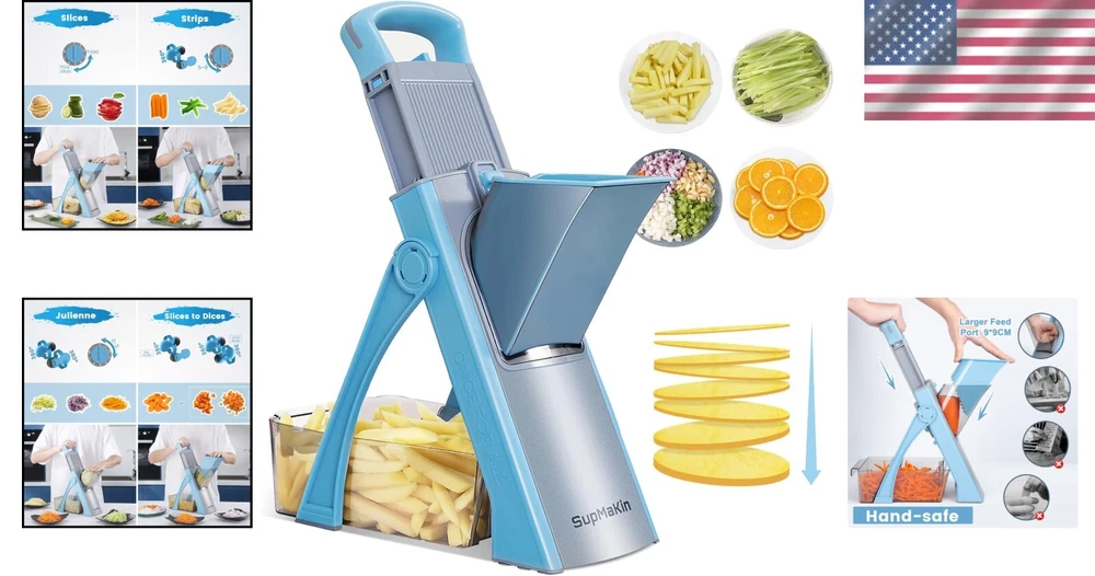 Brand: Unbranded Food Compatibility: Universal, Potato, Sweet Potato, French Fry, Onion, Mushroom, Garlic, Cucumber, Zucchini, Celery, Lemon, Carrot, Apple, Orange, Vegetable, Fruit Number of Items in Set: 1 Blade Material: Stainless Steel Material: Plastic, ABS, Stainless Steel Product Care Instructions: Dishwasher Safe Item Weight: 2.5 lb Features: Adjustable Thickness, With Slicer, Easy Clean, Dishwasher Safe, Multi Functional Making Method: Manual UPC: Does not apply Blade Shape: Square Blade Length: 10 Centimeters Operation Mode: Manual Color: Blue Type: Food Slicer gtin13: Does not apply Product Dimensions: 10"l X 16"w X 13.5"h Set Includes: Slicer, Cleaning Brush
