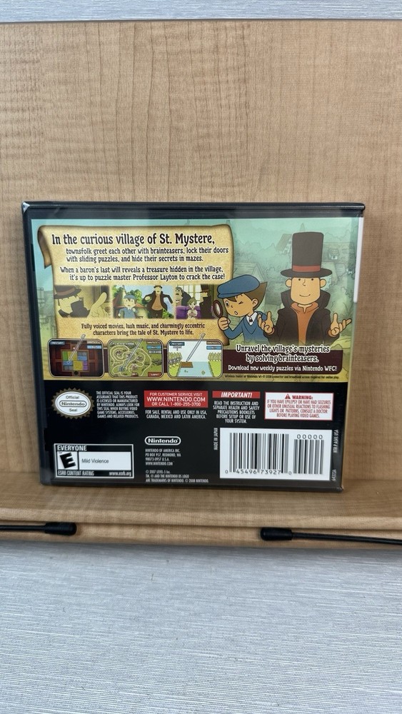 UPC:0045496739270Genre:PuzzleESRB Descriptor:Mild ViolenceVideo Game Series:Professor Layton SeriesCountry of Origin:USARegion Code:NTSC-U/C (US/Canada)Game Name:Professor Layton and the Curious Villagegtin13:0045496739270Release Year:2008Platform:Nintendo DSPublisher:NintendoControl Elements:Gamepad/JoystickRating:E-Everyone