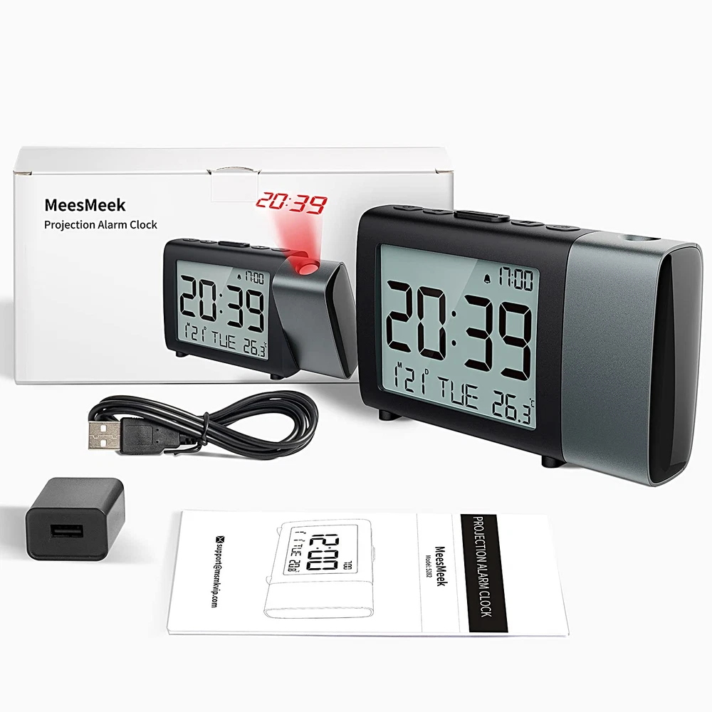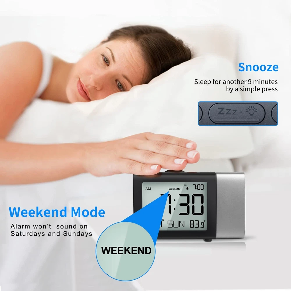 Projection Alarm Clock with Temperature, Calendar, Snooze, Adjustable Backlight, USB and Battery Operated Alarm Clock for Bedroom Ceiling Wall, Power Adapter and USB Cable Included, projector light and focus adjustable. Plug and play. Put aaa battery to backup the alarm clock in case of the power outage. Ultra-Clear Projection - This bedside projection clock projects clear red digits on the ceiling and is easy to read in the middle of the night without having to lean forward to look at the clock. With its 180° swivel projector and full adjustable focus ring, the projection distance range is 1.64-11.4ft (0.5-3 meters), perfect for any of your room Multi Display Clock - 3.9 inch LCD Screen displays Clock Time, Alarm Time, Calendar Date, the Day of the week, and Temperature. 12H/24H Time Format Selectable. 4-level brightness adjustable backlight for easy time reading at night Time Projection Adjustable - Projection brightness 4 levels; the numbers can be flipped upside down to read time upright regardless of pointing directions; focus ring to adjust the numbers clear and sharp to see at a distance USB and Battery Powered - To keep the projections and backlights work, 5V 1A power adapter and micro usb cable are required and included. Simply plug and play. The basic alarm clock function can be also powered by 3 of AAA batteries (not included). When inserted with batteries, it still trigger the alarm during power outages, and you do not need to reset time. Never worry about missing any important meetings Weekend Mode - When you schedule the alarm and turn the Weekend mode on, the alarm will only sound from Monday to Friday, and won't sound on Saturdays and Sundays. Save you the hassle of turning on/off the alarm before or after weekends 9 Minutes Snooze - For those who needs an extra 9 minutes to start a fresh day, simply press the "Snooze" button at the top of the clock 【Warm Tips】Before use, please insert 3 AAA batteries as backup to avoid resetting the clock in case of power failure. 1) When powered by battery, the ceiling projection and backlight will go off in 5 seconds to save power. If want them always on, please keep it plugged. 2) If them not always on even plug in, please check whether the USB cable are not in good or not plugged in tightly 【Projection Tips】1) Why the projection is upside down? - Press and hold the projection button for 3 seconds to flip the projected image over. 2) Why is the projection blurry? - Scroll the focus wheel on the back of the clock to adjust the sharpness of the projected image