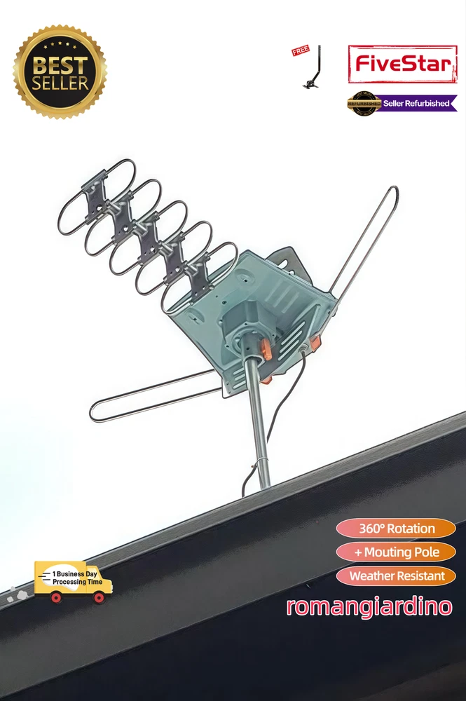 🔧 32 ~ 36dB 360° UV Dual-band Outdoor Antenna: The Perfect Choice This outdoor antenna is engineered for exceptional performance, crafted from high-quality materials with advanced technology. Its compact design makes it easy to integrate with your setup, while the sturdy and eco-friendly construction ensures durability. Whether you're sending or receiving signals, this antenna delivers strong connections and hassle-free operation. Don’t miss out on this ideal solution for your signal needs! 🌟 Key Features: Durable Construction: Made from high-quality, long-lasting materials. Portable Design: Lightweight, compact, and easy to carry. Gift-Ready: Comes in attractive gift box packaging. Perfect Fit: Designed to complement your device seamlessly. Convenient Setup: Includes an adaptor, excludes the pole. Reliable Performance: Easy to operate and install with great connectivity. 📊 Specifications: Frequency Range: VHF 40 ~ 300MHz, UHF 470 ~ 890MHz Noise Figure: ≤ 2.5dB Antenna Gain: VHF 28 ~ 32dB, UHF 32 ~ 36dB Reception Range: Up to 150 miles Channel Capacity: 1 ~ 69 Impedance: 75 ohm Max Output Level: 105dBμV Power Supply: AC 110V/60Hz Operating Temperature: -10°C ~ 50°C Coaxial Cable Length: 40ft (10m) Weight: 63.85oz (1810g) 📦 Package Includes: 1x HDTV Antenna with built-in rotor & amplifier 1x Rotor Control Box 1x Remote for Rotor Control Box 1x 40ft Coaxial Cable J-pole 🚫 Not Included: 4-way Splitter Make the smart choice today with this top-tier outdoor antenna!