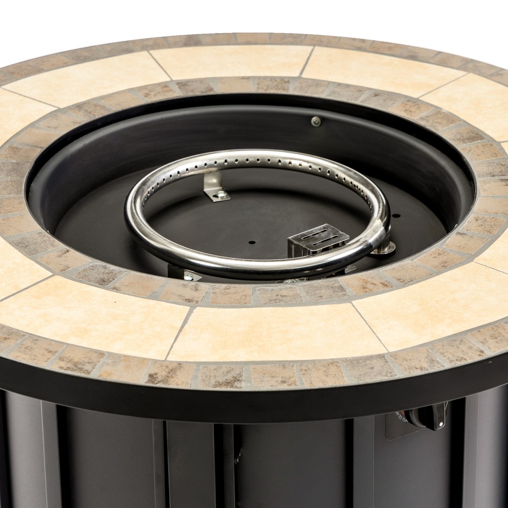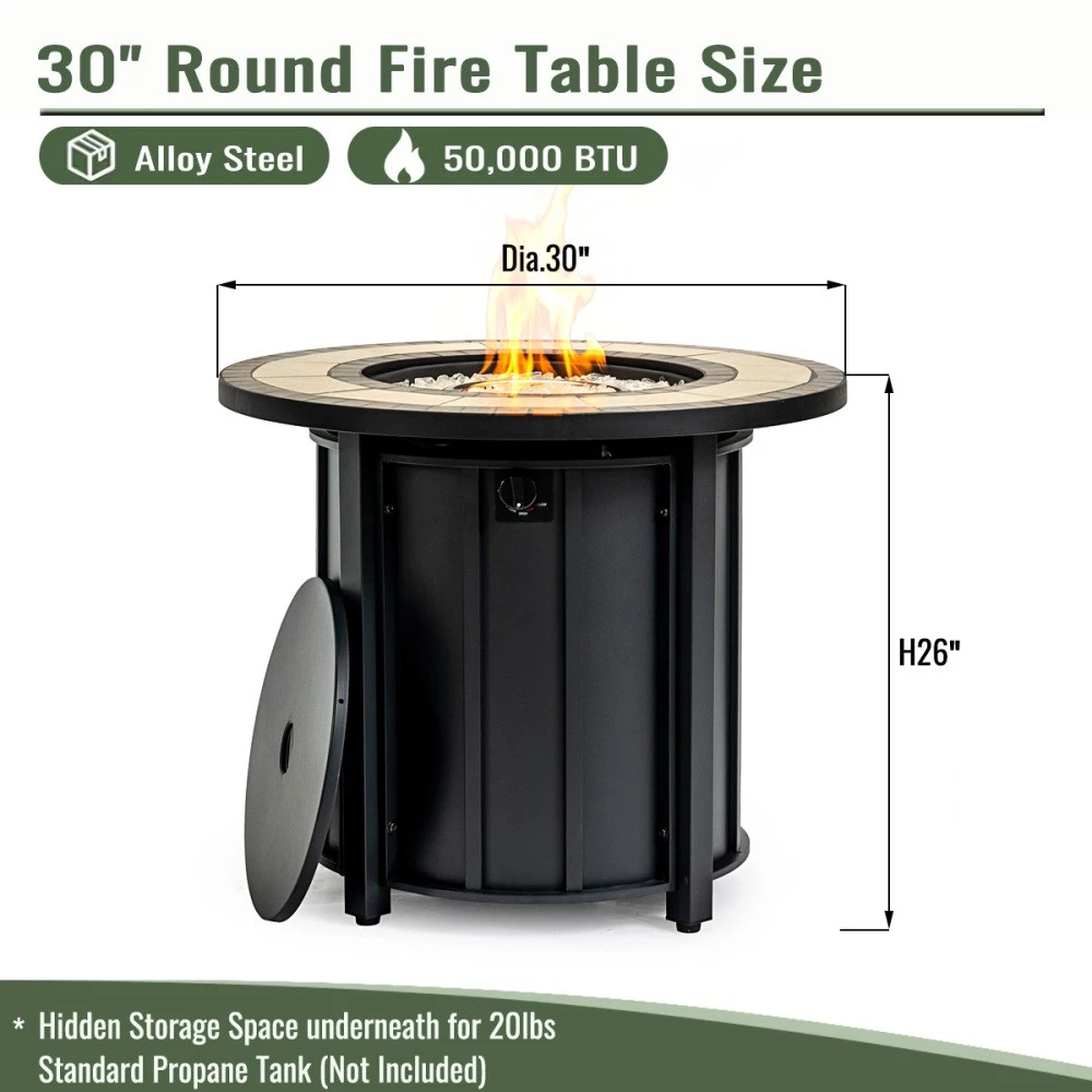 30" Propane Gas Fire Pit Table, 50000 BTU Round Steel Fire Pit with Mosaic Ceramic Tabletop for Outside Patio Deck Garden Backyard - Black đ„ Hot Deal Alert: Stylish Warmth for Your Outdoor Space đ„ Elevate your patio, deck, or backyard gatherings with our 30-inch Propane Gas Fire Pit Tableâwhere luxury meets functionality. Boasting a 50,000 BTU high-performance burner, stunning mosaic ceramic tabletop, and durable steel construction, this fire pit is designed to turn cool evenings into cozy memories with family and friends. âš Key Features That Stand Out Stylish Mosaic Design & Multifunctional Use : The eye-catching black and brown mosaic ceramic tabletop isnât just a feast for the eyesâit doubles as a practical outdoor coffee table when the included lid is in place, perfect for holding drinks, snacks, or decor. Glass stones included enhance the flameâs glow, casting a dreamy, inviting ambiance for any occasion. Weather-resistant tiles ensure this piece stays beautiful through rain, sun, and more. 50,000 BTU Efficient & Smokeless Heating : Say goodbye to smoky eyes and messy ashes! Our high-performance burner delivers consistent, powerful heat that warms your space quickly without the hassle. Whether itâs a crisp autumn bonfire or a winter night under the stars, this fire pit keeps you comfortable all season long. Durable Steel Build & User-Friendly Design : Crafted from premium fire-resistant steel, the main body is built to last for years of outdoor use. A side access panel makes connecting a standard 20-lb propane tank (not included) a breeze, while cleverly hiding the hose for a clean, sleek look. Automatic ignition and an adjustable flame knob let you control the heat with just a push and a turnâno complicated setup required. Portable & Weather-Protected : Weighing 75 lbs with a convenient 30âx30âx26â size, itâs easy to move to your preferred spotâwhether by the pool, on the deck, or in the garden. The included waterproof rain cover shields it from wind, rain, and UV rays, ensuring long-lasting performance and keeping it ready for your next gathering. đ Specifications Category Details Assembled Dimensions 30.00â (L) x 30.00â (W) x 26.00â (H) Product Weight 75.00 lbs Package Dimensions 32.70â (L) x 32.70â (W) x 11.00â (H) Package Weight 84.00 lbs Material Premium Steel with Mosaic Ceramic Tabletop Color Black + Brown BTU Output 50,000 BTU