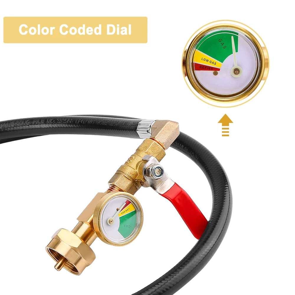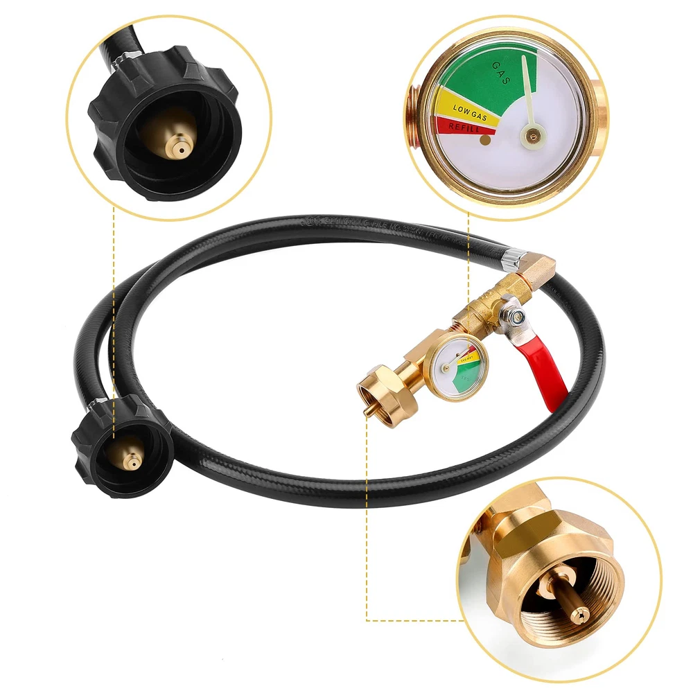 【4 Feet Propane Refill Hose】Propane Refill Adapter Hose is great for refilling your small 1lb propane cylinders with big tanks. Compared with other propane refill hoses,our adapter hose is much longer (48 in/ 4 FT), making it easier and more convenient to connect tanks without moving or carrying them. Ideal for camping, tailgating, heating needs or having an outdoor cooking. 【Premium Material】Our propane refill adapter for 1 lb tanks is made of high quality rubber and solid brass to ensure secure connection and withstand weather, scratching, denting and corroding, more flexible and durable to maintain long-lasting good performance. Hose pressure: 350 PSI. 【Easy to Install and Control】Easy install by connecting the side with QCC1 connection to 20-50 lb propane tanks and then the other side with control valve to 1lb small cylinders. With valve for easy control of refilling process and preventing leaking when not use. Please note to open gas for a few minutes before connecting to small cylinder, or it won’t start the refilling due to overflow protection. 【Upgraded With Gauge For Accurate Reading】Specially designed with a gauge at the side connect with 1 lb propane tank, our propane refill adapter hose allows you to read and monitor the gas volume in your 1 lb propane cylinder more accurately than using any other propane hose with gauge at the QCC end. Luminous pointer and gas level indicator make it easy to read even in the dark. 【Additional 1 LB Propane Bottle Caps】Come with 2x 1 LB propane bottle caps, which are useful for your camping stoves, home applications, barbecue, propane heater or others equipment that use 1 lb propane tank. You don't need to spend extra money to buy the caps.