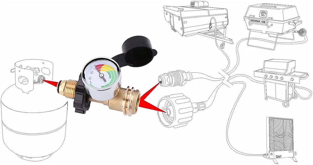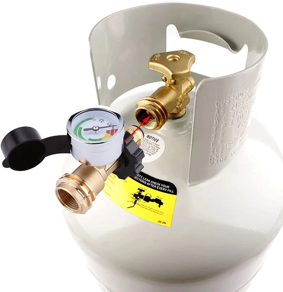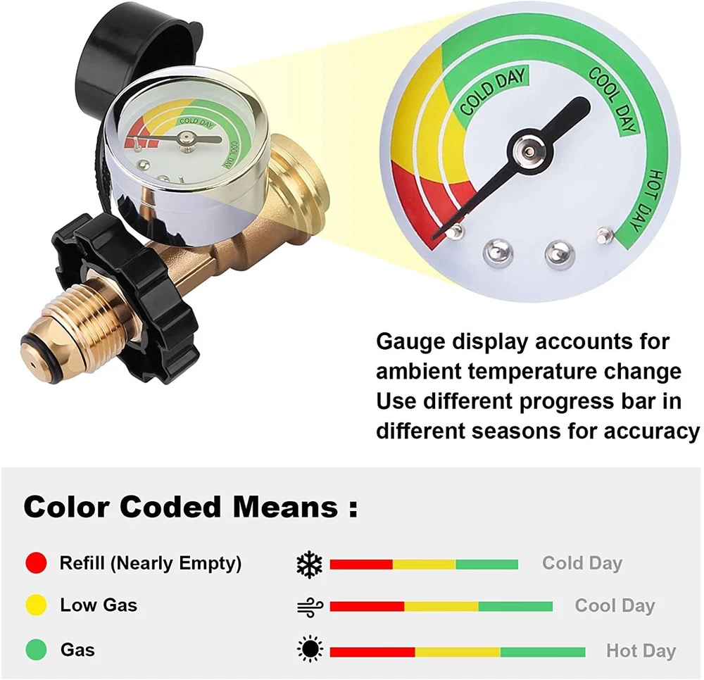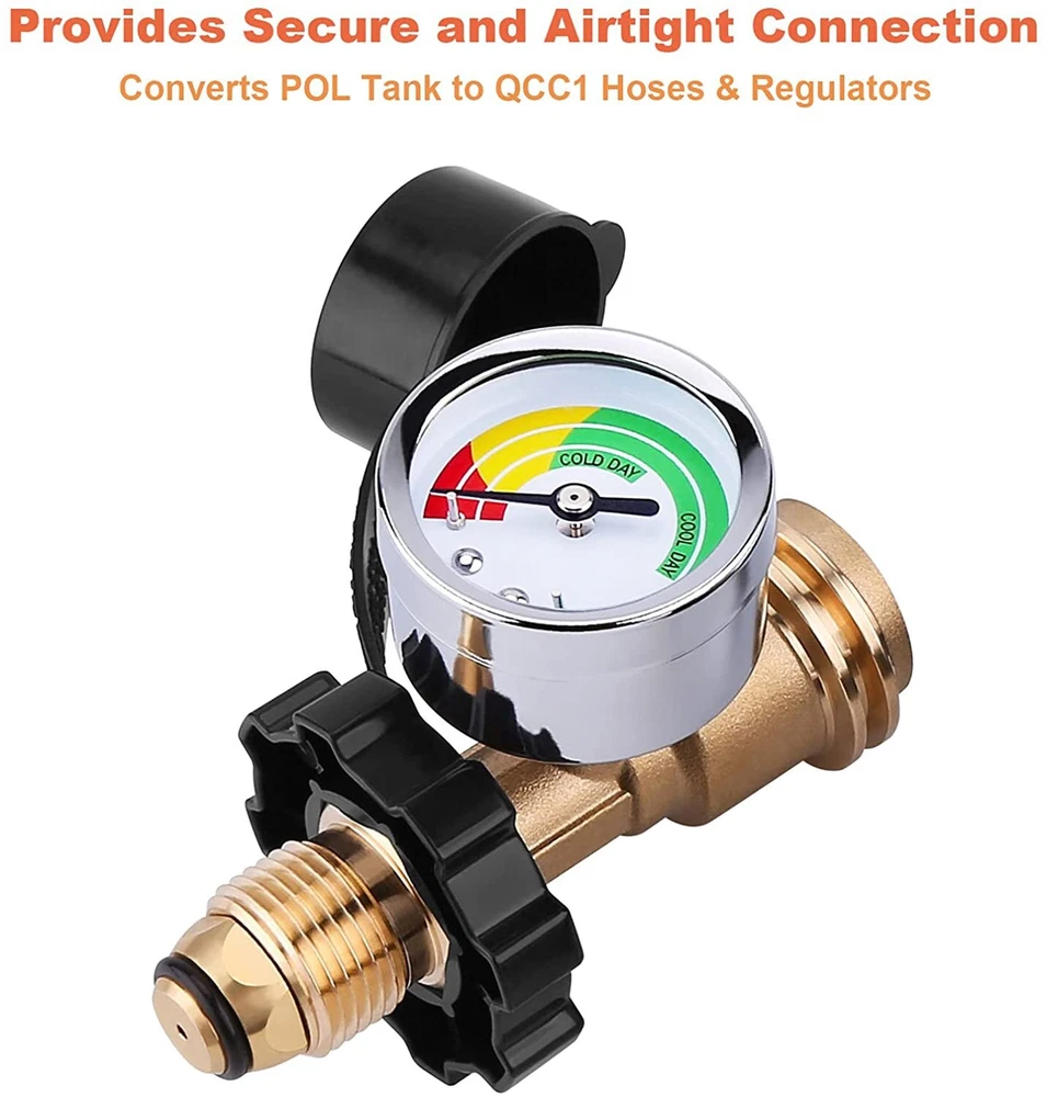 2 Pack Propane Tank Adapter with Upgraded Propane Tank Gauge, Converts POL LP Tank Service Valve to QCC1 / Type 1, Old to New Connection Type 2 Pack Propane Tank Adapter: Converts POL LP Tank Service Valve to QCC1 / Type 1 (Old to New Connection Type) Upgraded Gauge: WADEO propane tank gauge can detect leaks and read fuel level at glance by the color coded dial outside. No need to install an extra gas gauge. The upgraded gauge can display ambient temperature change, which provides an accurate idea of how much propane remains. High Quality Material: This propane tank adapter with gauge is made of 100% solid brass, the brass construction make it not easily to break, durability to provide you with long service time, secure link and prevent leaks. Appliance: This propane tank gauge can be used for 5-100lb POL LP propane tank and propane appliances. Great for using gas grill, heater, smoker, camp stove, lantern, tabletop grill, fire pit table, turkey fryer and more propane appliances. Easy to install: No tools required, and it comes with handheld grip for tightening and dust cover included. Color Coded Dial The color coded dial of gas tank gauge can display accounts for ambient temperature change and detect dangerous leaks . Red: Empty Yellow: Low Green: Sufficient Solid Brass Material This propane tank adapter with gauge is made of 100% solid brass, the brass construction make them not easily to break, durability to provide you with long service time, secure link and prevent leaks. Application This propane tank gauge can be used for 5-100lb POL LP propane tank and propane appliances. Great for using gas grill, heater, smoker, camp stove, lantern, tabletop grill, fire pit table, turkey fryer and more propane appliances. How to Detect Leaks To use it as a leak tester, you turn off all propane appliances, open and close the tank, then wait a while to see if the pressure goes down. If it does, you know you have a leak. NOTE: Will not read levels immediately: Begins working when propane is flowing. Warning!!! For your safety all propane appliances like gas grills, lanterns, heaters and stoves are outdoor use. Fully tightened at both propane tank side and grill side before using on your propane appliances to prevent leakage.