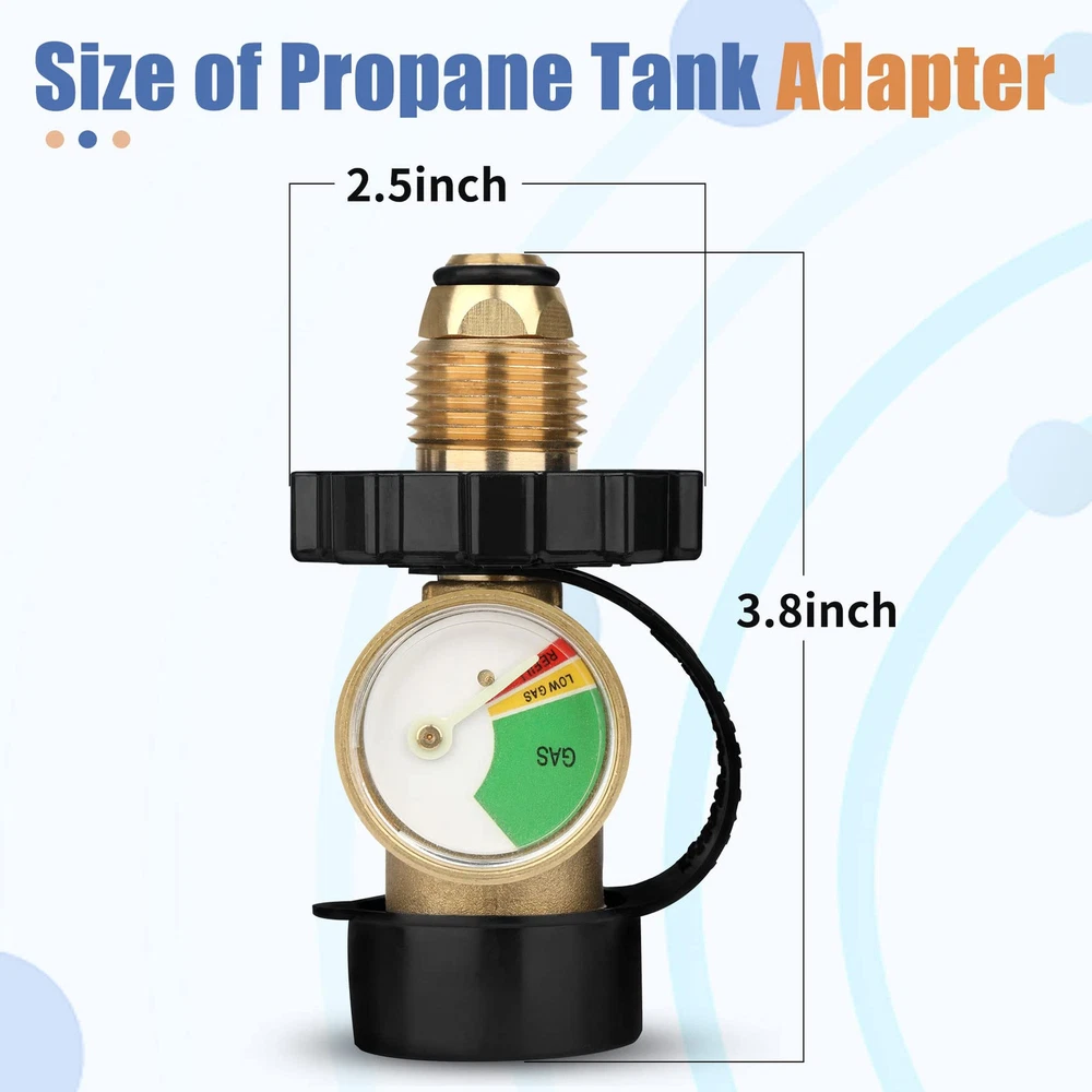 UPGRADED VERSION: This propane tank gas gauge can convert your old style connection type propane tank to new type (type1 / QCC1), converts POL LP Tank to QCC1/Type1 hose and regulator. QUALITY MATERIALS: Propane tank adapter are constructed of solid brass to withstand weather, scratches, dents and corrosion, providing you with long service life, secure connections and protection from leaks. LUMINOUS DIAL GAUGE: The gas tank gauge can detect dangerous leaks and read fuel level at glance by the color coded dial outside.This propane adapter is sealed well to ensure your personal safety when using it to split gas. EASY TO INSTALL: No tools are required and can be easily installed by handwheel handle to tighten. Quite easy to install and use WIDE APPLICATIONS: Propane tank adapter with gauge are perfect for use with gas grills, heaters, smokers, camping stoves, lanterns, tabletop grills, fire pit tables, turkey fryers and many more propane appliances.