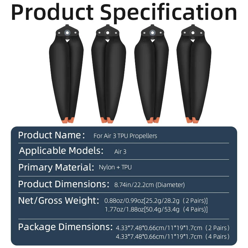 Product Description If you have any questions, please contact customer service first, do not open disputes easily, thank you! Feature: 1. High toughness material, high aerodynamic efficiency; 2. low power consumption, high endurance; 3. Classic quick release design, press and rotate, one second quick installation; 4. Precise measurement of open mould to build. Specification: Material: Nylon+TPU Applicable models:For DJI Air 3 Color: Orange Net weight: 0.88oz(25.2g)(2 Pairs) Package weight: 0.99oz(28.2g)(2 Pairs Product size: 8.74in(22.2cm)(diameter) Package size: 4.33*7.48*0.66cm(11*19*1.7cm)(2 Pairs) Packaging includes: 2 pair*Propeller Note: 1.Does not include Air 3, 2.Transition: 1cm=10mm=0.39inch, 3.Please allow 1-3mm error due to manual measurement. please make sure you do not mind before ordering, 4.Due to the difference between different monitors, the picture may not reflect the actual color of the item,please make sure you do not mind before ordering, Thank you! About Us We accept all payments authorized by eBay. About Us We accept all payments authorized by eBay. powered by On Mar 1, 2024 at 09:32:33 PST, seller added the following information: