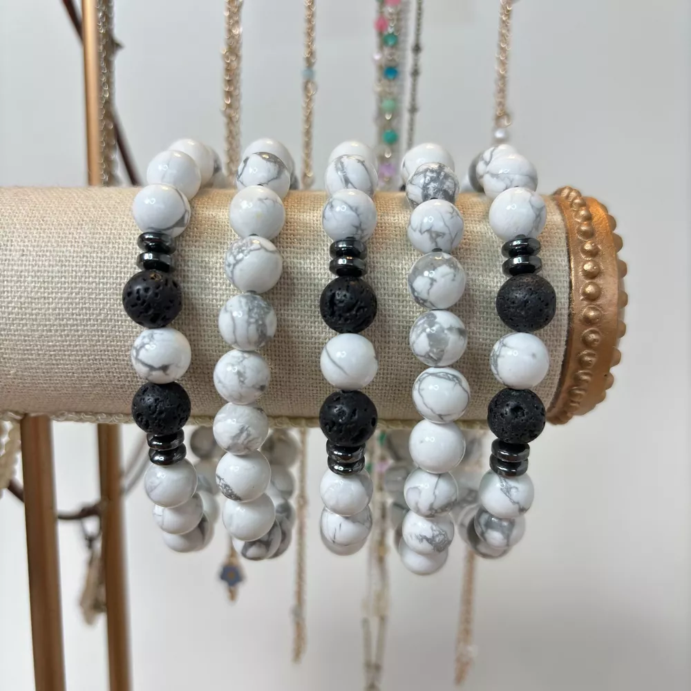 Protective Bracelet Set of 4 - Black Obsidian, White Howlite, Lava Rock, Tiger Eye Bracelets This listing is for 4 (FOUR) Protective Bracelets featuring natural obsidian, white howlite, lava rock, and tiger eye. FAST & FREE DOMESTIC SHIPPING Embrace strength, calm, and balance with this set of 8mm beaded protective bracelets, each designed to bring unique benefits for mind and spirit. Set Includes Black Obsidian Bracelet: Known as a stone of protection, Black Obsidian is believed to shield against negativity and provide emotional stability. White Howlite Bracelet: Thise calming stone is vlaued for reducing anxiety and encouraging a peaceful mind. Lava Rock Bracelet: Known for promoting courage and focus, Tiger Eye is also thought to protect against negative energy. Key Features: Bead Size: 8mm natural gemstone beads Bracelet Type: Stretch elastic bracelet for a comfortable fit Size: Approx, 7.5" around, stretches for a perfect fit Uses: Meditation, crystal healing, energy work, or daily wear Benefits: Stability, clarity, and grounding energy Perfect for anyone interested interest in a thoughtful gift for a loved ones or a meaningful addition to your personal collection. Please note: Each bracelet is made from natural stones, slight variations in color or texture add to the uniqueness of each piece. Disclaimer: Information regarding crystal properties is based on traditional sources and is not intended as a substitue for professional medical advice. For health concerns, please consult a licensed healthcare provider.