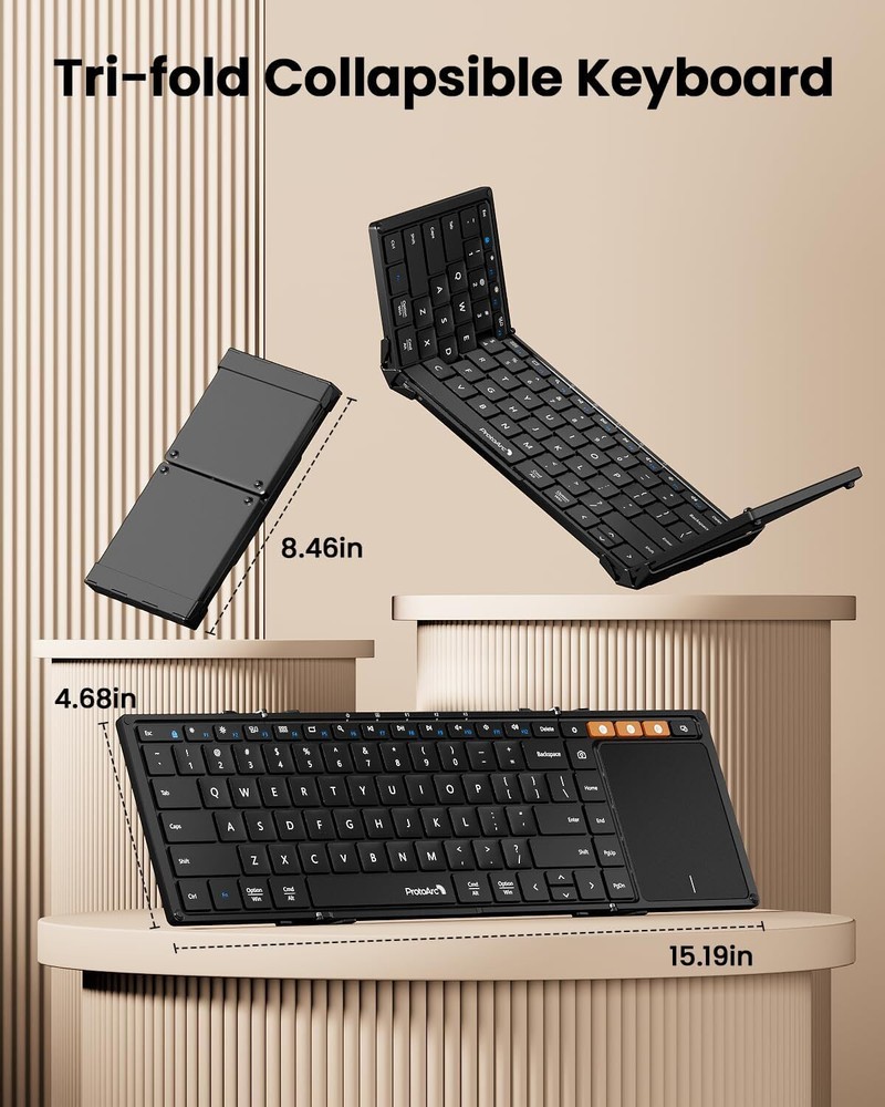 Product Description 【Foldable Keyboard with Trackpad】 This portable keyboard has a multi-touch trackpad that perfectly adapts to Win or IOS system, with various trackpad gestures, providing a comfortable usage experience while clicking, scrolling, and swiping through content effortlessly. Very convenient for your typing, watching, working, and carrying without a mouse needed.(Note:for iPad and iPhone users, please turn on the "AssistiveTouch" function on your device first) 【Tri-fold Bluetooth Keyboard】Our bluetooth travel keyboard is designed in tri-fold and compact enough for carry. 88-key standard full size keys with QWERTY layout, trackpad and entire row of shortcut keys, you can type quickly and accurately on a laptop-like keyboard, making your work easier and more productive. 【Portable for Travel】 The collasible keyboard can folds into a small size(8.46 x 4.68 x 0.78 inch) for taking on the go.Come with phone stand and small PU leather bag specially designed for this keyboard.It effortlessly fits into your handbag, can be an ideal companion for your travels, coffee shop visits, business trips, flights, and more. 【Multi Device Connection】 3 Bluetooth 5.1 channels providing user-friendly workflow solutions. Suitable for small mobile devices such as iPad iPhone Steam Deck or Android phones and tablets, also works well on desktop devices such as laptops, computers with bluetooth.Compatible with Android, Windows, iPad OS, Mac OS, iOS, etc. 【Type C Rechargeable】 The fold up keyboard have a built-in powerful 300mAh battery, allows standby time lasts 120 days. It will enter sleep mode after 60 minutes of inactivity to save power, you can press any key to activate and use. When not in use,fold up the keyboard to turn off(unfold to power on). 【12 Multimedia Shortcut Keys】With a full row of shortcuts to adjust brightness levels, volume or change your music with one tap.Press Fn+ESC key to activate the FN functions, you can perform F1 ~ F12 functions to increase your workflow and productivity greatly(Note: Press Fn+ESC to Turn on/Turn off the Fn functions) About Us We are a reputable seller with many years of experience selling on eBay. Our goal is to provide high-quality products and excellent customer service. Shipping Items will be shipped within 1-3 business days when we received payment. (Orders are not processed on weekends & holidays) Tracking information will be sent once item is shipped. Delivery time depends on destination and other factors Item is shipped to ebay address. Leaving correct address can minimize delay. For international shipping and shipping to Guam, Hawaii and Alaska, Please contact us before placing the order. International buyers please note: Import duties, taxes and charges are not included in the item price or shipping charges. These charges are buyer’s responsibility. We will try our best to reduce the risk of the custom duties. Local pick-up is unavailable at the moment. Contact Us We reply any email messages within 1 business / working days(off-duty at weekend). If you do not get a response from us, then please check your junk or spam mailbox. Our Business hours: Mon-Fri 9:00-18:00, UTC/GMT +8 hours. Please contact us either by clicking "contact seller" in the "purchase history" section or simply click "ask a question" at the bottom of this page. If you are unsatisfied with our item or service, please contact us before leaving any feedback. We are committed to resolve all issues in a friendly and satisfactory manner.