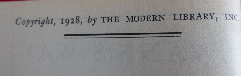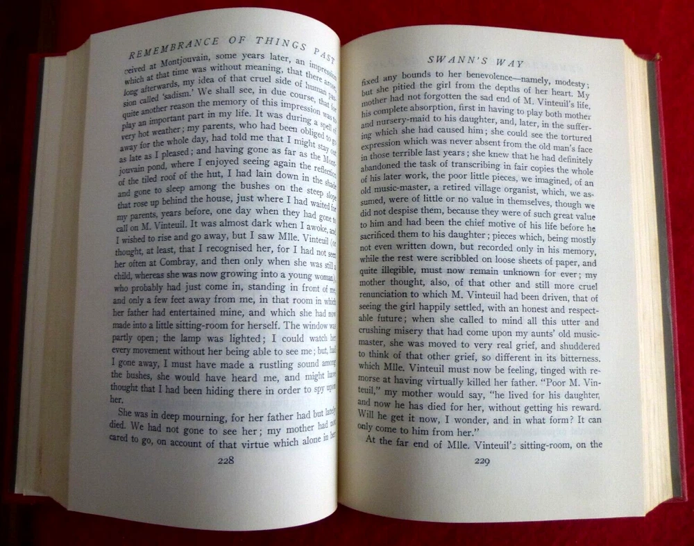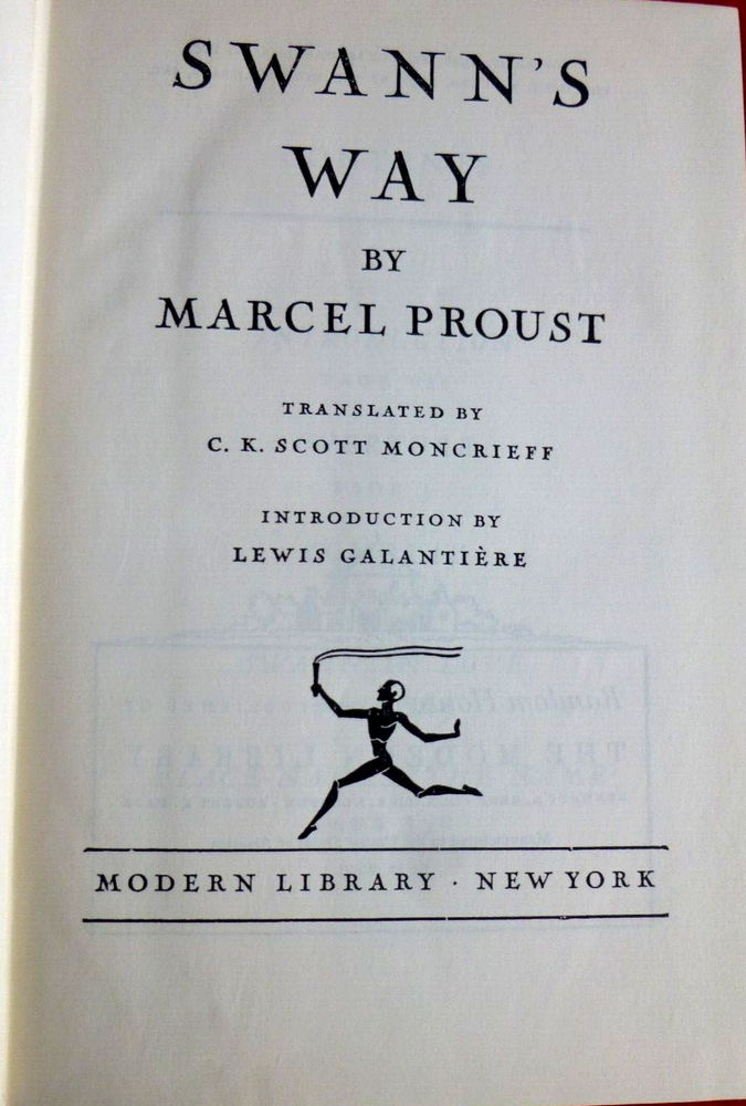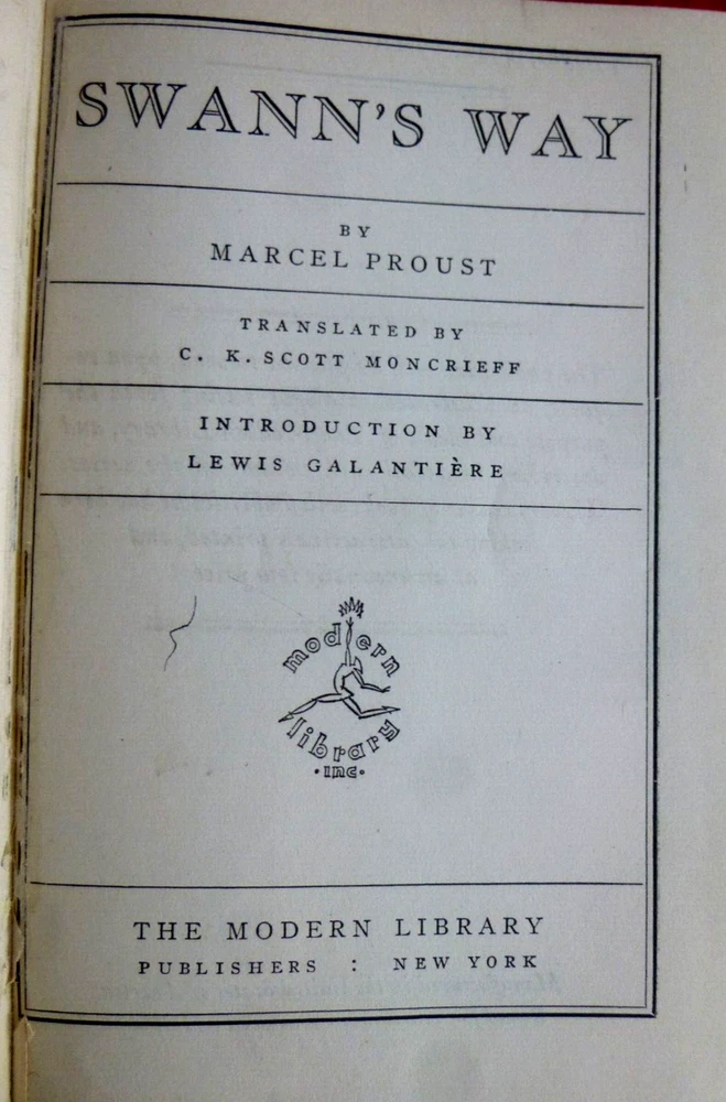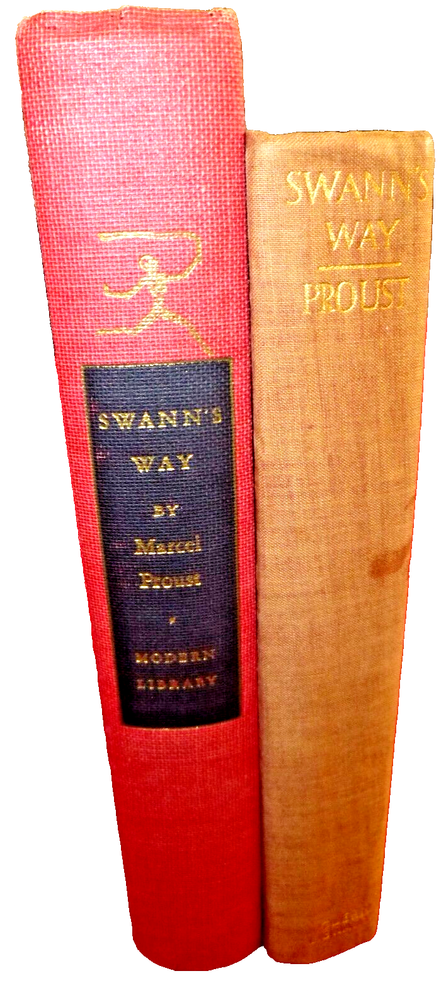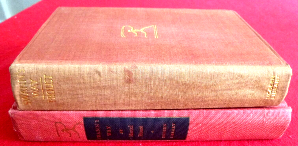 Marcel Proust - Swann's Way; trans. C K Scott Moncrieff; intro. Lewis Galantiere; Modern Library; NY. First volume - copyright 1928. Binding 6 (1930); Toledano # 59.2. wine color balloon cloth. Rockwell endpapers. Ex Libris fixed front endpaper. Fading to spine, gilt blind stamped torchbearer front board. Pages clean, very good condition. Second volume - copyright 1956. Binding 8 (1939-63). Tol. # 59.2. this printing Spring, 1941. Excellent condition. Please visit my Ebay sites: FINE ART PRINTS - https://www.ebay.com/usr/rufus1226 BOOKS - https://www.ebay.com/usr/judefe16 https://www.ebay.com/usr/judefe-65 https://www.ebay.com/usr/j18-jule https://www.ebay.com/usr/judefe14 RECORDS - https://www.ebay.com/usr/juledefelice_0 STAMPS AND STUFF - https://www.ebay.com/usr/judefe-8