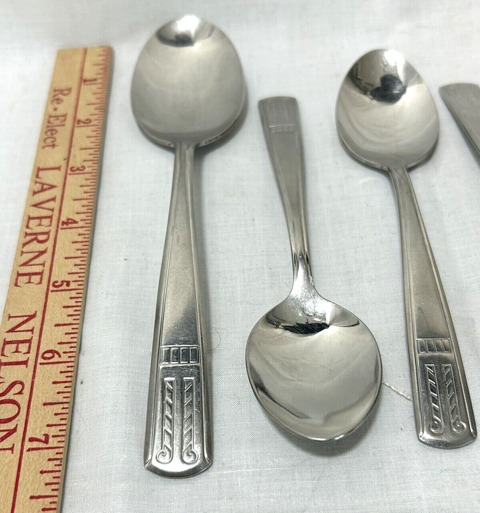 Add a touch of sophistication to your dining table with this elegant stainless flatware set from Elégance. Crafted with high-quality materials, this set includes 1 tablespoon and 5 teaspoons. The geometric handle pattern adds a unique touch to this classic silver set. This flatware group is a perfect addition to your set. Impress your guests with this glossy finish set that is sure to last for years to come.