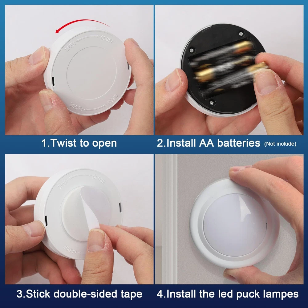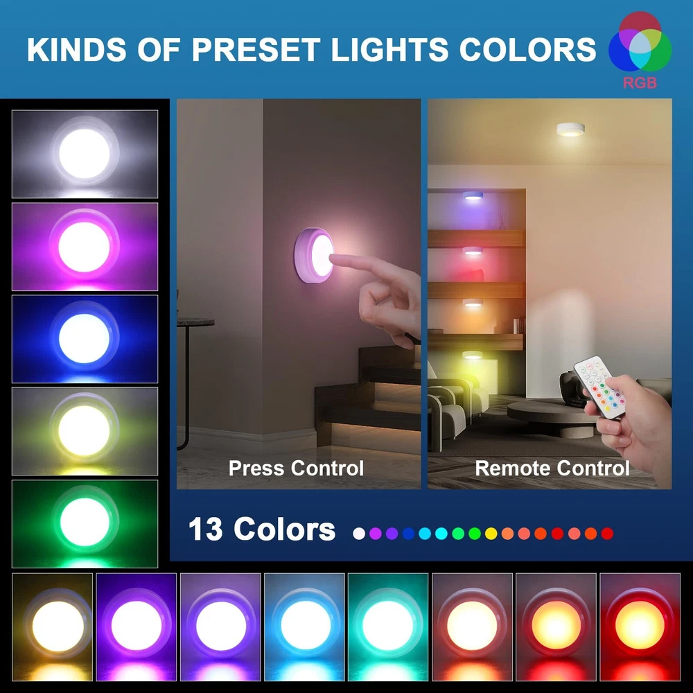 【Wireless Remote】 led puck lights with 1 remote control(3Packs) with control modes: turn on/off with the remote control or manually press the dome button. The remote control distance range: 16 feet ~ 21 feet, which is very convenient and easy to use. 【Dimmable Light and 13 color RGB】Battery Powered Puck Lights has 30 lumens, bright enough. Press the "-" and "+" buttons on the remote to get the exact brightness you want (5 levels of adjustment).13 color options: warm white and 12 preset colors. smooth, cycle through 12 rainbow colors; Fade in and out and slowly change the brightness of a color. 【Smart Timekeeping】Upgraded led push lights with Wireless Remote can be set to turn off after 30 or 60 minutes, which is convenient for energy saving. It can intimately accompany babies who are affected by darkness. Reboot from the indicator when it was last turned off. 【Widely Used】This indoor led night lights are widely used in bedrooms, baby rooms, counters, kitchens, garages,basements, closets, stairs, corridors, cabinets, etc. 【Easy Installation】Each wireless LED closet light is powered by 3 AA batteries (batteries not included), using original tape (including 3) for quick installation. When the light brightness starts to weaken or the remote control is not sensitive enough, just unscrew the light from the base and insert a new battery to replace it. 【Note】 When the light dims, changes color, doesn't light up or flickers a bit, remote control malfunctions these situations, usually it's dead, just change the batteries to solve the problem.