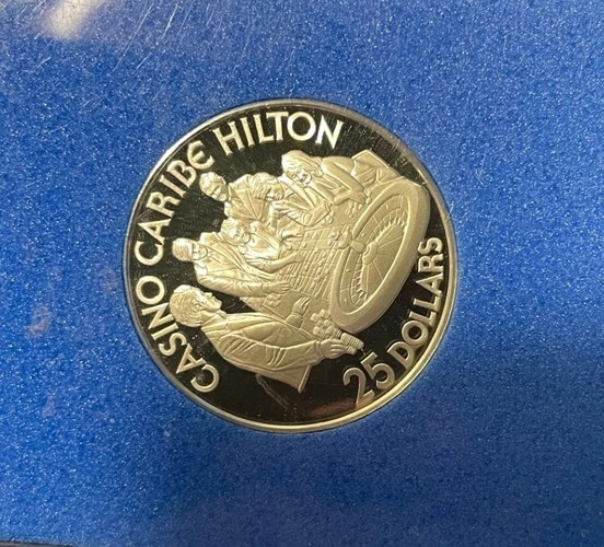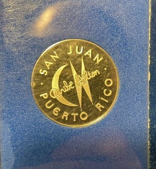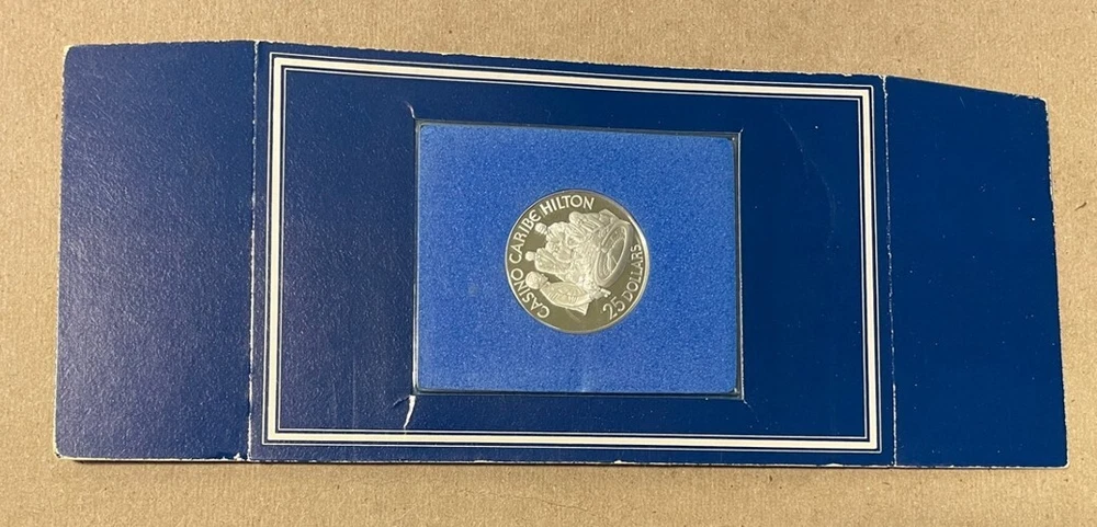 This is a Puerto Rican Silver $25 Casino Caribe Hilton Token in Proof condition. Produced by the Franklin Mint in original plastic and cardboard of issue. Circa 1977-1979 with an estimated mintage of about 500. A lot of shopwear on the packaging, but the Token looks great. Should be a great deal at our low opening bid that includes postage. Please see the photos to judge the condition of the item. FREE SHIPPING, INSURANCE & DELIVERY CONFIRMATION! I will accept payment from U.S. bidders only. Please send payment within 7 days of the auction ending. If you are not satisfied with your purchase, you may return the item to me (if multiple items are in an auction, the entire group must be returned) within 14 days for a full refund (buyer will be responsible for the return postage). As I send all items insured with delivery confirmation, I ask that any returns be insured with delivery confirmation as well. Items must be sent back to me in their original un-tampered with holders or the return privilege is voided. Thank you and good luck.