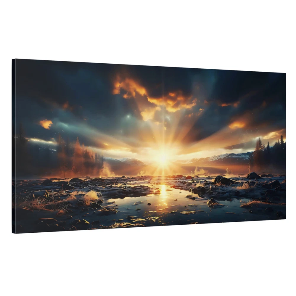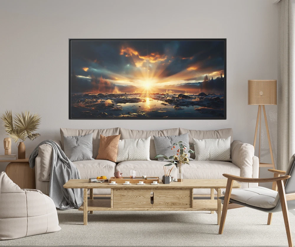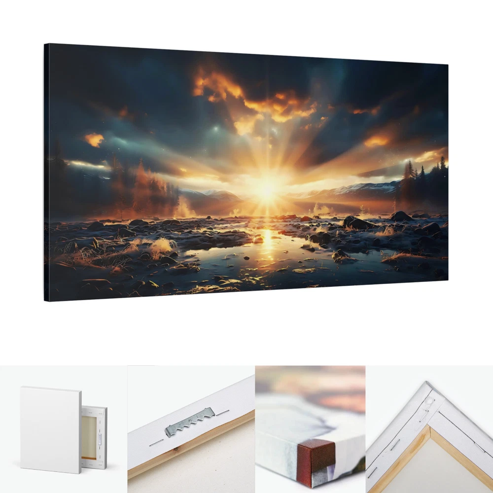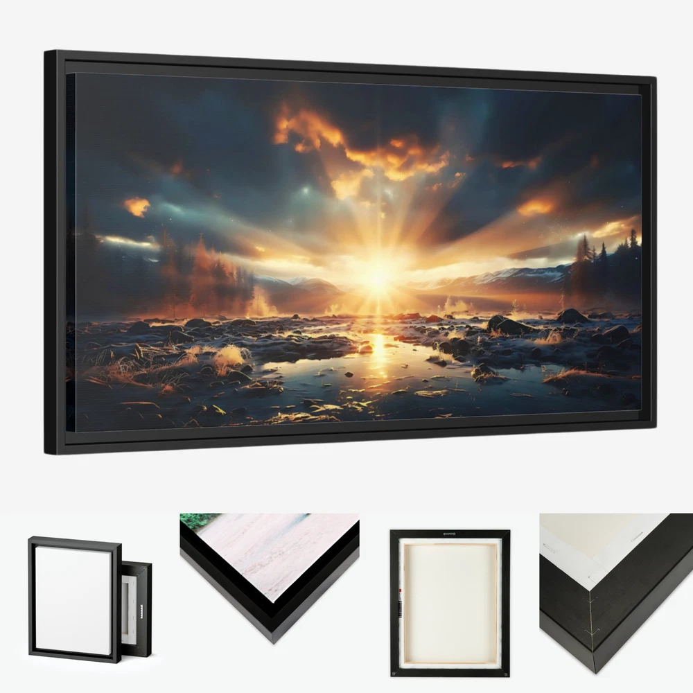 "Falling Light, Rising Beauty" – Epic Sunset Landscape Illustration Product Description: Immerse yourself in the breathtaking splendor of " Falling Light, Rising Beauty " , a licensed reproduction of an AI-generated epic sunset landscape by Hypnotik Creations. This panoramic masterpiece captures the golden hues of twilight as they cascade across a tranquil, wide-angle view, blending rich and vivid colors with dramatic light and shadow. The scene radiates beauty and serenity, making it a perfect focal point for your home or office. Expertly printed in HDR on museum-quality cotton-polyester composite gallery-wrapped canvas , this artwork features a special proprietary matte finish coating that enhances detail and guarantees long-lasting vibrancy. Using state-of-the-art printing technology and UL-certified Greenguard Gold inks , the image delivers stunning, eco-friendly clarity while being non-toxic, non-hazardous, and non-flammable. Choose between two elegant display options: with or without the 1.25" solid pine wood frame in black . The handcrafted frame, sustainably sourced and FSC-certified, adds a sleek floating effect, elevating the canvas to gallery-quality perfection. Both options are ready to hang out of the box , with sawtooth hardware pre-attached and rubber dots ensuring the canvas stays securely in place. Whether displayed in a living room, bedroom, or office, " Falling Light, Rising Beauty " is an awe-inspiring piece that brings the magic of nature into any space. Available framed or unframed, this eco-conscious artwork is a timeless investment in style and tranquility. Key Features: Title: " Falling Light, Rising Beauty " by Hypnotik Creations Design: Panoramic sunset landscape featuring epic colors and a dramatic wide-angle view. Material: Museum-quality cotton-polyester composite gallery-wrapped canvas with a proprietary matte finish for vibrant, long-lasting color. Printing: HDR printing with UL-certified Greenguard Gold latex inks ensures eco-friendly, non-toxic, and high-quality imagery. Frame Options: Framed: 1.25" solid black pine wood frame with a floating effect, FSC-certified and sustainably sourced. Unframed: Same premium materials without the frame. Eco-Friendly: Made with sustainable materials and safe, environmentally responsible inks. Ready to Hang: Pre-attached sawtooth hardware and rubber dots for secure installation. Size Variations: Slight deviations of +/- 1/8" (3.2mm) due to production processes. Care Instructions: Wipe gently with a clean, damp cloth to remove dust or smudges. Size Options: 32x16, 48x24, 60x30. Transform your space with the timeless beauty of " Falling Light, Rising Beauty " , a stunning sunset panorama that exudes warmth, elegance, and a sense of wonder. 4o * Shipping to Alaska, Hawaii, and unincorporated territories of the United States can take additional 7 ? 12 business days, weather permitting.