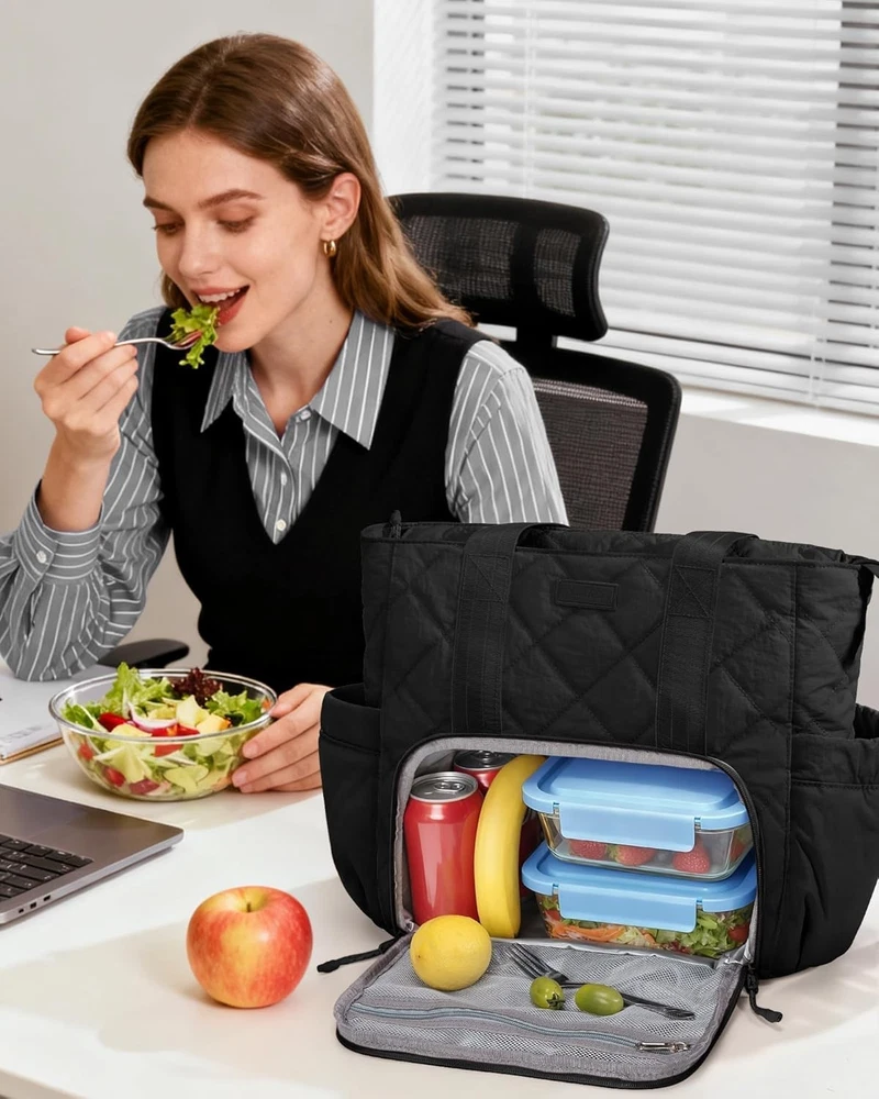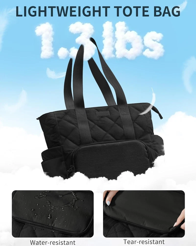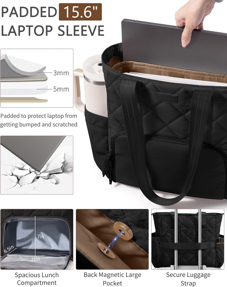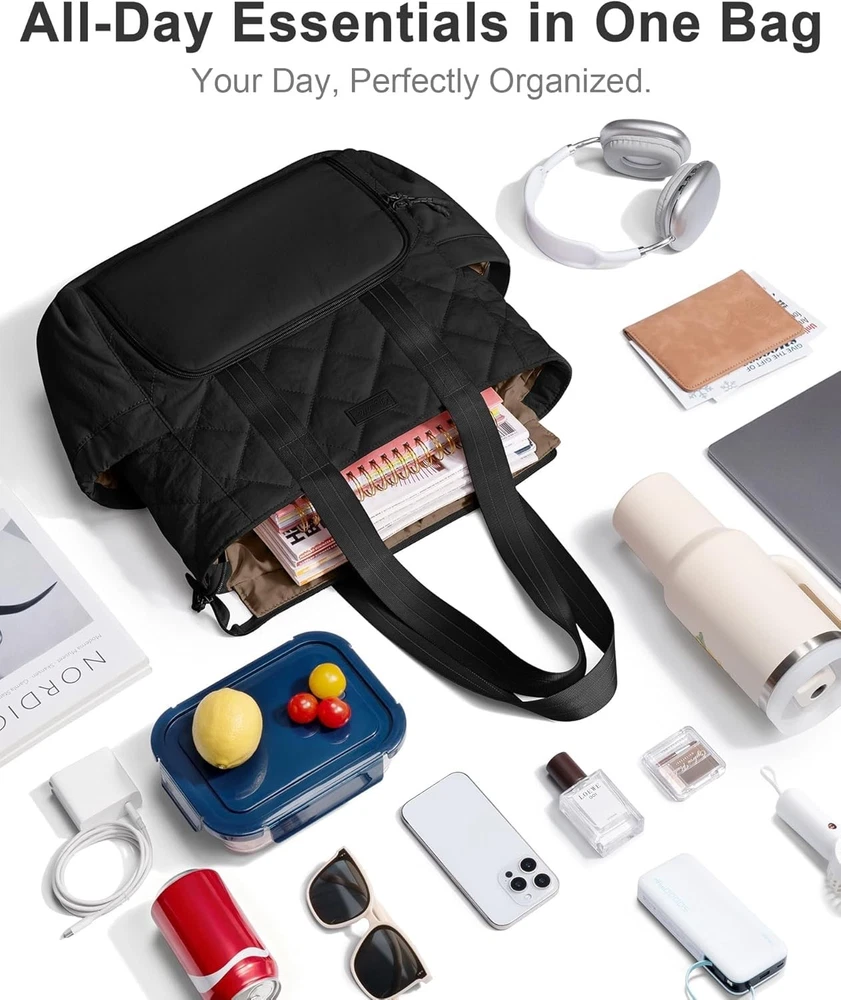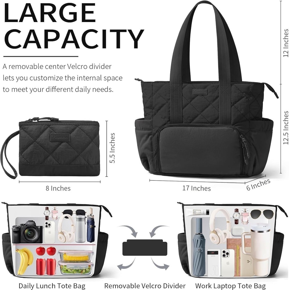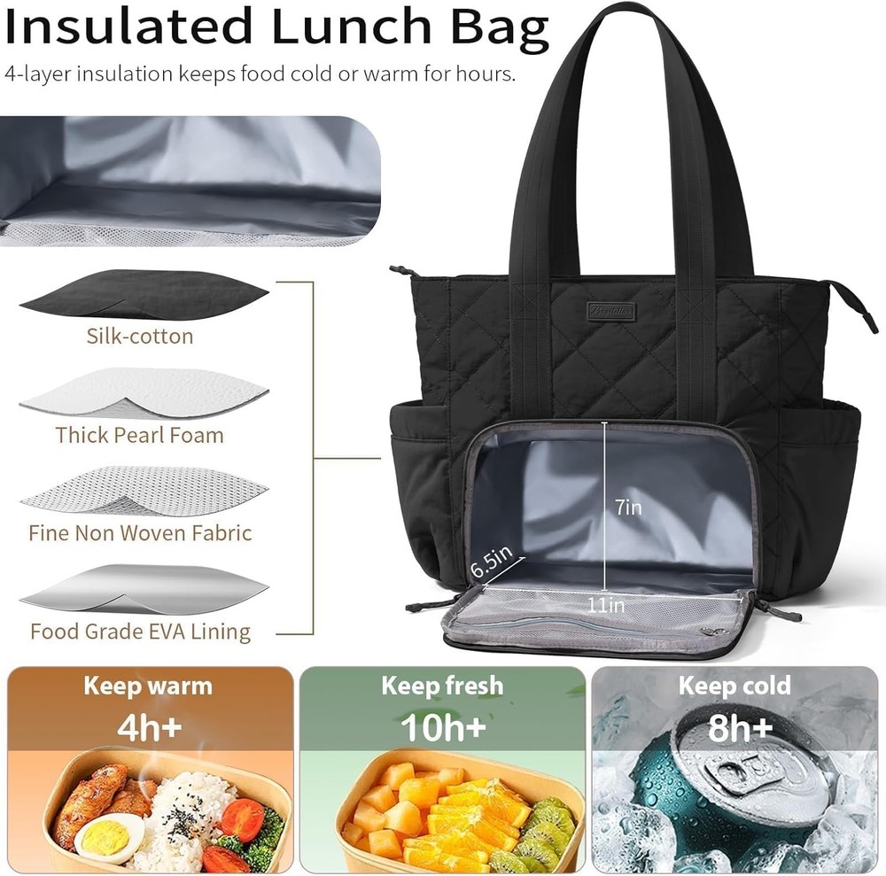 Free eBay listing template designed by dewiso.com Puffer Lunch Tote Bag for Women, 15.6 Inch Laptop Work Bag with Insulated Lunch Compartment & Large Cup Holder, Lightweight Quilted Puffy Lunch Box Purse for Teacher Nurse Travel Office Daily School FREE AND FAST SHIPPING! About this item Versatile Tote Bag for women: Say goodbye to the hassle of carrying multiple bags! This versatile tote bags can hold everything you need for everyday use. It seamlessly transitions from a professional laptop bag to an insulated lunch bag, keeping your food fresh and delicious for hours. The matching make up bag for women holds cosmetics or small essential. Perfect Puffer lunch tote bag for busy women, teachers, nurses, commuters, college, work, travel, picnics, or casual outings Ideal Lunch Bag Women: Ditch the separate lunch bag for good. The Bagstellar lunch box for women features a spacious built-in lunch compartment(11"x7"x6.5") with a high-quality and waterproof EVA lining that locks in temperature and locks out leaks for effortless cleanup. It separates food from your laptop or valuables, keeping food and drinks cold, hot, and fresh for hours. Plus, a handy inner mesh zipper pocket keeps your utensils or an ice pack organized. Ideal women lunch bags for work Multiple Pockets Work Bag for Women: Stay organized with this large capacity quilted tote bag(17"x6.5"x13"). It is spacious enough to pack all of your food and other items for the entire day. It features multiple compartments including a dedicated laptop sleeve(separate from the main and lunch compartments), roomy main section, built-in lunch compartment, pen slot, slip and zip pockets, large magnetic pocket, and side water bottle pocket, so all your daily gear is neatly stored and within reach With Large Cup Holder: Designed for your large water bottle, this work bag with lunch compartment features an elastic side pocket that holds up to 40oz tumblers or travel mugs, perfect for staying hydrated on the go. The elastic snap design allows the cup's handle to fit perfectly, ensuring stability and easy access. This versatile tote can be used as a womens lunch bag, laptop tote, lunch bag, handbag, work bag, nurse bag, shoulder bag teacher tote bag, school tote bag, travel tote bags Perfect Gift Giving & Guarantee: Bagstellar team is committed to provide superior womens tote bag. Our packuum tote bag weighs just 1.3 lbs—that's nearly half the weight of many standard PU leather bags, making your daily commute noticeably easier. Ideal large lunch bag, laptop tote bag for women, work tote bag with lunch compartment. Thoughtful and practical Christmas Gifts, Birthday Gifts, Valentine's Day Gifts, Teacher Nurse Appreciation Gift. Any questions, send us your issues for solution Product We offer a 30-Day Return Policy on items which you are not completely satisfied with. You have the option for a full-refund or an exchange of the item. No returns are available on items shipped outside of the US . Shipping We offer Free Shipping to the US and ship within 2 business days of payment, usually sooner. We use UPS express shipping. That's why your products are usually delivered within 3 days . Contact We try our very best to make sure every customer is completely satisfied. If there's a problem , message us! We're happy to help. 24/7 live chat available.