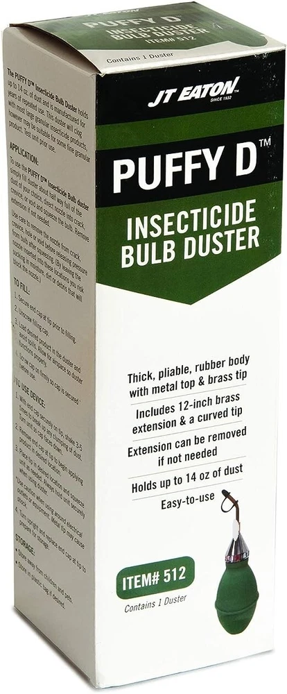 Puffy D Insecticidal Duster (512) comes with a 12” applicator, a plastic funnel for filling, and a short bent tip that allows you to dust easily in cracks and crevices. This duster may be used to apply both dusts and granular and will hold up to 14 oz of dust. Thick, pliable rubber body with metal top and brass tip holds up to 14 oz. of insecticide dust Heavy duty and manufactured for years of repeated use Includes optional 12-inch brass extension and curved tip for hard-to-reach areas Rupper tip for protection around electricity Screw top lid and funnel for easy filling and end cap to prevent powder leakage