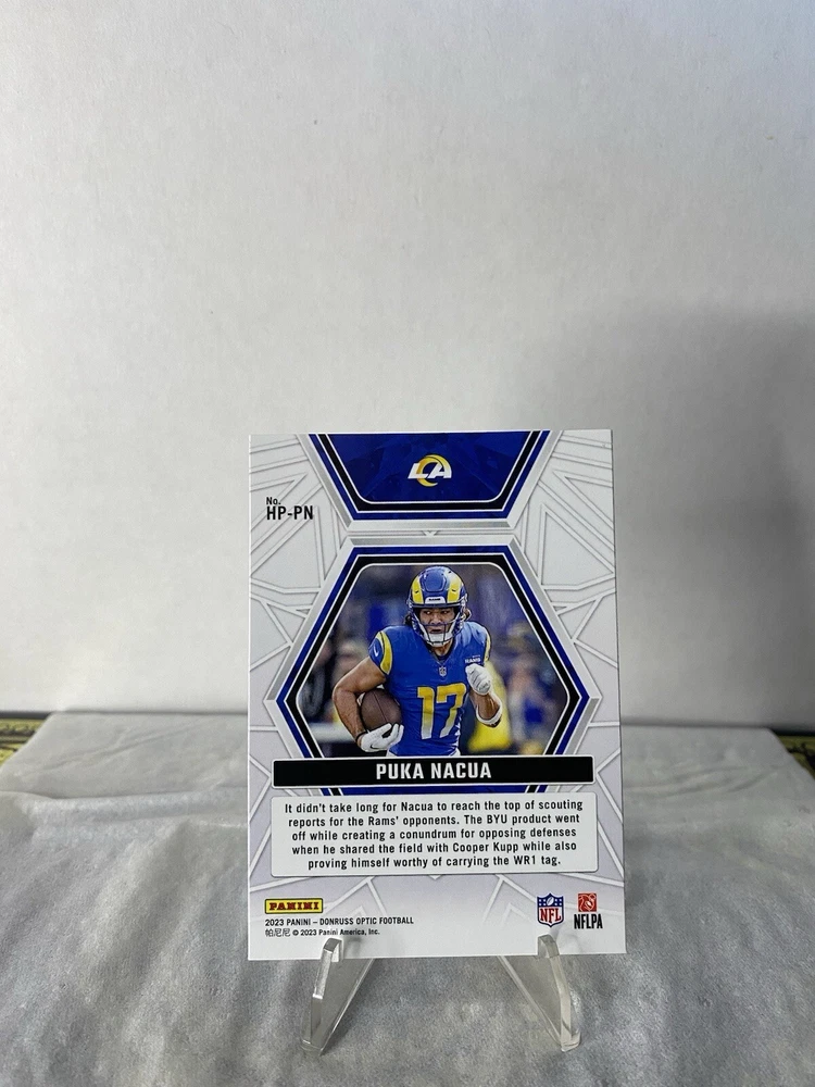 This Puka Nacua 2023 Panini Prizm #357 RC card is a must-have for any Los Angeles Rams fan or sports trading card collector. The card features a stunning design and is part of the highly sought-after 2023 Panini Prizm set. With attributes such as NFL, football, and Prizm parallel/variety, this card is a true gem. It also includes the rookie Puka Nacua, who has been making waves in the NFL. Don't miss out on the opportunity to add this card to your collection.