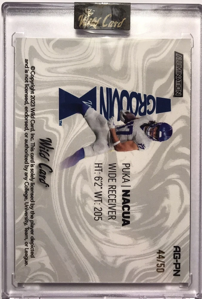 Manufacturer: Wild Card Team: LA Rams Print Run: 50 Original/Licensed Reprint: Original Material: Card Stock Card Size: Standard Type: Sports Trading Card Parallel/Variety: Chrome League: National Football League (NFL) Player/Athlete: Puka Nacua Features: Parallel/Variety, Rookie, Serial Numbered, Short Print, Encased Year Manufactured: 2023 Sport: Football Card Number: AG-PN Season: 2023 Set: 2023 Wild Card Alumination