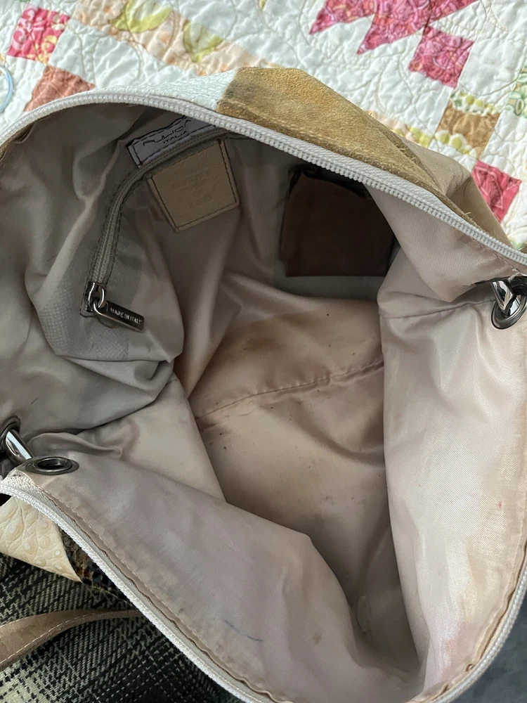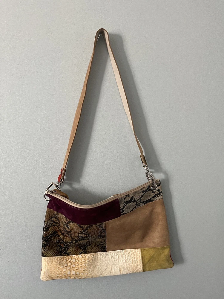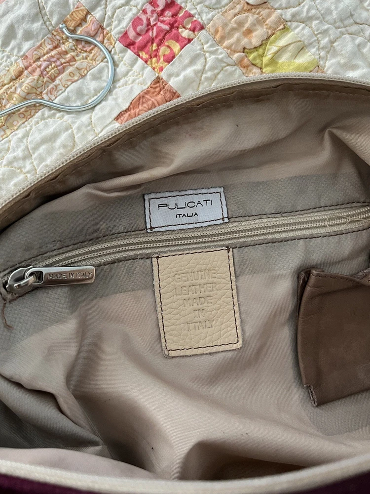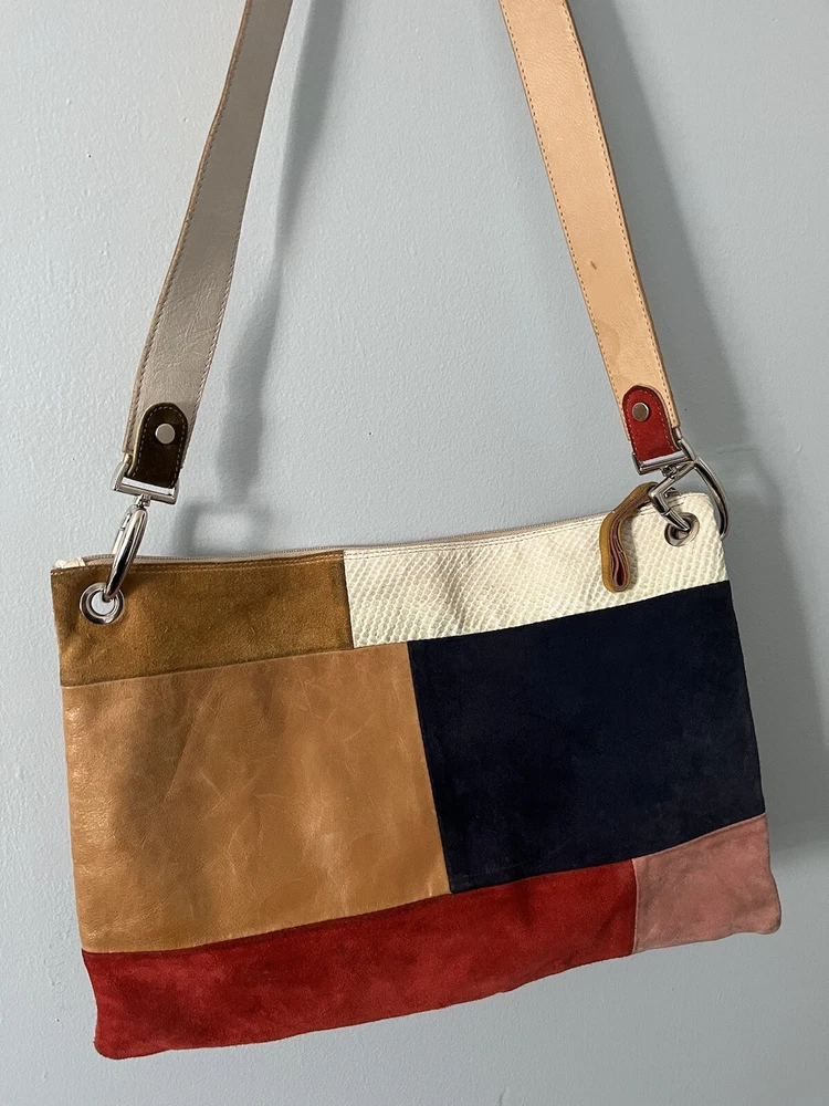 The Pulicati Italia Anthropologie Patchwork tote style handbag is a large, vintage-inspired purse made in Italy. Featuring a unique patchwork design with multicolor leather exterior, this square-shaped tote has a zip closure and silver hardware accents. The bag includes a brown leather shoulder strap for easy carrying and has a bohemian Y2k style theme. With a beige lining and suede finish, this stylish handbag is perfect for women looking for a statement piece to add to their collection.
