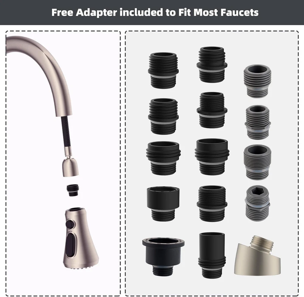 Pull Down Spray Head for Kitchen Faucet, NSF/ANSI/CAN 61 & CUPC Certified 3-Function Spray Nozzle, 15 Adapters, Sink Faucet Head Compatible with Moen, Delta, Kohler, Brushed Nickel Easily Switch Between 3 Modes: The kitchen faucet sprayer head has stream, spray, and high-pressure rinsing modes; The unique-designed high-pressure rinsing mode is a very strong power mode, which can easily flush the food debris with blade water; Simply press and release the button to switch between 3 modes Available In 15 Connection Sizes: This pull-down spray head comes with 15 adapters for various connections that are compatible with major product faucet hoses, not to compatible with American Standard, Moen, Delta, AquaSource, Kohler, Hansgrohe and Grohe (Pfister or Glacier not included). Please note that this spray head is not suitable for RV faucets Removable & Washable Faucet Aerator: An aerator key is included for removing or replacing the faucet aerator to clean; The interior multi-mesh aerator creates a quiet no-splashing aerated stream; The aerator can be removed and cleaned to ensure clean water and continuous flow Quality & No Dripping: This kitchen faucet head is crafted from high-grade PC/ABS engineering plastic, featuring an ergonomic design and an industry-leading finish that resists scratches, ensures longevity, and effectively withstands rust. Certified by NSF, cUPC, and low-lead standards, it meets strict safety and performance standards Easy to Install: It's very easy to install the sink faucet head, simply unscrew your old shower head and replace it with the new one; No tools are needed