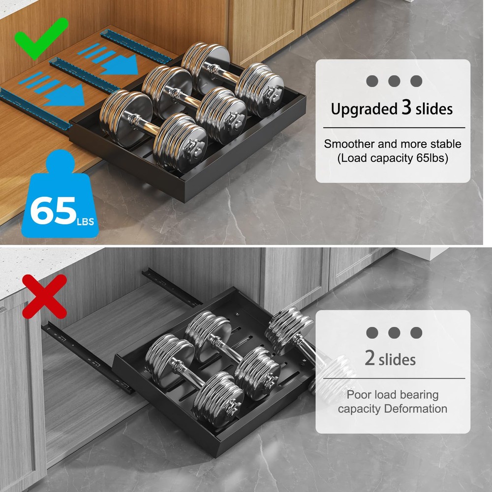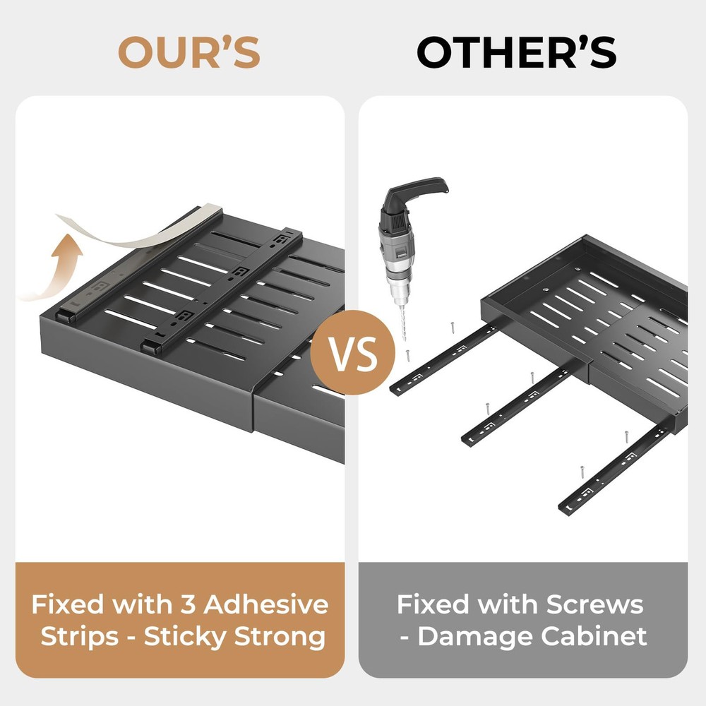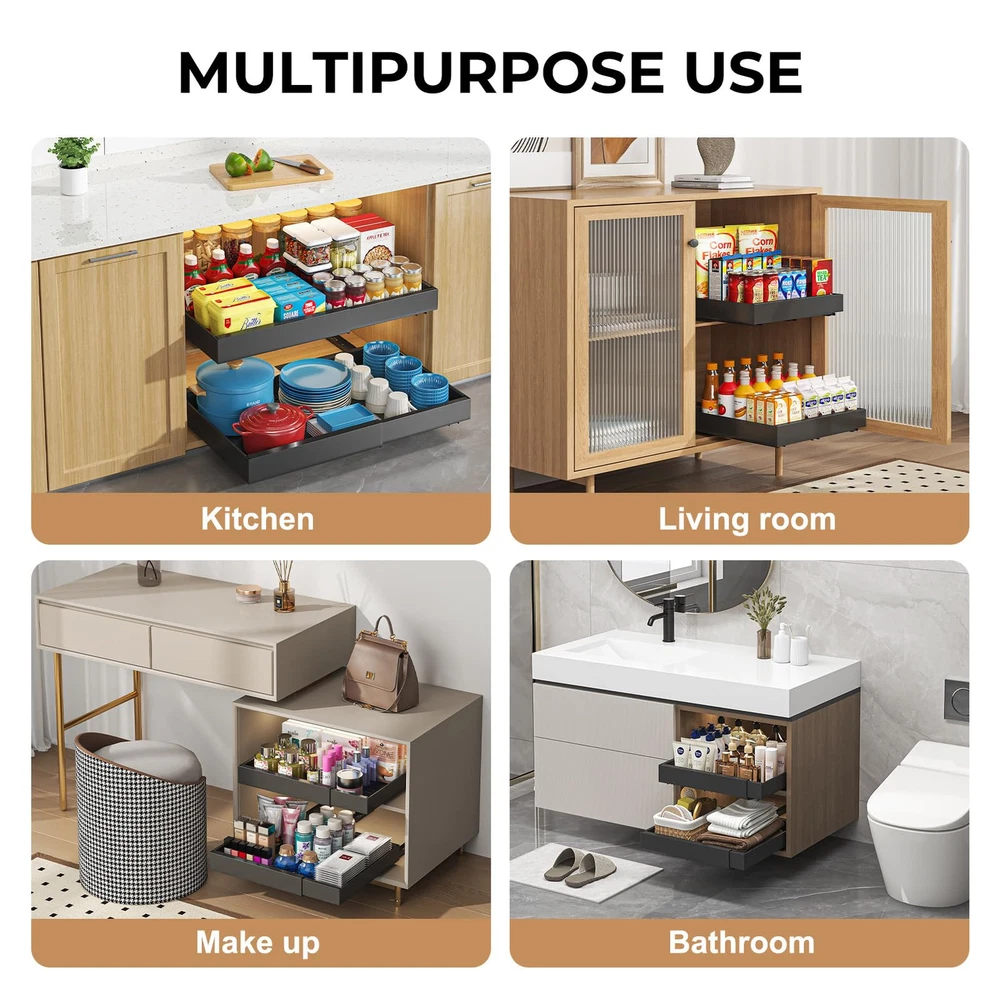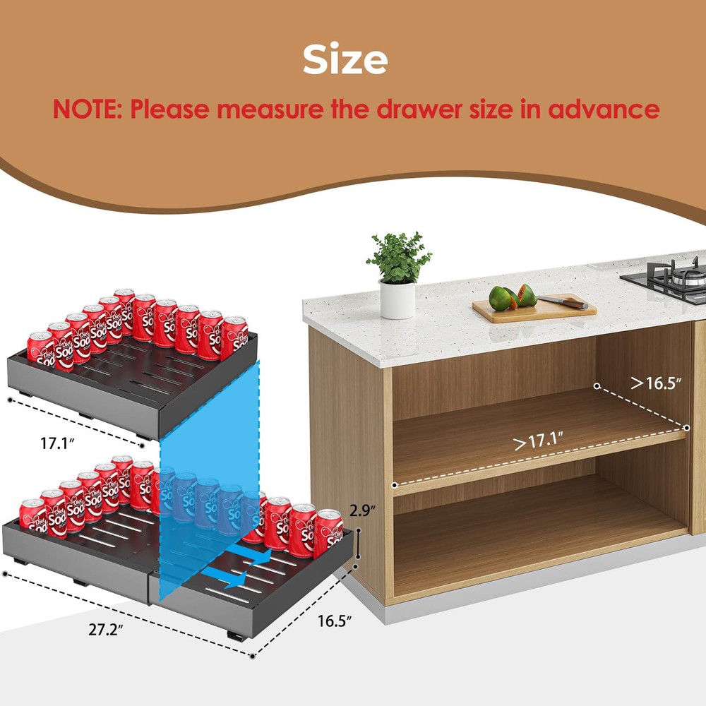 【Adjustable Slide Out Drawers for Kitchen Cabinets】The Homehut pull out cabinet organizer is designed with flexibility in mind, featuring an expandable system that can be adjusted to fit a variety of cabinet sizes. With dimensions of 16.5 inches in depth by 2.9 inches in height and a width that adjusts from 17.1 inches to 27.2 inches, this cabinet pull out shelves solution is a perfect fit for your kitchen storage needs. Before selecting, please ensure to confirm the size of your cabinet for seamless integration. 【Cabinet Drawers Slide Out Silently and Smoothly】 Engineered for durability and quiet operation, our pull out drawers for cabinets boasts dampened glide rails that have undergone rigorous testing for 40,000 cycles of opening and closing. Experience the convenience of slide out drawers with a one-second glide out motion, free from jamming or snagging. The smooth and quiet operation ensures a pleasant user experience every time. 【Enhanced Load Capacity with Upgraded 3-Rail System】 Our pantry organizer has been thoughtfully upgraded with a 3-rail system, offering a 30% increase in load-bearing capacity over similar organizers with only two rails. This robust design allows the cabinet pull out shelves to support a maximum weight of up to 65lbs, making it a reliable choice for your heaviest kitchen items. 【No Screw Adjustable Cabinet Drawers for 10S Quick Installation】Say goodbye to complex assembly with our easy 10-second installation process. The kitchen cabinet organizer and storage cabinet come with clear instructions and can be mounted using either the provided screws or nano adhesive—no tools required. This peel and stick slide out drawers solution is ideal for quick setup in your kitchen, bathroom, under the sink area, or pantry. 【Versatile Under Cabinet Drawers Slide Out】The multifunctional pull out cabinet organizer is an essential addition to any kitchen, making it easier to organize and access your cookware, frying pans, small kitchen utensils, cleaning products, canned goods, and other items. The under cabinet drawers slide out design ensures that you can make the most of your cabinet space, providing effortless access to your belongings.