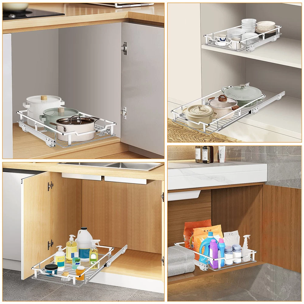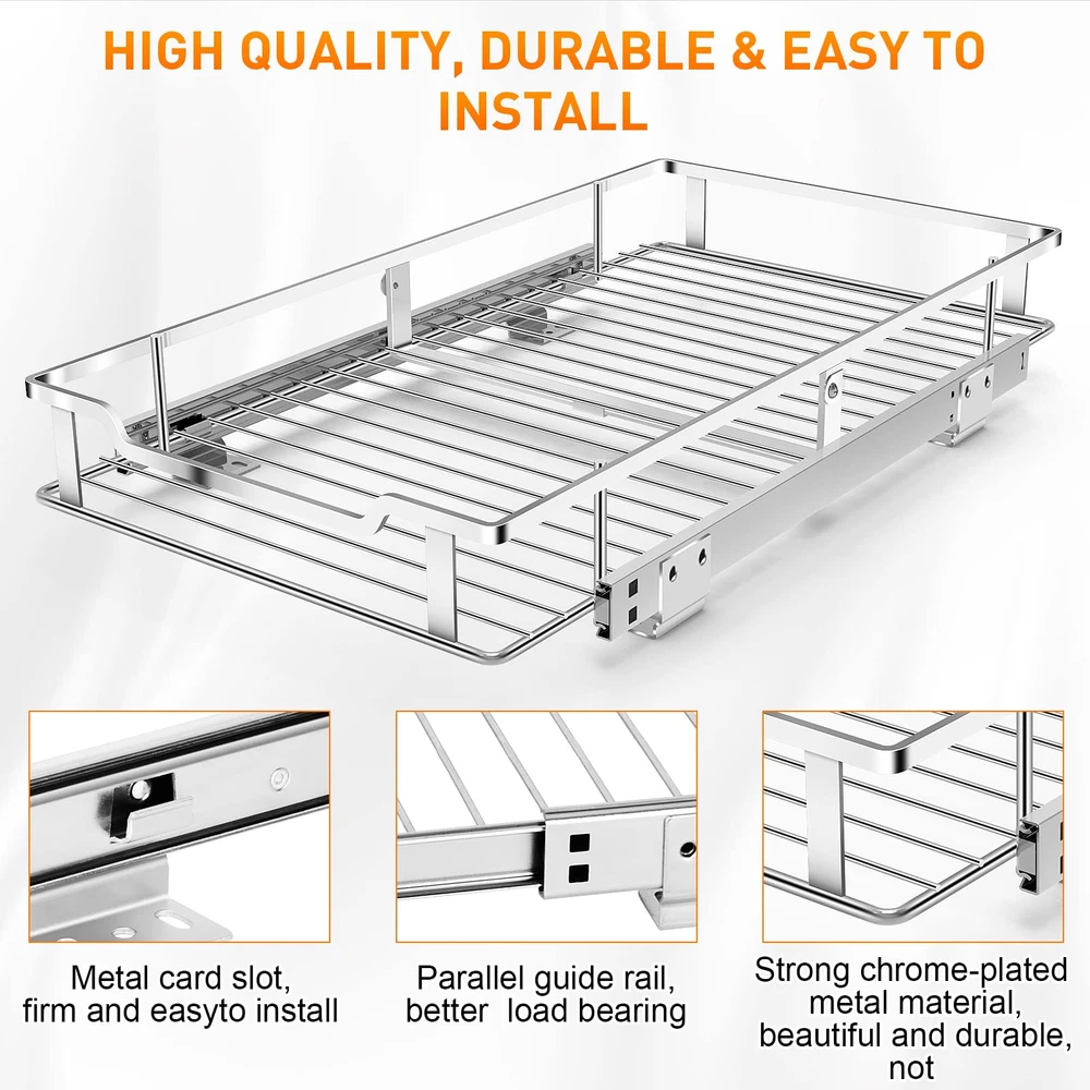 ►MULTIPURPOSE CABINET ORGANIZER - Pull out cabinet organizer is great to storage many other items and put the clutter away in order to give you a tidy home.pull-out sliding shelving system suitable for many places in the kitchen, such as under sink organizer, pot rack, spice rack, etc. And it's suitable for bathrooms and laundry rooms, organizing cleaning supplies, etc. The drawer shelves is removable and washable, give you a tidy home. ►EASY INSTALLATION - Kitchen cabinet organizer dimensions measure 21 inch length × 12 inch width × 2.44 inch height. Its simple design and easy installation instruction make your installation successful quickly. Only takes a few steps, you will get a entire pull out organizer for cabinet. Perfect for your kitchen, bathroom, under sink and pantry storage organizing. Note: this product needs to be fixed with screws to your cabinet. ►HIGH QUALITY CHROMED STAINLESS STEEL - Slide out cabinet organizer made up with high quality chrome stainless steel. Its excellent stability make it can be used in everywhere, like kitchen, bathroom, living room and etc.Its heavy duty construction design makes it totally capacity up to 100 lbs. ►SMOOTH SLIDE-OUT DRAWER - The sliding shelf is professionally designed with an industrial-grade ball sliding system to ensure smooth and quiet sliding every time. The unique vertical guide rail can provide better load bearing. Perfect for your kitchen, Bathroom, and pantry storage organizing. This is great for you because now you won't have to waste time-fighting with an under the cabinet system that gets stuck, breaks or is too loud. ►PERFECT SERVICE - We pursue the best customer service experience. If you have any questions before purchasing or after receiving the product, please feel free to contact us, we will provide the best service! NOTE: Needs a minimum of 13" W and 22" D cabinet opening space to properly fit.
