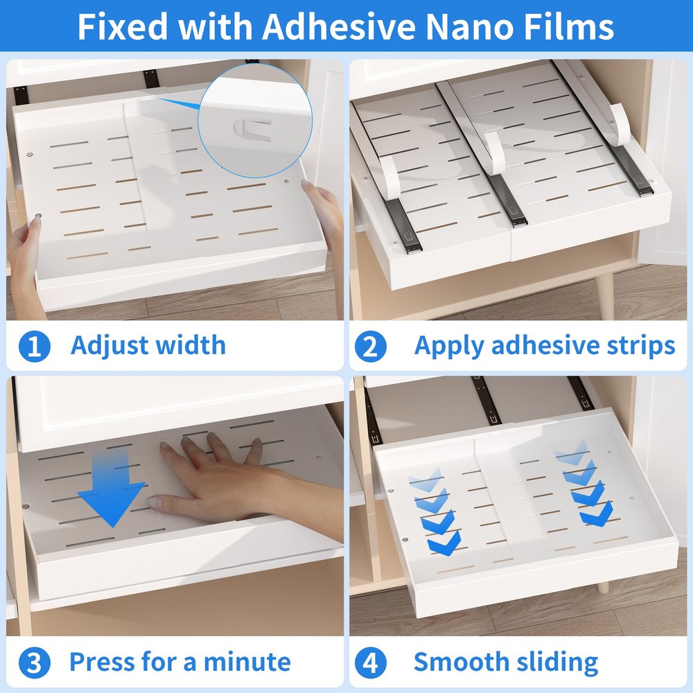 Note: Please measure the size of your cabinets before purchasing, the cabinet roll out drawer is suitable for cabinets over 13" W and 18" D.It is not suitable for cabinets with a frame around the outside. EXPANDABLE WIDTH: The pull out cabinet organizer features an expandable design with adjustable width to fit different cabinet sizes. It measures 16.5" D and 2.4" H, adjustable width range is 12.2"-20.5". FIXED WITH ADHESIVE NANO FILMS: The pull out drawer for cabinets includes installation instruction and 3 Adhesive Nano Films, Simply apply the adhesive strips to the slide out drawer guides and secure the drawer to the cabinet. Easy to install in minutes, no screws or drilling required. SMOOTH AND QUIET SLIDING: Our pull out shelves for kitchen cabinet are equipped with precision dampening guide rails that slow down the impact of the drawer when it closes and closes slowly even when pushed hard.Tested for over 50,000 cycles, they open and close seamlessly and glide smoothly without unpleasant noise. HEAVY DUTY MATERIAL: The slide out drawer for kitchen cabinets is made of heavy duty carbon steel, thickened structure, very strong and durable.Upgraded 3 guide rails which with much heavier load capacity and load bearing strength up to 55 pounds. The surface of the cabinet pull out shelve is made with anti-rust treatment, easy to clean. Perfect for your kitchen, bathroom, under sink and pantry organizers and storage. EASY ACCESS TO ITEMS: Keep your kitchen efficient with a cabinet slide out shelve. You can make the most of your cabinet space and have easy access to items buried deep within. If you have any questions while using the under cabinet organizer, Please let me know and we will provide you with excellent after-sales assistance!
