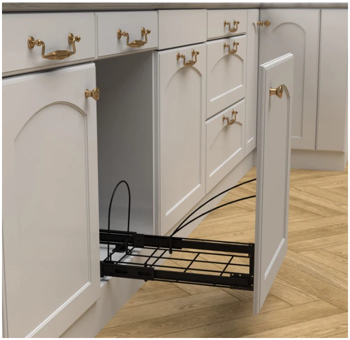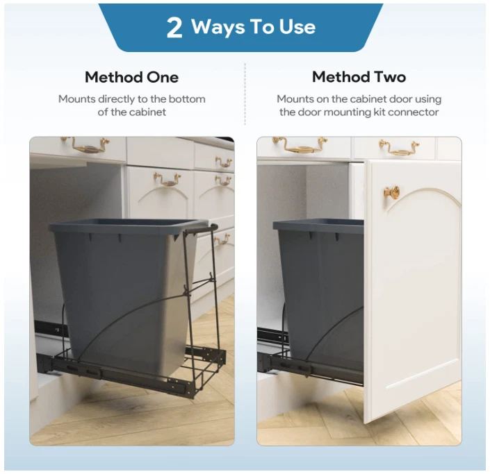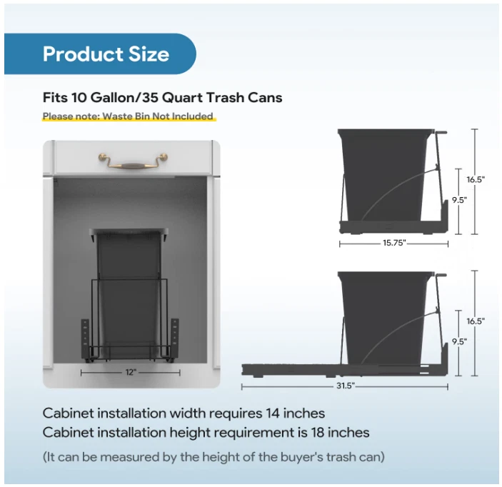 Pull Out Trash Can Under Cabinet,Black Cabinet Trash Can Pull Out Kit with Door Mounting Kit,Heavy Duty Ball-Bearing Slider -Waste Bin Not Included Brand Tanamu Capacity 10 Gallons Color Black Opening Mechanism Pull-Out Material Carbon Steel Recommended Uses For Product Kitchen Room Type Laundry Room, Kitchen, Home Office Special Feature Foldable Shape Rectangular Finish Type Powder Coated About this item 【2 ways to use】1:Pull out trash can under cabinet with door mounting kit can be used to connect cabinet doors.2:Install directly on the bottom of the cabinet without using the door mounting kit.The bottom limit rod is secured with a lock nut, which enhances the stability and safety of the trash can. 【Hidden Design】This cabinet trash can pull out kit is an ideal solution for managing your kitchen waste while saving valuable space. It comes equipped with an arc silicone grip handle that provides a comfortable and easy grip and pull out garbage can without getting your hands dirty. 【Sturdy 】Under the sink trash can is made of high-quality heavy-duty steel with a chrome finish to withstand the wear and tear of daily use,The maximum bearing capacity can reach 70 pounds, Note: not Include Garbage Bin and Cabinet. 【Ball slide】The trash can drawer pull out kit use heavy-duty thickened slide rails provide effortless sliding and make it simple to dispose of garbage without any hassle.The hooks and limit rods are sturdy enough to ensure smooth and reliable operation without any easily loose or fall out. 【Cabinet Requirements】Slide out trash can cabinet mount kit Dimensions: 12"W x 16"D x 16"H; Minimum Cabinet Dimensions Required:14"Wx 18"Dx 18"H. Note: You can add gaskets at the connection of the door mounting kit to prevent the door panel from break through unsightly. The installation height of the trash can slide rail rack under the cabinet door needs to be measured according to the height of the buyer's trash can. . We offer FREE shipping on all orders! . We ship within Five business days of payment, usually sooner. . We use a selection of shipping services such as UPS, FedEx, USPS etc. . We only ship to the lower 48 states, no APO/FPO addresses or PO Boxes allowed. . Local pickups and combined shipping options are not provided at this time. . Your satisfaction is a wonderful reward for our efforts. Please assist us by leaving a positive review if you feel pleased with our service. . In the event that you encounter any difficulties related to your order, please do not hesitate to reach out to us directly through the Messaging system on the Ebay platform. Kindly consider opening a COMPLAINT or a RETURN REQUEST as a last resort, only after all other possible measures have been attempted and we have been unable to provide you with assistance. . We will get in touch with you within 24 hours and make every effort to ensure your satisfaction. . Please rest assured of our service quality.