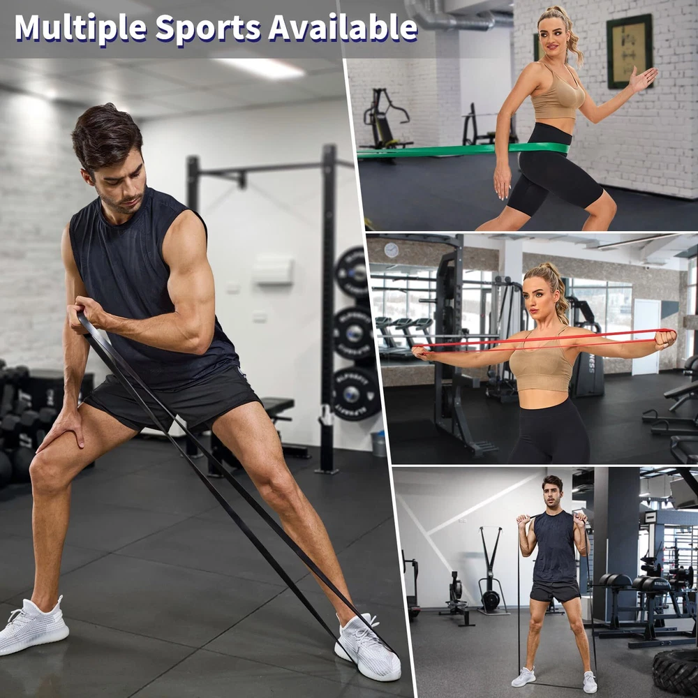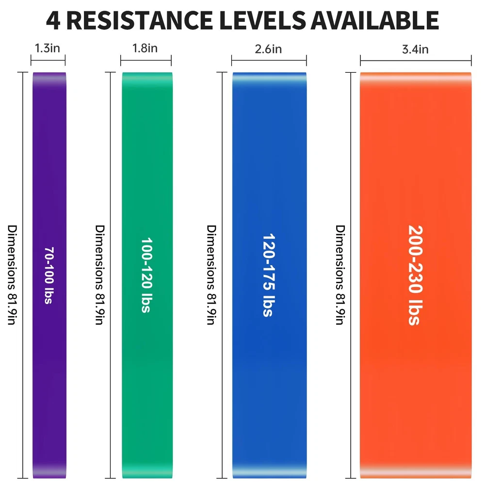 Resistance Bands for Working Out, Exercise Bands Resistance Band Set for Men & Women, Workout Bands Pull Up Assistance Bands for Muscle Training and Body Shape, 410 LBS - 500 LBS - Carry Bag Included Natural Workout Bands: Resistance bands made from 100% high-grade natural rubber,which makes resistance bands set soft and odorless. The pull up assistance bands can remain high elastic after years of working out and exercising. 4 Exercise Band Levels: The package includes set of 4 exercise bands correspond to different colors, Purple(70-100 lbs), Green(100-120lbs), Blue(120-175lbs), Orange(200-230lbs), 81.9 inches in length and can be used alone or combine multiple stretch bands for exercise to increase the challenge. Easy to Carry: The exercise bands resistance bands set come with a dual shoulder strap organizer bag for easy portability. you can keep your workout wherever you go, at home, gym, or even you travel. Great for Stretching & Resistance: Our workout bands are great for learning pull ups, Pilates, Mobility, Powerlifting, Chin ups, Yoga, Stretching, Gymnastics, physical therapy, push-ups, barbell and dumbbell assist etc. Your Movable Gym: Our elastic bands for exercise can offer variety of training. Exercise your legs, back,arms and chest all at once with mobility band, perfect for body Shaping and physical therapy to help strengthen torn ligaments or muscles.