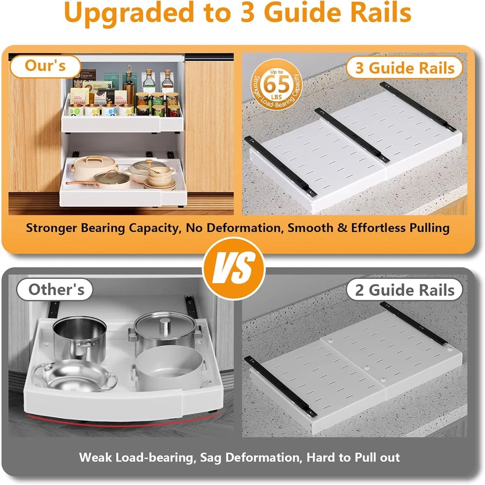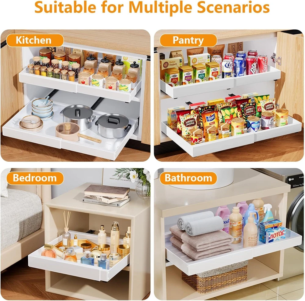 Important Note: TPINHESR pull out cabinet organizer is only suitable for cabinets with a width exceeding 13", and a depth exceeding 22". Please confirm the dimensions of your cabinet before purchase. Please note: our pull out drawers for cabinets will not fit cabinets with frame Upgraded 3 Silent Damping Guide Rails: Engineered from premium-grade metal with precision damping guide rails, tested for over 40,000 times of opening and closing. Our kitchen cabinet organizer address the shortcomings of traditional 2-rail drawers, such as weak load-bearing capacity, sag deformation, and difficulty in pulling them out. Our expandable drawer organizer offer superior bearing capacity, extend fully, allowing easy access, noiseless, stable, smooth and quiet operation Maximize Every inch of Space: Our deep drawer organizer with 21" deepth can better optimize cabinet real estate, providing easy access to items buried in the depths, maximize and make full use of the deep inside space in the kitchen, pantry, bathroom, living room, closet etc. Keep your home clean and tidy while maximizing storage potential and providing a sleek and seamless look with our space-saving solution. Bid farewell to wasted space Heavy Duty Material: Our pull-out home organizers is made of heavy-duty carbon steel which is super sturdy and durable to store heavy kitchen items like mixers, pots, pans, bowls, utensils, canned goods etc. Waterproof and abrasion-resistant coating makes it easy to clean and can ensure long lasting usage. With the sleek finish and versatile design, our sliding cabinet organizer pull out shelves seamlessly enhances any kitchen decor. Whether your style leans modern or traditional, elevate both form and function with the cabinet roll out drawers, your ultimate kitchen upgrade No Need Drill & Nail: Our pull out shelves for kitchen cabinets are fixed with super strong nano adhesive, easy installation in minutes, no need to drill & nail your cabinets. The rails and drawers are pre-installed and shipped as a whole, simply affix the no drill pull out drawers for kitchen cabinets to your cabinet's interior and press the pullout cabinet organizer by hand to complete the installation. Effortless installation, instant results, say goodbye to complex setups Exceptional Customer Service: Your satisfaction is our priority, and we are here to address any queries promptly. Don't hesitate to touch us via email if you need assistance, we will provide 100% satisfactory service for you Adjustable Design: Our sliding drawers for cabinets adopt a width adjustable design with an extendable range (12.6"-21") to fit different sizes of cabinets, offering tailored storage solutions for pots, pans, lids, bowls, cutting boards, cupcake trays, bakeware, small kitchen appliances, spices, canned goods, cleaning products and more. You can adjust the slide out cabinet organizer base as you need