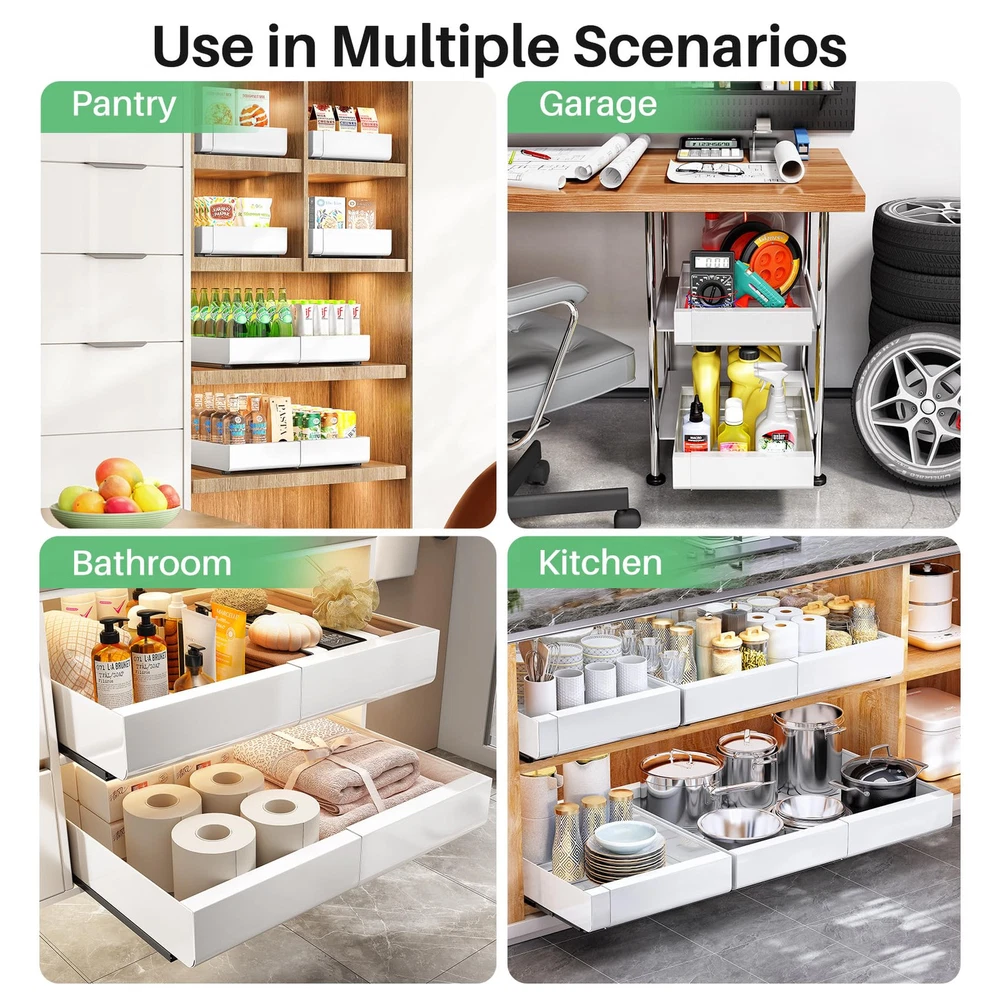 Important Notes (Please Read Carefully): Before purchasing, make sure to measure your cabinets. The product dimensions are 21" D x (11.7" - 19.7") x 2.3" H. Your cabinet width must exceed 13" and depth must exceed 22". This product is ONLY suitable for frameless cabinets and will NOT work with cabinets that have door frames. Please double-check to ensure compatibility! EXPANDABLE RACK: pull out cabinet drawer organizer with an extendable design can be adjusted to fit different kitchens cabinets. It measures 21" d *2.3" h, and from 11.7" to 19.7" in width. Therefore, you can just adjust the slide out drawers for kitchen cabinets base as you need. NO NEED DRILL & NAIL: The kitchen cabinet organizers and storage contains detailed instructions, easy to install, no need to drill & nail and just following manual, you could finish the installation in 10S. Perfect for your kitchen, bathroom, under sink and pantry storage organizing. HEAVY-DUTY GAUGE PLATE: The pull-out cabinet organizer made of heavy-duty metal with an extra smooth sliding system to accommodate a large number of pots and pans, placing glides beneath the drawers, and not on the sides, maximizes every inch of your valuable cabinet space while providing a sleek and seamless look. SMOOTH AND QUIET SLIDING: Our pantry organizer features a damping guide rail, which has been rigorously tested to withstand 40,000 open and close cycles. The pull-out cabinet shelf extends fully, allowing easy access and ensuring smooth, quiet operation. SLIDE OUT CABINET ORGANIZER: Organizing your cabinet space just got easier with the slide out cabinet organizer, you can make the most of cabinet space and easily access all your pots, pans, small kitchen appliances, cleaning products, canned goods, and other items.