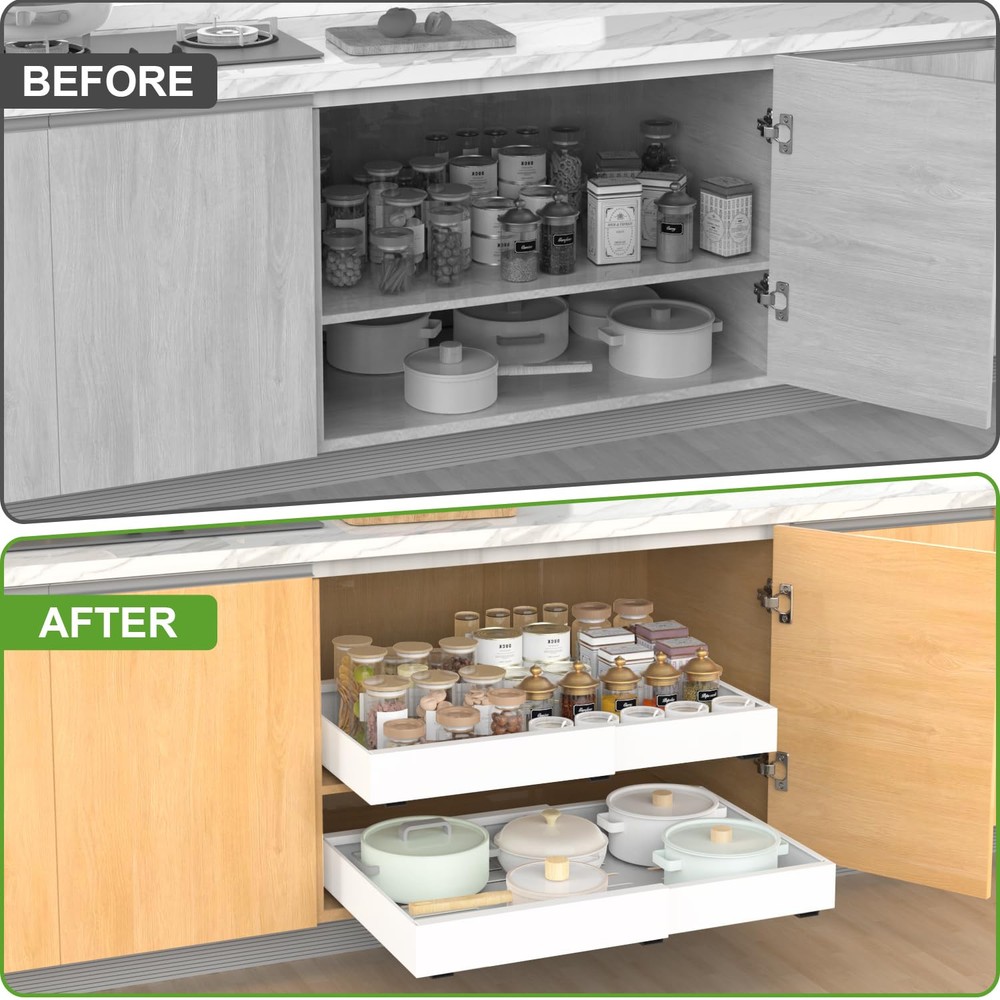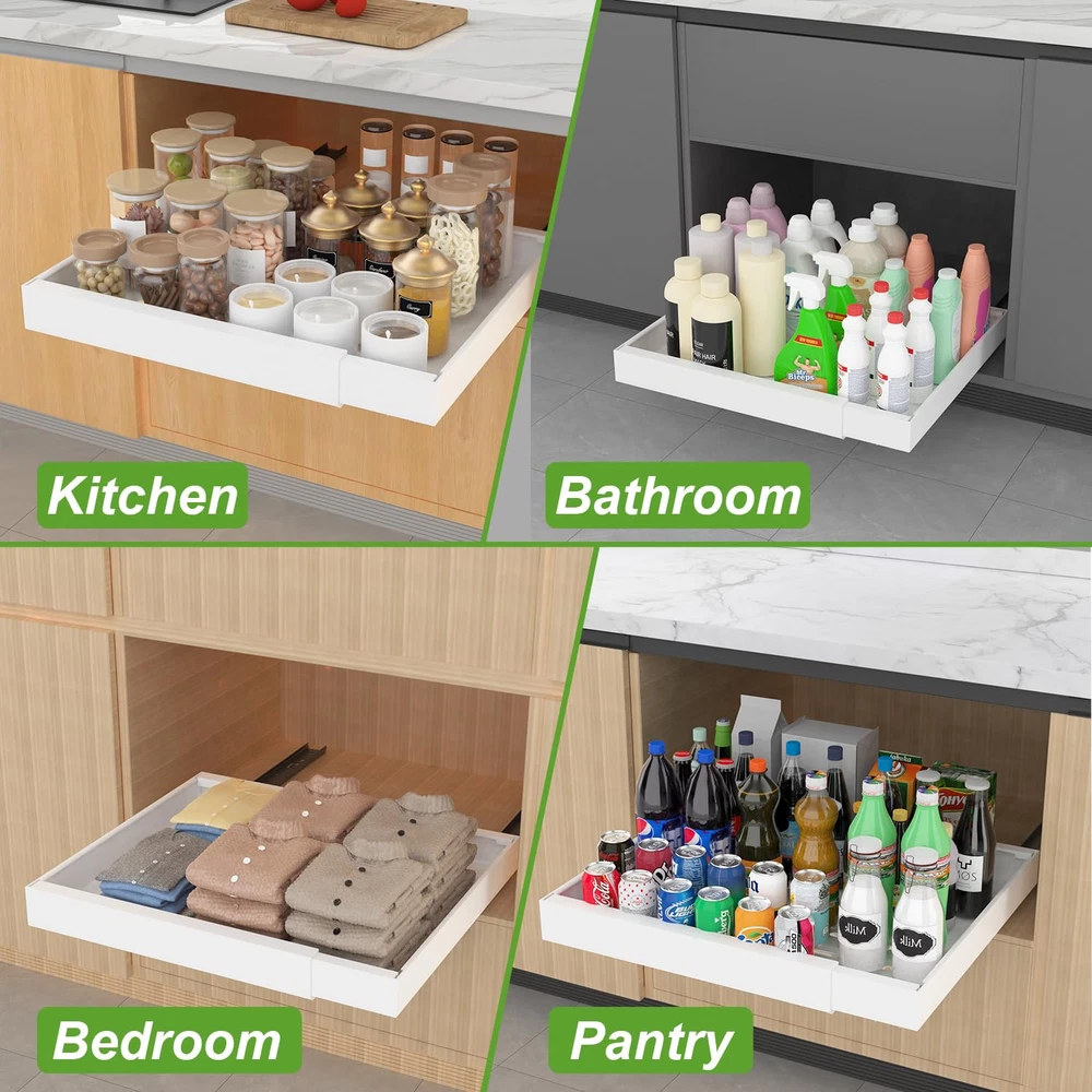 IMPORTANT NOTES: Please measure the size of the cabinets in your home before purchase, and select the corresponding product size according to the cabinet size. This product is not suitable for framed cabinets. CUSTOMIZABLE WIDTH: Pull Out Cabinet Organizer, featuring an adjustable width range from 12.2 inches to 20.5 inches. This customizable design ensures compatibility with any cabinet size, offering tailored storage solutions for pots, pans, bowls, spices, canned goods, and more. MAXIMIZE EVERY INCH OF SPACE: Product dimensions: 16.5 inches deep, width adjustable from 12.2 inches to 20.5 inches, height 2.75 inches. Our pull-out shelves optimize cabinet real estate, providing easy access to items buried in the depths. Keep your kitchen efficient while maximizing storage potential. UPGRADE 3Pcs STRONGER RAILS: Engineered from premium-grade metal with precision damping rail guides, tested for over 40,000 cycles, it delivers seamless opening and closing, guaranteeing a serene kitchen ambiance every time. 3 sliding rails, stronger bearing capacity, will not sag deformation, more reliable. SLIDE OUT DRAWERS: The best feature is extendable slide rails. Maximum pull-out length: 9.8 inches. This means that you have access to every inch of the drawer space. Cabinet drawers slide out is quiet when you pull it out and it slides out very smoothly, even when loaded with heavy pots, pans, or canned goods. NO NEED DRILL AND NAIL: The kitchen cabinet organizers contains detailed instructions, easy to install, no need to drill & nail, you could finish the installation in 10S. CUSTOMER SERVICE: Count on us for outstanding post-purchase assistance. Don't hesitate to reach out via email if you need assistance.