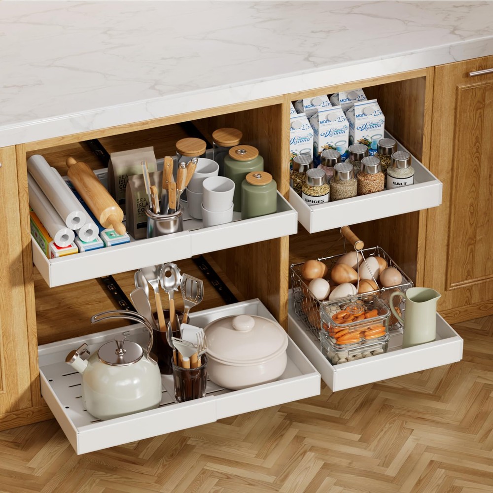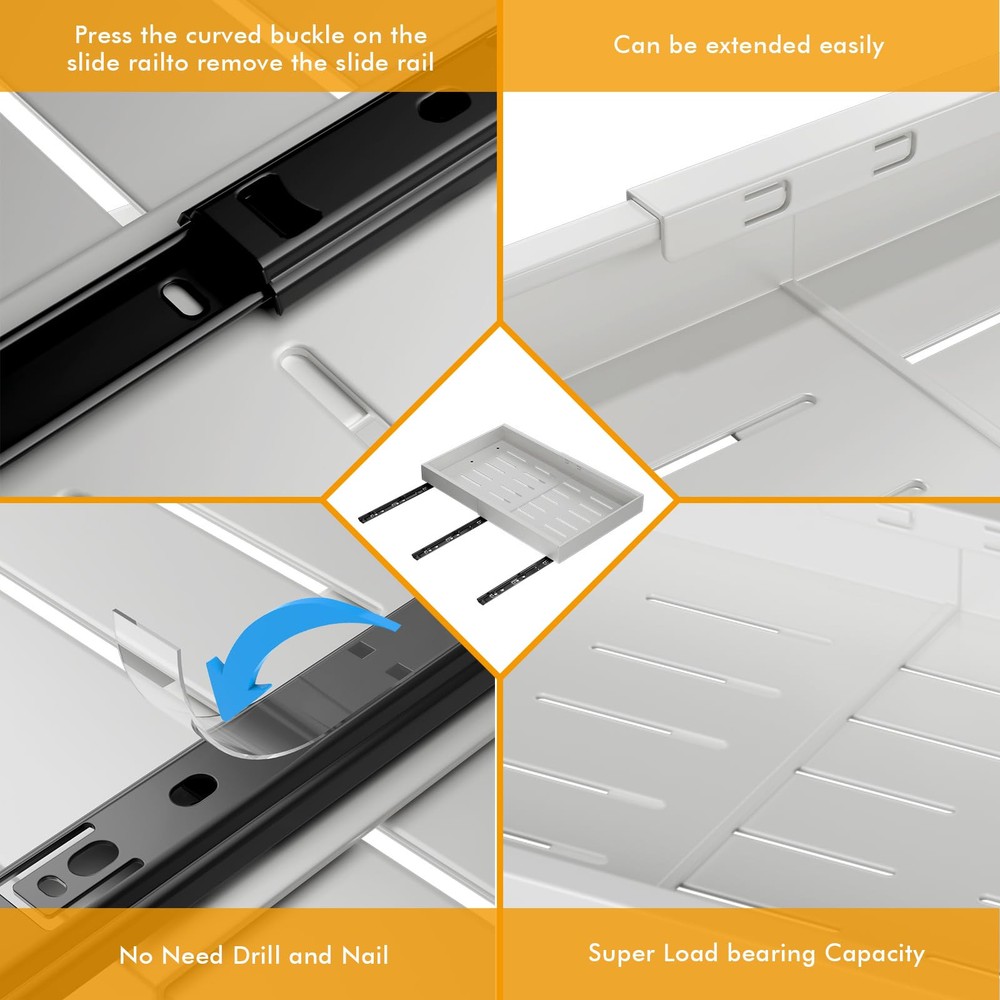 Expandable Drawer: The PXRACK pull out cabinet drawer organizer with an extendable design can be adjusted to fit different kitchen cabinets. It measures 17" d *2.3" h, and from 12.6" to 20.5" in width. Therefore, you can just adjust the slide out drawers for kitchen cabinets base as you need. Please measure the size of the cabinets in your home before purchase, and select the corresponding product size according to the cabinet size. Easy Installation: The pull out drawers for cabinets contain detailed instructions, easy to install, no need to drill & nail, and just follow the manual, you can finish the installation in 10S. Perfect for your kitchen, bathroom, under sink and pantry storage organizing. Heavy-Duty: The slide out drawers for kitchen cabinets are made of heavy-duty metal with an extra smooth sliding system to accommodate a large number of pots and pans, placing glides beneath the drawers, and not on the sides, maximizes every inch of your valuable cabinet space while providing a sleek and seamless look. Smooth and Quiet Slides: Our sliding drawers for cabinets designed with damping guide rails, and damping guide rails have been tested by many times of opening and closing. Our slide out cabinet organizer slides out all the way, providing you with easy access, it can slide smoothly without unpleasant noise. Slide Out Drawers: Organizing your cabinet space just got easier with the cabinet pull out shelves, you can make the most of cabinet space and easily access all your pots, pans, small kitchen appliances, cleaning products, canned goods, and other items.