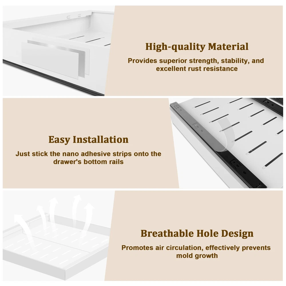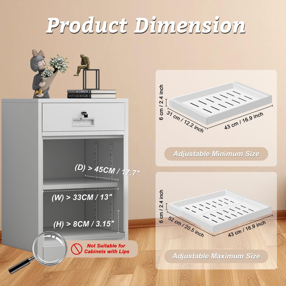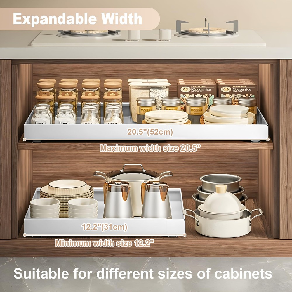 3 Track Expandable Drawer Organizers: Our pull out cabinet drawers features an advanced telescopic design with a 3-rail system, offering stronger load-bearing capacity compared to traditional 2-rail systems; The unique smooth cushioning track design ensures a quieter and smoother user experience Size & Compatibility: 12.2" to 20.5" Expandable Width, 17" Depth, 2.36" Height, slide out cabinet organizer with adjustable width optimizes cabinet space utilization, offering a more convenient retrieval experience; To ensure compatibility, please note that this drawer is suitable for cabinets with a width greater than 22" and a depth greater than 18"; This product is not suitable for framed cabinets No Need to Drill or Nail: Our pull-out home organizers don't require tedious drilling or screwing; Simply tear off the protective film on the 3 nano adhesive strips, stick them onto the 3 guide rails, and then insert the drawer into the cabinet, saving time and effort Heavy Duty and Easy to Clean: The expandable slide out drawer is made of durable carbon steel, which is sturdy and long-lasting; The surface is coated with high-quality paint, making it rust-proof; Easily clean with a damp cloth, and the hole design promotes air circulation Multi-Functional Storage Cabinet: This cabinet pull out shelves is suitable for various places such as the kitchen, bathroom, office, bedroom, pantry, and living room; It can store a variety of items, including spices, cookware, toiletries, clothing, and snacks, helping to create an organized and orderly space Tips: The nano adhesive strips are highly sticky, so please ensure the roll out drawer's pull-out side is facing outwards before installation; We have attached installation guide arrows on the pullout drawer surface to assist you; If you need any additional help, we will provide an excellent solution