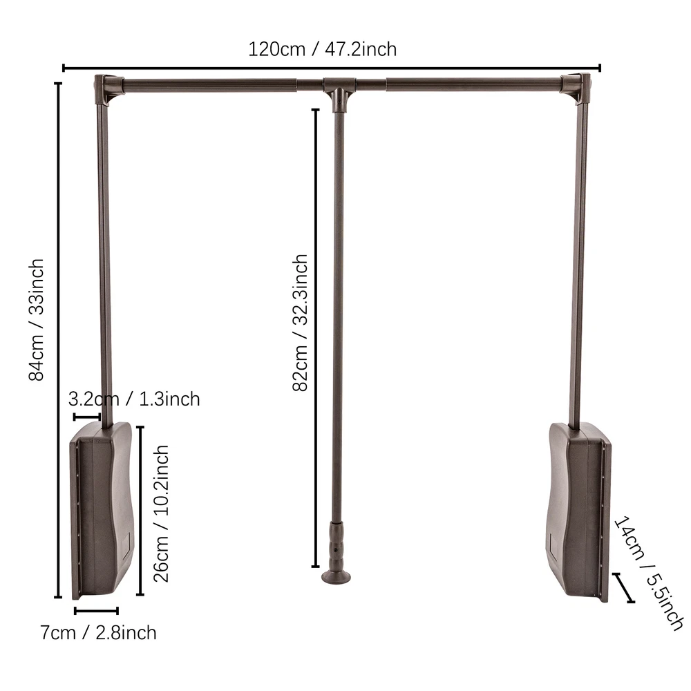 Wardrobe Organizer Garment Rack Clothes Shelf Metal Pull-down Clothes hanging ✔PRODUCT SIZE:The cross bar can stretch 35-47.2inch (89-120cm). It can be determined according to the width of your wardrobe. The interior height of the closet must be greater than 34.65inch (88cm) for installation. ✔USEFUL ADDITION TO ANY CLOSET: Polished Chrome Soft-close Expanding Wardrobe Lift. ✔ADJUSTABLE LENGTH: The length of the crossbar can be adjusted to meet your needs. A soft close damper is provided to ensure that the lift is gently pulled down. ✔DURABLE AND LONG LASTING: Constructed of aluminum alloy with plastic housing and handle. Rated for a weight capacity for up to 55 lbs. ✔HIGH QUALITY DESIGN: thickened arc support,dust-proof design, safety protection. Product Description: Material: aluminum alloy+plastic Color: coffee - The cross bar can stretch 35-47.2inch (89-120cm). - Simple pull-down clothes hanger,55 lb Weight Rating. - Width adjustable to fit a wide range of openings. Unique Twist and Lock Adjustable Pole with Ergonomic Handle. - Soft-close bumper for smooth operation. Mounting Brackets Allow for Easy Install and Clean Finished Look. Hidden mounting screws.
