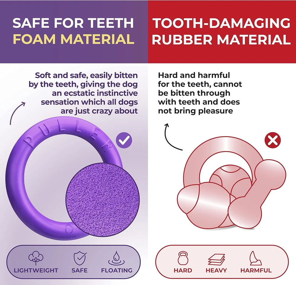 Multifunctional Dog Toy - PULLER is more than just a dog ring toy. Use it to fetch, tug of war and water games. It is a great alternative to dog balls, floating dog toys, frisbee for dogs. Improve Bonding With Your Dog - It is no longer possible to stay disconnected when the game is so engaging for both you and your dog! PULLER will truly make you best friends with your pet. Safe for Teeth Unique Material - PULLER is soft enough and the dog does not injure the teeth and jaws when biting. PULLER is made of non-toxic and odorless material. Thus, the dog focuses on the game but not on the smell. Increase Play Drive - Due to its unique features, PULLER easily engages your dog in play. An extremely fun activity with PULLER dog training toy motivates your dog to listen to you and pay attention. Improve Your Dog's Health - Exercises with PULLER (Running, Jumping, Pulling) provide a daily fitness workout for your dog. 20 minutes of play with PULLER will give your dog the same activity as running 5 miles. Product Description During exercises with PULLER, the dog keeps track of the owner’s actions, and the owner’s proposed action script. The program of contact exercises is created by professional trainers and is easily applicable by any owner. Constant exchange of PULLER rings and effect of cooperation in a tandem of owner + the dog is motivating a pet in the best way for ardor and positive activities. During interactive sessions with a set of 2 rings, PULLER develops better understanding between the owner and the dog. This comfort in the owner’s communication with the dog later appears in everyday life. It’s a new level of communication! Thanks to the picked-up comfortable set of exercises and a set of two PULLER rings, the dog doesn’t lose interest during the exercises, and vice versa, is increasingly anyway in the process. This kind of excitement only adds the positive effects to the exercises. The dog fitness tool PULLER became Fetch Toy Product of the Year in the Toys Category of Pet Innovation Awards – the US independent platform for innovations in the pet industry. PULLER provides full emotional and physical load for dogs, strengthens the bond between dog and owner and helps them both to keep themselves fit. Also, the exercises with PULLER are basic for two disciplines of Dog Puller – the international dog sport. Dog Puller is a sport where everyone – disregarding of age, physical readiness and breed of the dog – can participate. Just a few exercises for 20 minutes will give the dog the training and activities of 5 miles of running! In the urban conditions, most dog owners face a problem of insufficient walking with the pet. As a result, dogs suffer from lack of physical and emotional activity, and pets have problems with obesity and chronic diseases. Often the dog begins to suffer neurosis, which is manifested in the fact that it can spoil the furniture or furnishings while the owner is away from home, or even may be aggressive towards both owner’s family and the owner himself. PULLER was developed by professional cynologysts as an innovative training shell for dogs. A special set of two purple PULLER rings and a set of exercises with it will provide daily interactive training for dogs and all the necessary physical activities, so the dog owner doesn’t have to spend a lot of time on walking. During the Fetching, a particularly most of activities comes on neck and shoulder when the dog tries to catch a ring in the air or rolling on the ground. As this exercise includes not only jumps, but also catching of a ring with teeth and interception from one ring to another, the neck and shoulders receive full-fledged and maximum of possible activities. The dog gets the maximum activities, especially if tosses by neck during the pulling. This develops strength and endurance, and also allows splash out the accumulated overpowered energy. One of the most important exercises, which is not only to load the whole dog’s hull, but also to do it in a benign therapeutic mode. Recommended for dogs of any age.