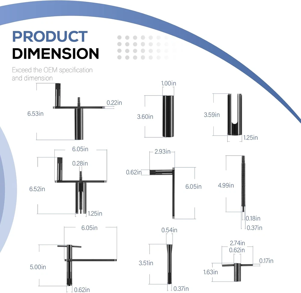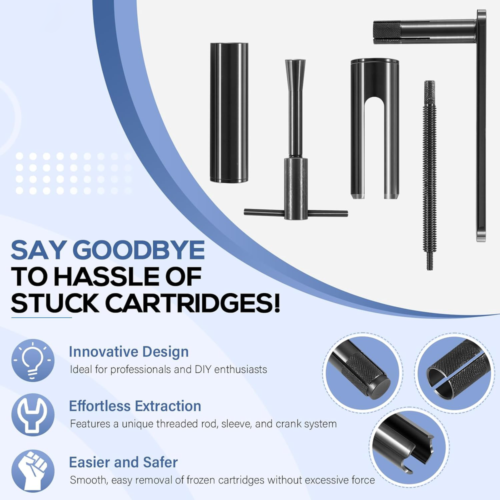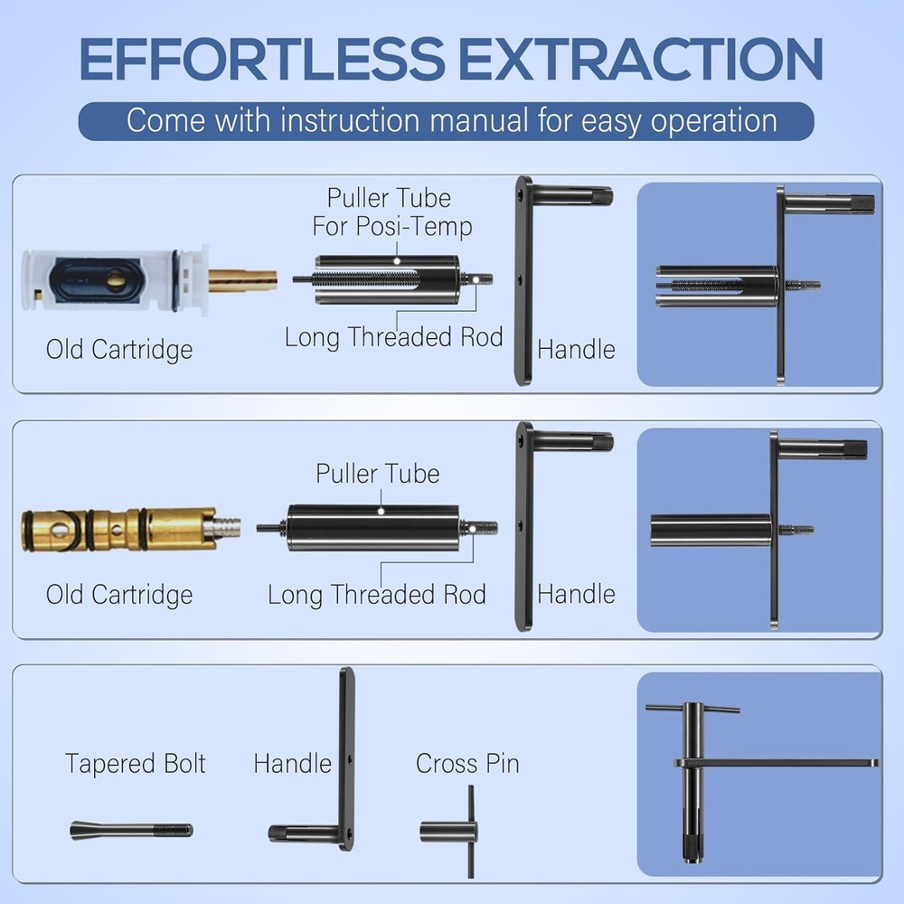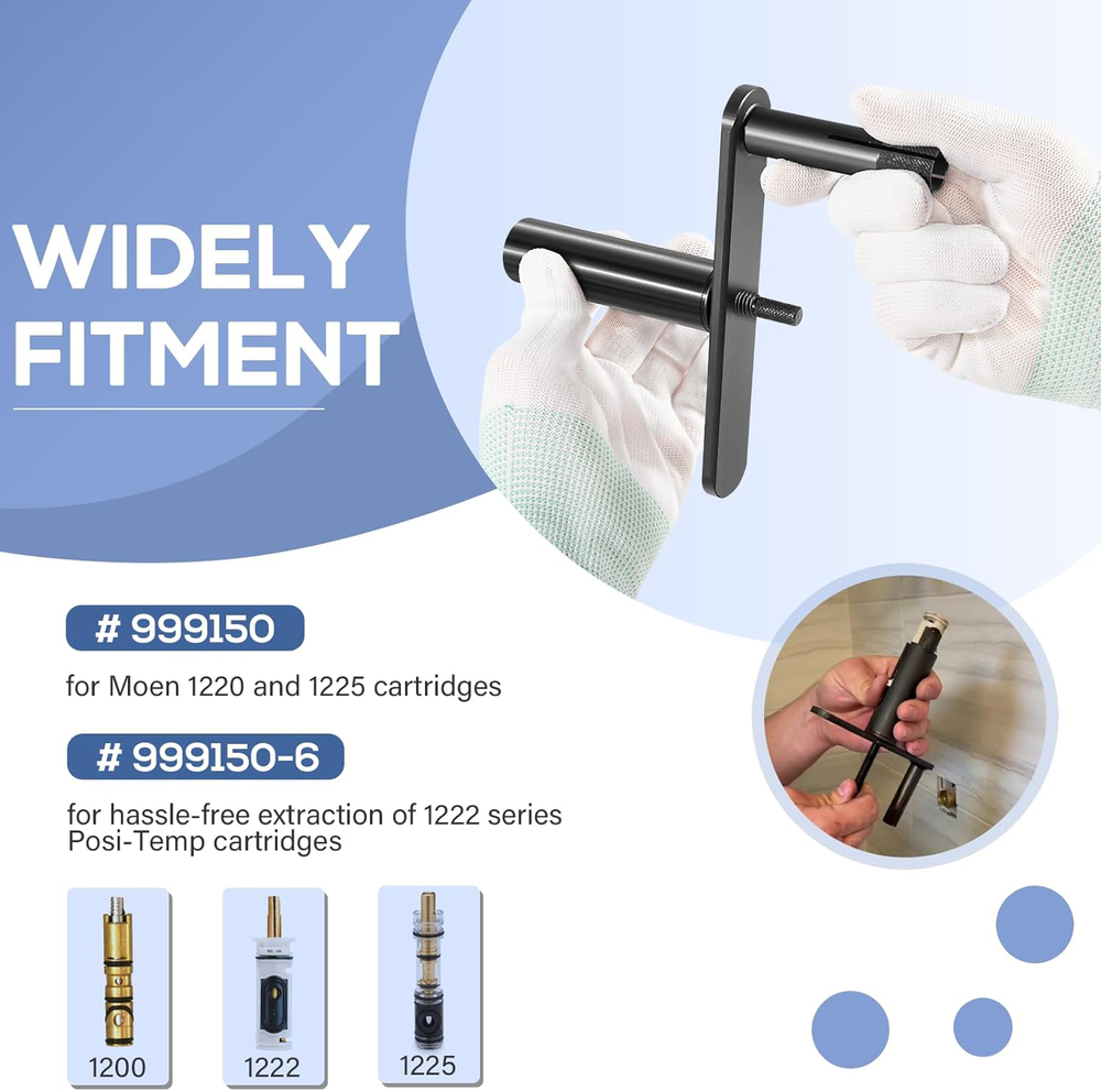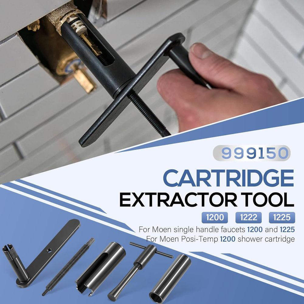 Puller Premier For Moen Cartridge Extractor Tool Posi-Temp 1222, 1225 and 1200 Features: Widely Fitment -- 999150 Shower cartridge puller tool fits for Moen single handle faucets 1200 and 1225, for Moen Posi-Temp 1200 shower cartridge. Innovative Design -- Features a unique threaded rod, sleeve, and crank system that eliminates the need for brute force, making the extraction process easier and safer for your plumbing fixtures. Effortless Extraction -- Say goodbye to the hassle of stuck cartridges! Designed for repeated use by professionals, our cartridge extractor tool allows for smooth, easy removal of frozen cartridges without excessive force. Jaga-tools In Search of Excellence! Puller Premier For Moen Cartridge Extractor Tool Posi-Temp 1222, 1225 and 1200 Puller Premier For Moen Cartridge Extractor Tool Posi-Temp 1222, 1225 and 1200 Features: Widely Fitment -- 999150 Shower cartridge puller tool fits for Moen single handle faucets 1200 and 1225, for Moen Posi-Temp 1200 shower cartridge. Innovative Design -- Features a unique threaded rod, sleeve, and crank system that eliminates the need for brute force, making the extraction process easier and safer for your plumbing fixtures. Effortless Extraction -- Say goodbye to the hassle of stuck cartridges! Designed for repeated use by professionals, our cartridge extractor tool allows for smooth, easy removal of frozen cartridges without excessive force. Comprehensive Kit -- Cartridge removal kit includes model # 999150 for Moen 1220 and 1225 cartridges, and model # 999150-6 designed for hassle-free extraction of 1222 series Posi-Temp cartridges. Excellent Quality -- Constructed from premium steel and finished with coating to prevent corrosion, rust and oxidation. Hardened construction offers high strength and impact resistance for long service life. Package Included: 999150 Shower Cartridge Removal Tool Item Specifics Brand JT-Motor Type Shower Cartridge Extractor Tool MPN 999150 Warranty 1 Year Material Stainless Steel Features Easy installtion Item Weight ‎ 2 pounds Color Black Set or dingle item Set Batteries Included No Batteries Required No Number in Pack 5 Payment Returns Jaga-tools In Search of Excellence! DESCRIPTION PAYMENT SHIPPING RETURN POLICY Puller Premier For Moen Cartridge Extractor Tool Posi-Temp 1222, 1225 and 1200 Puller Premier For Moen Cartridge Extractor Tool Posi-Temp 1222, 1225 and 1200 Features: Widely Fitment -- 999150 Shower cartridge puller tool fits for Moen single handle faucets 1200 and 1225, for Moen Posi-Temp 1200 shower cartridge. Innovative Design -- Features a unique threaded rod, sleeve, and crank system that eliminates the need for brute force, making the extraction process easier and safer for your plumbing fixtures. Effortless Extraction -- Say goodbye to the hassle of stuck cartridges! Designed for repeated use by professionals, our cartridge extractor tool allows for smooth, easy removal of frozen cartridges without excessive force. Comprehensive Kit -- Cartridge removal kit includes model # 999150 for Moen 1220 and 1225 cartridges, and model # 999150-6 designed for hassle-free extraction of 1222 series Posi-Temp cartridges. Excellent Quality -- Constructed from premium steel and finished with coating to prevent corrosion, rust and oxidation. Hardened construction offers high strength and impact resistance for long service life. Package Included: 999150 Shower Cartridge Removal Tool Payment Returns All rights reserved.