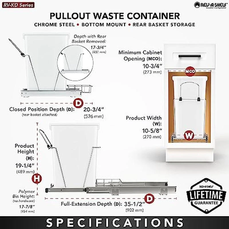 You may also like Plastic Swing Top Trash Can 13 Gallon Durable Wastebasket Ideal Home Office New 23.25 USD 24.47 USD Free shipping 5% off StepOn Wastebasket 11.9Gal Plastic Space Efficient Kitchen Bathroom Indoor Use 27.35 USD 28.79 USD Free shipping 5% off 13-Gal Drawstring Trash Bags 120ct Strong Flex Fresh Scent Odor Control New 24.54 USD 25.83 USD Free shipping 5% off Motion Sensor Trash Can 13 Gallon Touchless Operation Soft Close Durable Plastic 36.88 USD 38.82 USD Free shipping 5% off Slim Stainless Steel Step Trash Can 7.9 Gallon Touchless Quiet Lid Indoor Use 43.08 USD 45.35 USD Free shipping 5% off Touch Top Trash Can 13.3 Gallon Slim Kitchen Waste Bin Durable Plastic 2 Pack US 34.46 USD 36.27 USD Free shipping 5% off Plastic Step-On Trash Cans Receptacle Anti Slip Base Wastebaskets Garage 17 Gal 87.97 USD 92.6 USD Free shipping 5% off 7.6 Gallon Touch Top Kitchen Trashcan Durable Plastic Wastebasket Indoor Use 20.59 USD 21.67 USD Free shipping 5% off 20 Gallon Heavy Duty Garbage Can W/ Lid Click Lock Black 22.25" x 20" x 25.38 US 23.65 USD 24.89 USD Free shipping 5% off Stainless Steel Trash Can W/ Sturdy Foot Pedal Kitchen 20 Gal Anti Slip Base Hot 83.88 USD 88.3 USD Free shipping 5% off 10.25 Gallon Plastic Trash Can Wastebasket Space Efficient Easy Clean Indoor Use 22.43 USD 23.61 USD Free shipping 5% off Plastic Step Trash Can 13 Gallon Touchless Lid Kitchen Office Waste Bin New 42.47 USD 44.7 USD Free shipping 5% off About this item Rev-A-Shelf Pullout Waste Container: Keep your kitchen waste and recycling container hidden but easily accessible with this single 35-quart pullout waste container system Trash Can Specifications: Dimensions (W x D x H): 10. 46"W x 22"D x 19. 25"H; Designed for base cabinets with 11. 5-to 15-inch opening Smooth Gliding Trash Can: Built with a chrome-plated heavy-gauge wire construction frame that effortlessly slides in and out on full-extension, ball-bearing, 100-pound rated slides Easy Install Waste Bins: Easy to install; Includes: (1) silver 35-quart waste container, (1) metal frame, (1) pair of slides, and mounting hardware Rev-A-Shelf Difference: A global family-owned company offering holistic, convenient, stylish, and smart organization and storage solutions for kitchens, baths, closets, and whole homes since 1984 Brand Rev-A-Shelf Capacity 35 Quarts Color Chrome Opening Mechanism Pull-Out Material Steel Recommended Uses For Product Kitchen Room Type Kitchen See more You may also like 9-Piece 1/2 Inch Drive Impact Socket Set Cr-V Steel Color Coded Sockets New 23.28 USD 24.51 USD Free shipping 5% off Plastic Swing Top Trash Can 13 Gallon Durable Wastebasket Ideal Home Office New 23.25 USD 24.47 USD Free shipping 5% off 19 Piece 1/4 Inch Drive Ratchet Socket Set Automotive Tool Kit Precision Repair 23.15 USD 24.37 USD Free shipping 5% off 10.25 Gallon Plastic Trash Can Wastebasket Space Efficient Easy Clean Indoor Use 22.43 USD 23.61 USD Free shipping 5% off 1-Week 1-Person Emergency Food Supply Survival Breakfast Lunch Dinner Dorm Room 77.57 USD 81.65 USD Free shipping 5% off 4-Shelf Storage Shelves Shelving Rack Organizer Heavy Duty Garage Closet Plastic 36.93 USD 38.87 USD Free shipping 5% off Removable Dock Ladder 500lbs Adjustable Height Easy Detach Pool Boat Anti Slip 65.73 USD 69.19 USD Free shipping 5% off 12 Pack Bucket Of 10U Official League CROLB Practice Youth Baseballs Sporting US 44.21 USD 46.54 USD Free shipping 5% off Rubber Door Mat Heavy Duty Non Slip Durable Wipe Clean Entryway Rug Indoor New 67.82 USD 71.39 USD Free shipping 5% off Multi-Color Hammock Chair Spreader Bar Indoor Outdoor Durable Breathable Picnic 53.16 USD 55.96 USD Free shipping 5% off 6 Pcs File Crate Milk Storage Bins Boxes Basket Stackable Office Plastic Black 36.74 USD 38.67 USD Free shipping 5% off Aquarium Internal Filter W/ Air Pump 3-Stage Filtration Debris Removal New 25.8 USD 27.16 USD Free shipping 5% off
