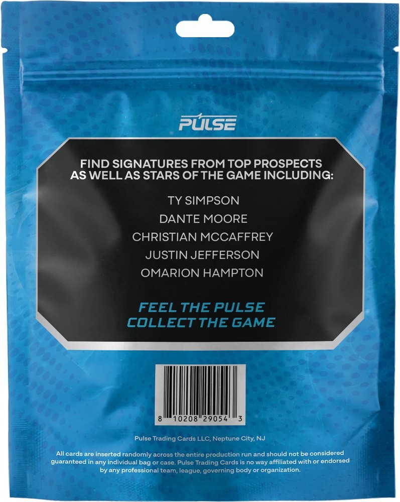 Pulse Football Mystery Pack ( 4 Autographs per Bag ) Ships FAST & FREE in the US Get ready for a must-have mystery drop! Each Pulse Football Mystery Pack delivers 4 encased autographed cards per bag, loaded with star power from some of the biggest names in the game. Chase autos from fan favorites like Ty Simpson, Dante Moore, Christian McCaffrey, Justin Jefferson, and many more top talents and future stars. Every rip is packed with excitement—perfect for collectors who love the thrill of the chase. High value. High energy. Pulse Certified. 4 Packs/bag Bag Break: 4 autographed encased cards per bag Look For: Autographs from legends in football and future stars of the game including Ty Simpson, Dante Moore, Christian McCaffrey, Justin Jefferson, and many more!