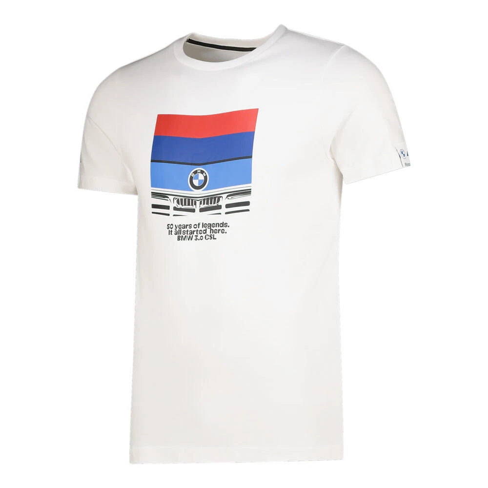 Bmw Mms Vintage Car Graphic Crew Neck Short Sleeve T-Shirt Product Details Regular Fit Crew neck Vintage racing-inspired graphic on front Bmw Mms logo on left sleeve PUMA Cat Logo on right sleeve Celebrate the vibrant heritage of Bmw Mms with this vintage tee. The racing-inspired graphic on the front throws it back to the BMW 3.0 CSL of the '70s, while official team branding fixes its eyes on the track ahead. Additional Details Color: White Occasion: Casual Gender: Mens Age: Adult Brand: Puma
