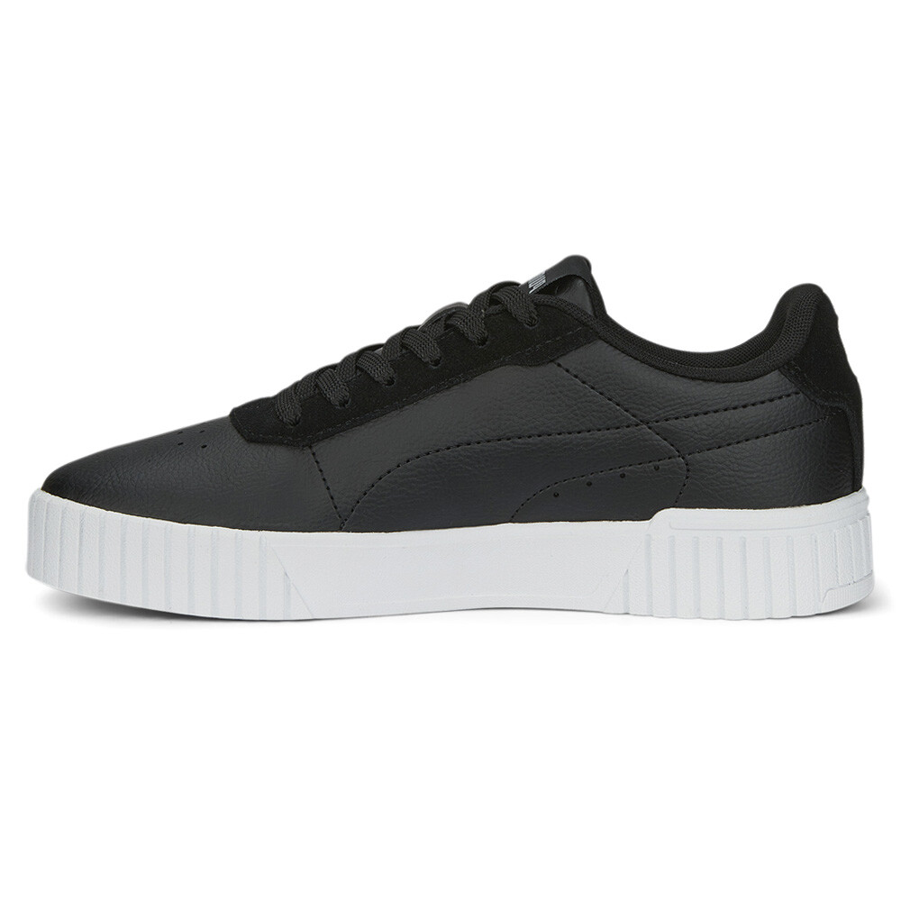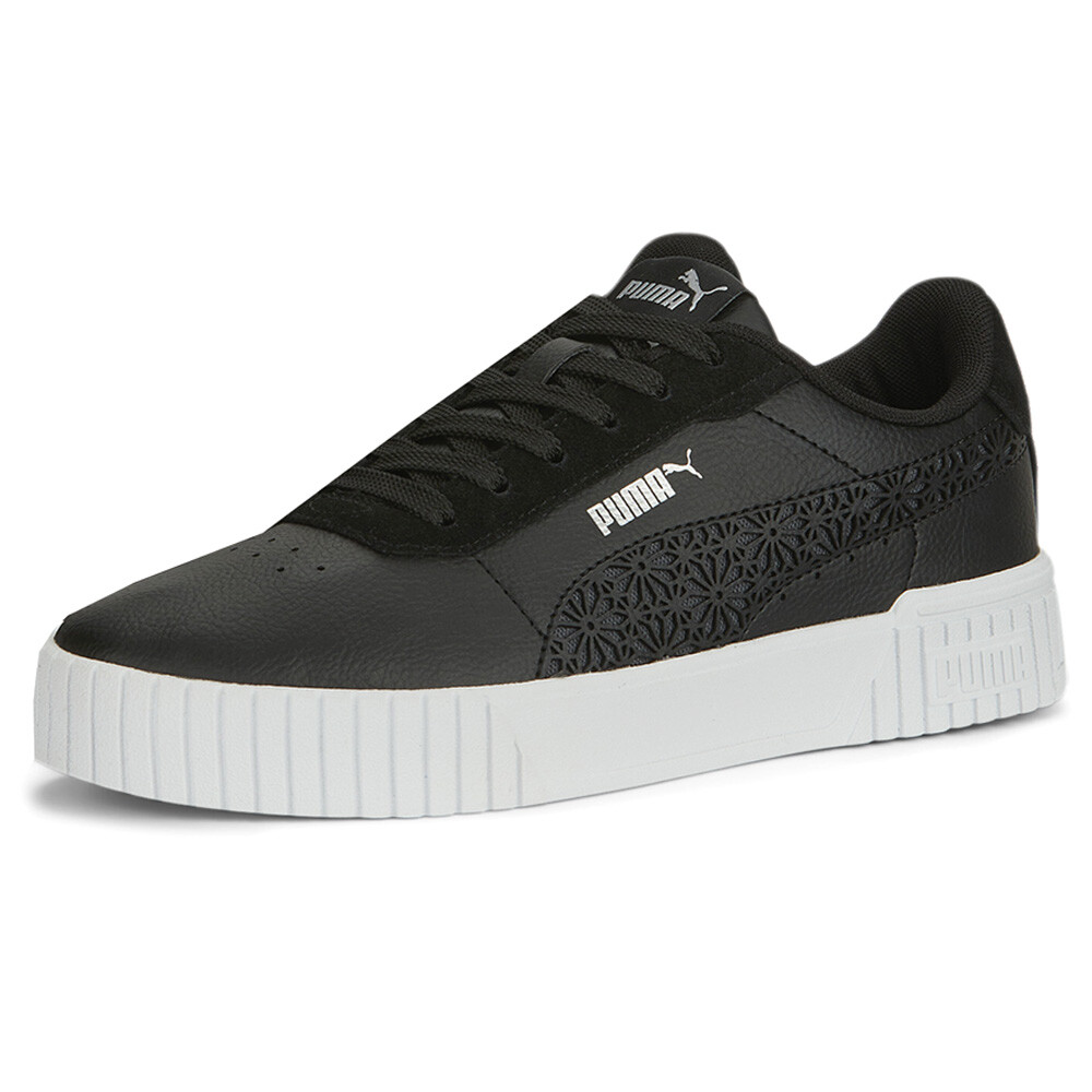 Carina 2.0 Laser Cut Lace Up Sneakers Product Details Leather upper Rubber midsole Rubber outsole PUMA Formstrip on the medial and lateral sides A refresh from the '80s archive, this version of the Carina dons some flowery laser cut details to freshen up the classic silhouette. Additional Details Color: Black Occasion: Casual Gender: Womens Age: Adult Brand: Puma