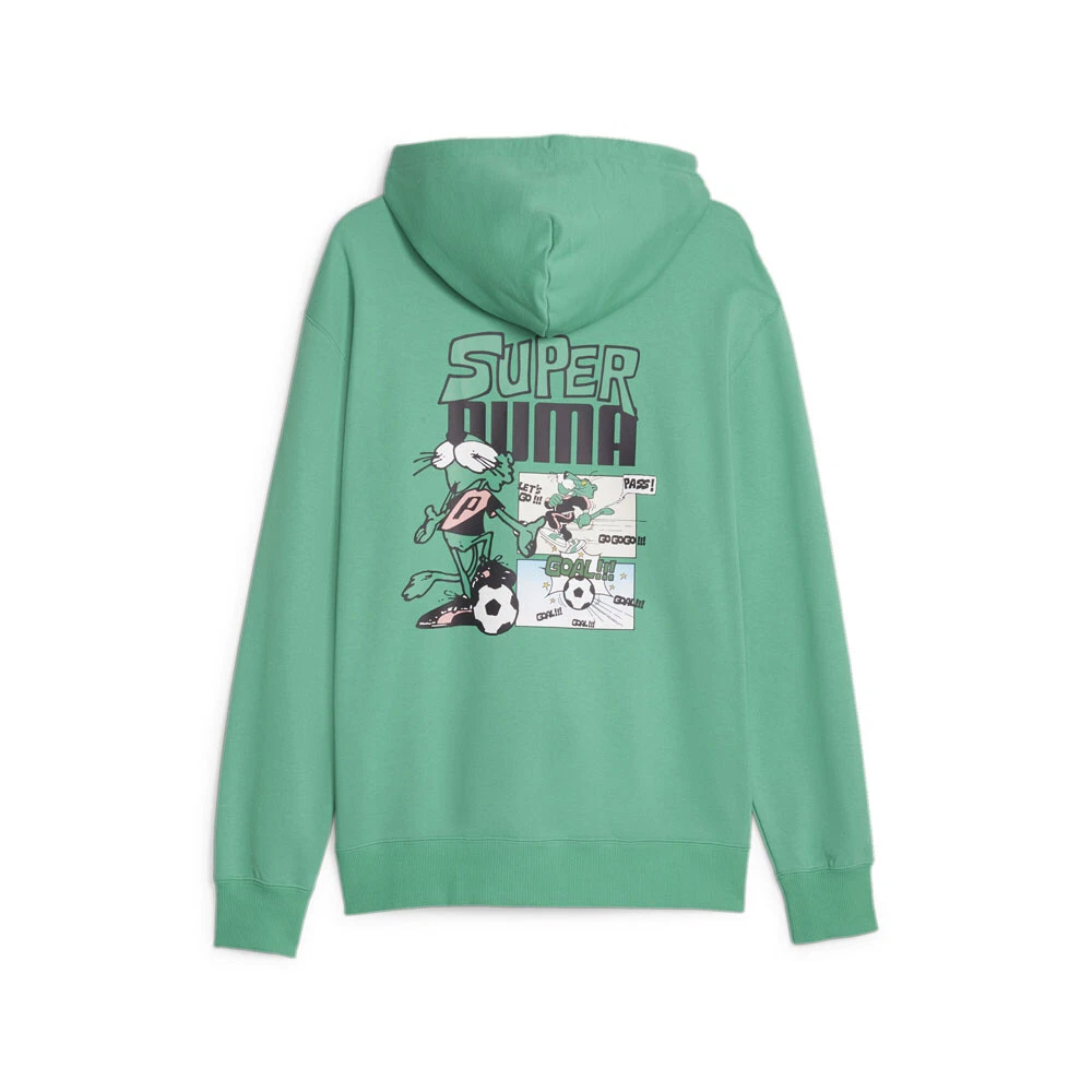 Classics Super Graphic Pullover Hoodie Product Details Regular Fit Crewneck with hood and drawcord for an adjustable fit Kangaroo pocket Ribbed cuffs and hem Graphic print on the front and the back Super PUMA, the eponymous hero from the '70s cartoons, is back to show off your love for football. Featuring a graphic print on the front and back, bold colors with lots of contrast, this classic hoodie offers comfort and impactful styling. Additional Details Color: Green Occasion: Casual Gender: Mens Age: Adult Brand: Puma