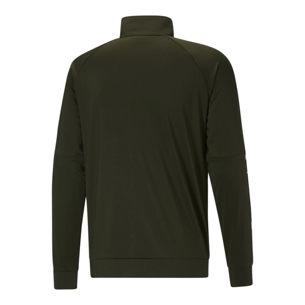 Contrast Blocked Camouflage Full Zip Jacket Product Details 100% Polyester Full zip Ribbed cuff/hem Stitched camouflage-blocking PUMA Cat Logo print on left chest The zip front track jacket features the Puma cat logo on the front and insets of camo color blocking matching pants available. Additional Details Color: Green Occasion: Casual Gender: Mens Age: Adult Brand: Puma