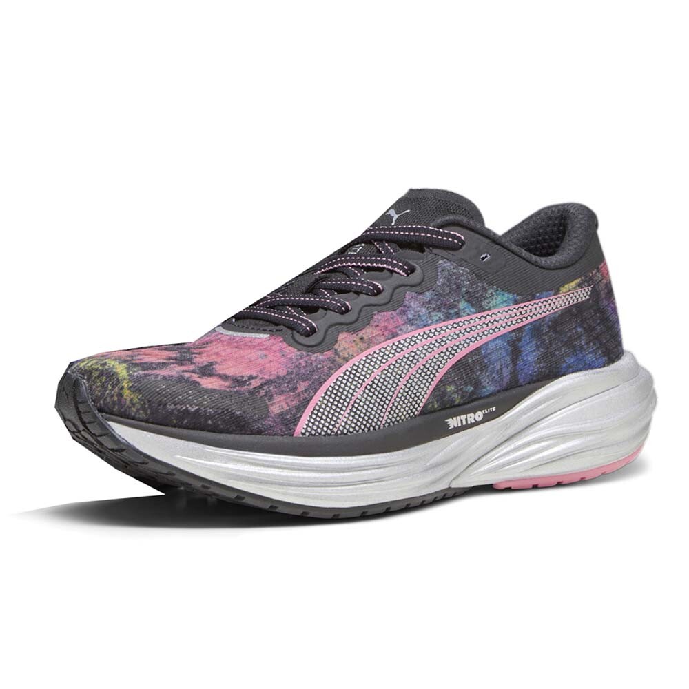 Deviate Nitro 2 Marathon Series Running Shoes Product Details Breathable engineered mesh upper Cushioned collar to reduce heel slip Mesh tongue Reflective design elements Thermoplastic Polyurethane heel spoiler The Deviate NITRO 2 – it's just like v1, only better. This 'Marathon Series' rendition of the shoe ticks all the boxes: max cushioning, max performance, to make going faster even easier. Starting with an updated NITRO foam for improved responsiveness, we've also outfitted the running shoe with an integrated carbon fibre PWRPLATE that will help you reach max propulsion from toe-off. We're finishing off with a reworked, cushioned collar to reduce heel slip, and a lighter, asymmetrical base that works better with your body to get you to the finish line. Additional Details Color: Black, Multi Occasion: Casual Gender: Womens Age: Adult Brand: Puma