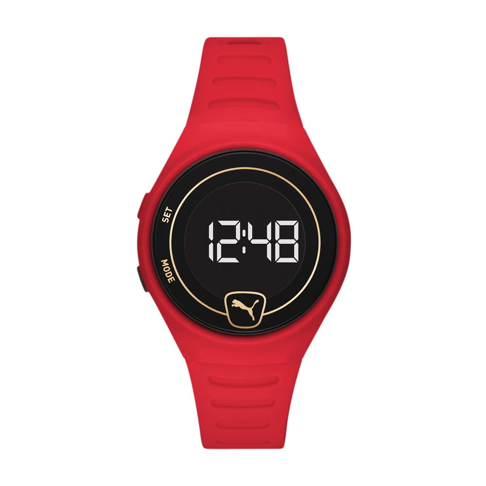 Faster Wh Red Waterproof Smart Watch Product Details 42MM Watch face Red polyurethane strap PUMA Cat Logo at face Stay right on track in this special edition Forever Faster Digital Watch. Featuring a negative digital display, soft, adjustable polyurethane strap and bold red color palette, this watch offers a streamlined, sporty look and feel. And the 3 ATM waterproof design means it can keep up with your everyday hustle. Additional Details Color: Red Occasion: Gender: Mens Age: Adult Brand: Puma