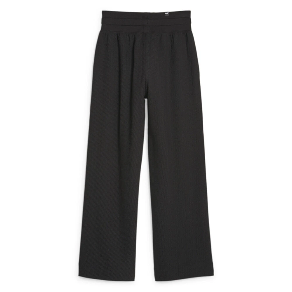 Her High Waist Straight Pants Product Details Elasticated waistband High waist Embroidered PUMA Cat Logo 57% cotton, 40% polyester, 3% elastane Inspired by Japanese street fashion, these straight-legged pants with decorative pleats are knitted, making them stretchier and easier to wear than jeans. The prominent waistband is elasticated and comes with external drawcords for a superb fit. Additional Details Color: Black Occasion: Casual Gender: Womens Age: Adult Brand: Puma
