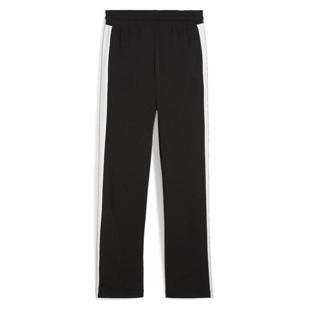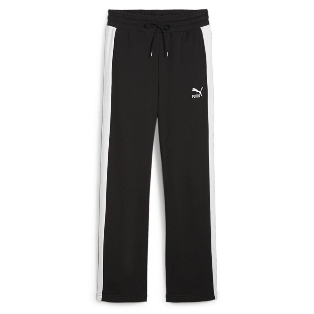 Iconic T7 Straight Leg Track Pants Product Details Comfort fit 280 grams per square meter, French terry material Elastic waistband with external drawcords Side pockets T7 panel inserts Straight out of the '70s Puma Archives, the T7 gets a fresh update, and this time the OG track pants have been reworked with a much more relaxed vibe. It features a looser fit than the OG track pants, and straight legs with open cuffs. Of course, the signature stripes are still on the sides. Additional Details Color: Black Occasion: Casual Gender: Womens Age: Adult Brand: Puma