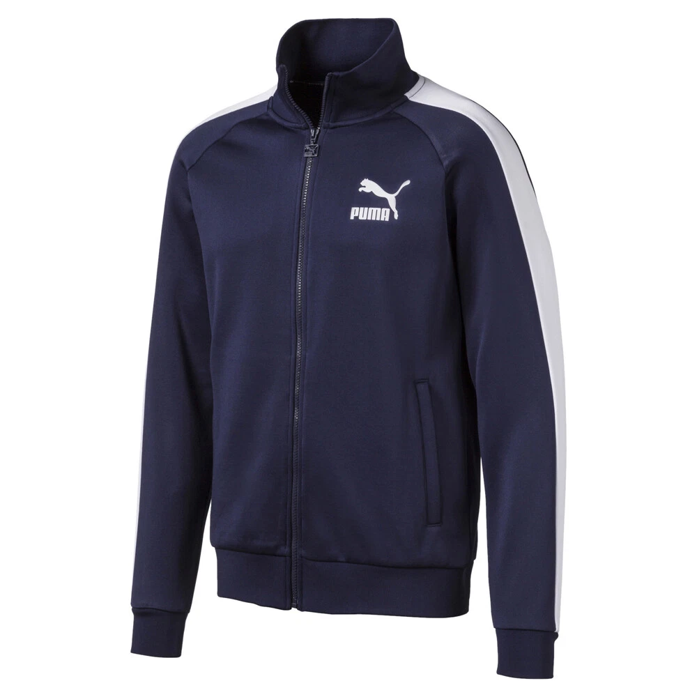 Iconic T7 Track Jacket Product Details Polyester and cotton Regular fit Full zip closure with stand-up collar Dual pockets T7 panel inserts at sleeves Fresh from the PUMA Archives, we’re bringing the T7 out of retirement to update the timeless style for modern streetwear. With the signature T7 stripes down the sleeves and a sleek fit, you'll bring the classics back with sophisticated style. Additional Details Color: Black Occasion: Athletic Gender: Mens Age: Adult Brand: Puma